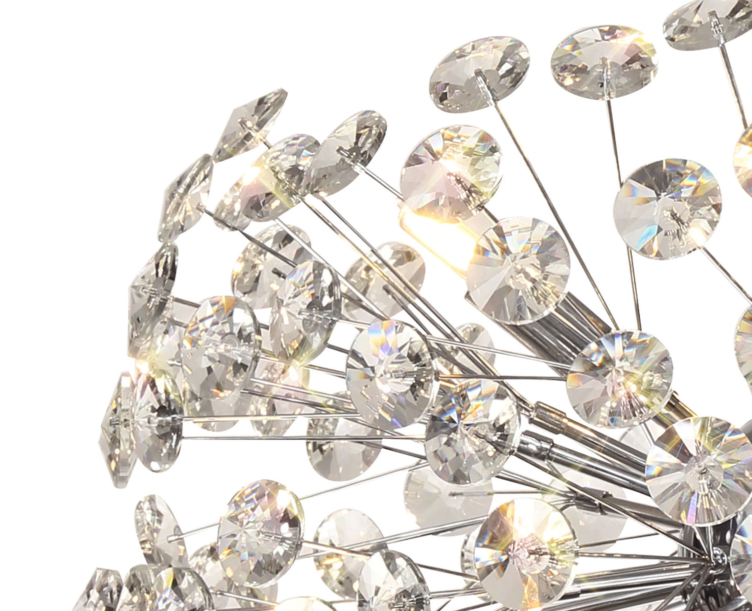 This beautiful comprehensive collection available in either a polished chrome or french gold colour finish, uses slim stems angled erratically to form an enchanting cluster of clear crystal disks. The lines of the central framework of round, tiered and oblong pendants, act as a base from which the crystals can sit around the G9 lampholders ensuring the light emitted from the chosen lamp refracts through each facette throwing sublime spectrums. An extensive range of products are available within the Bosona range, making it suitable for an array of applications.