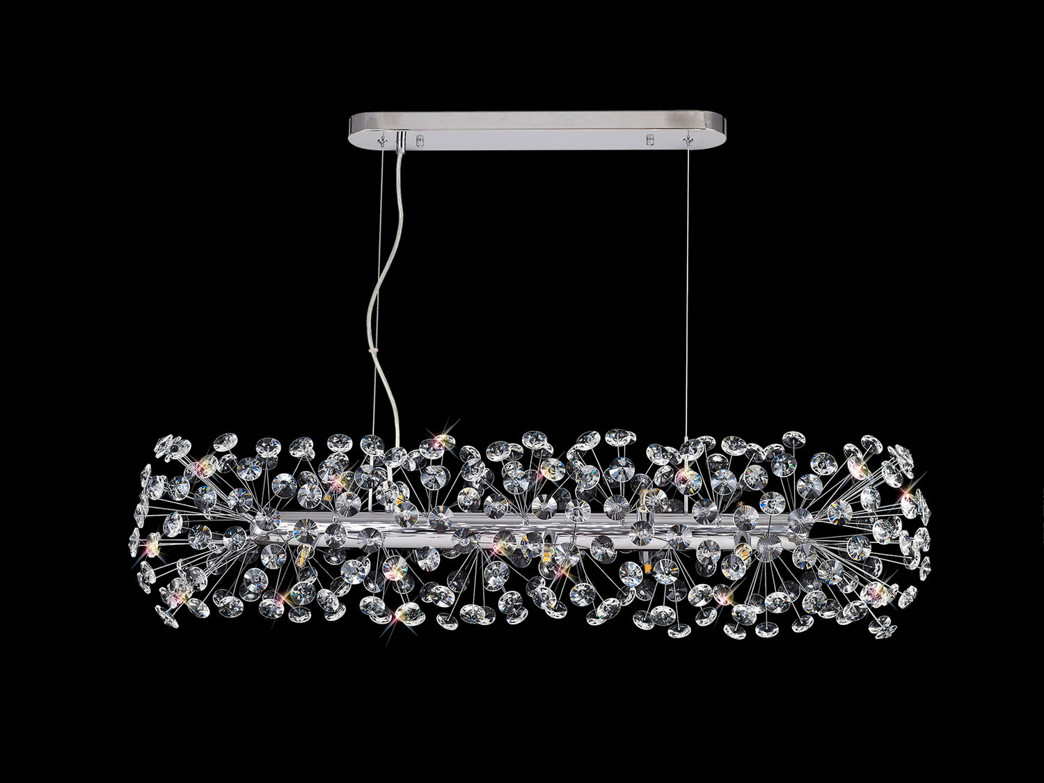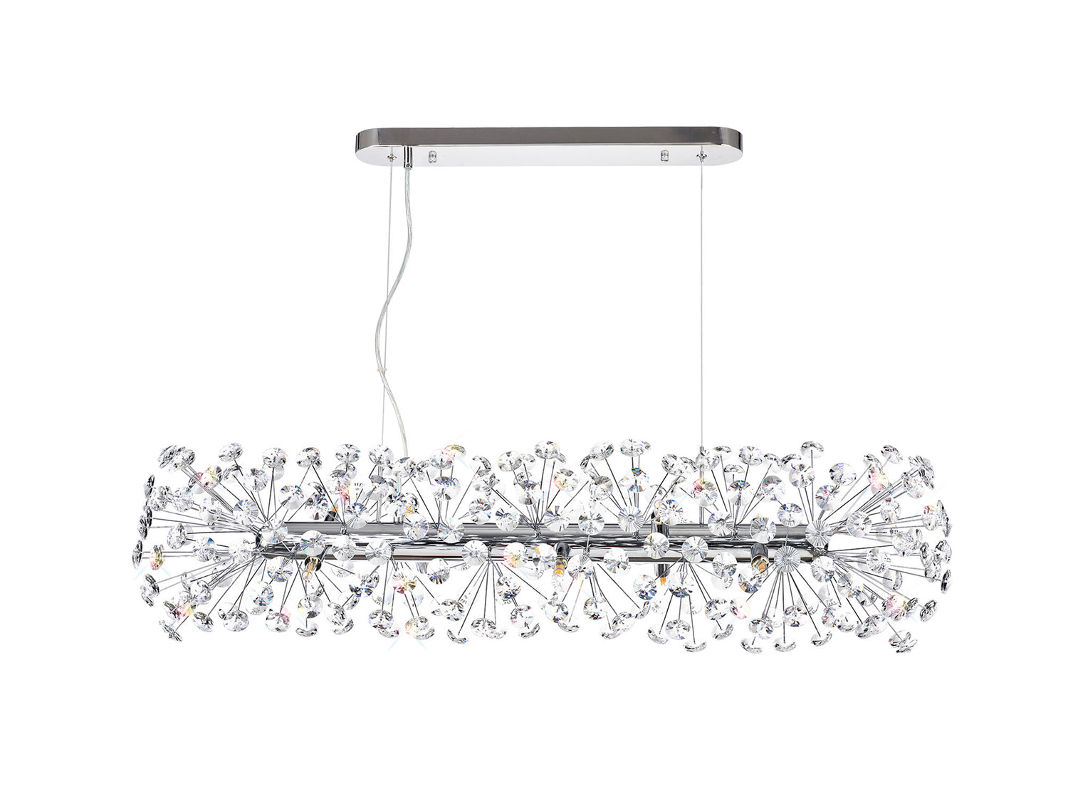 This beautiful comprehensive collection available in either a polished chrome or french gold colour finish, uses slim stems angled erratically to form an enchanting cluster of clear crystal disks. The lines of the central framework of round, tiered and Oblong Linear pendants, act as a base from which the crystals can sit around the G9 lampholders ensuring the light emitted from the chosen lamp refracts through each facette throwing sublime spectrums. An extensive range of products are available within the Beluga range, making it suitable for an array of applications.