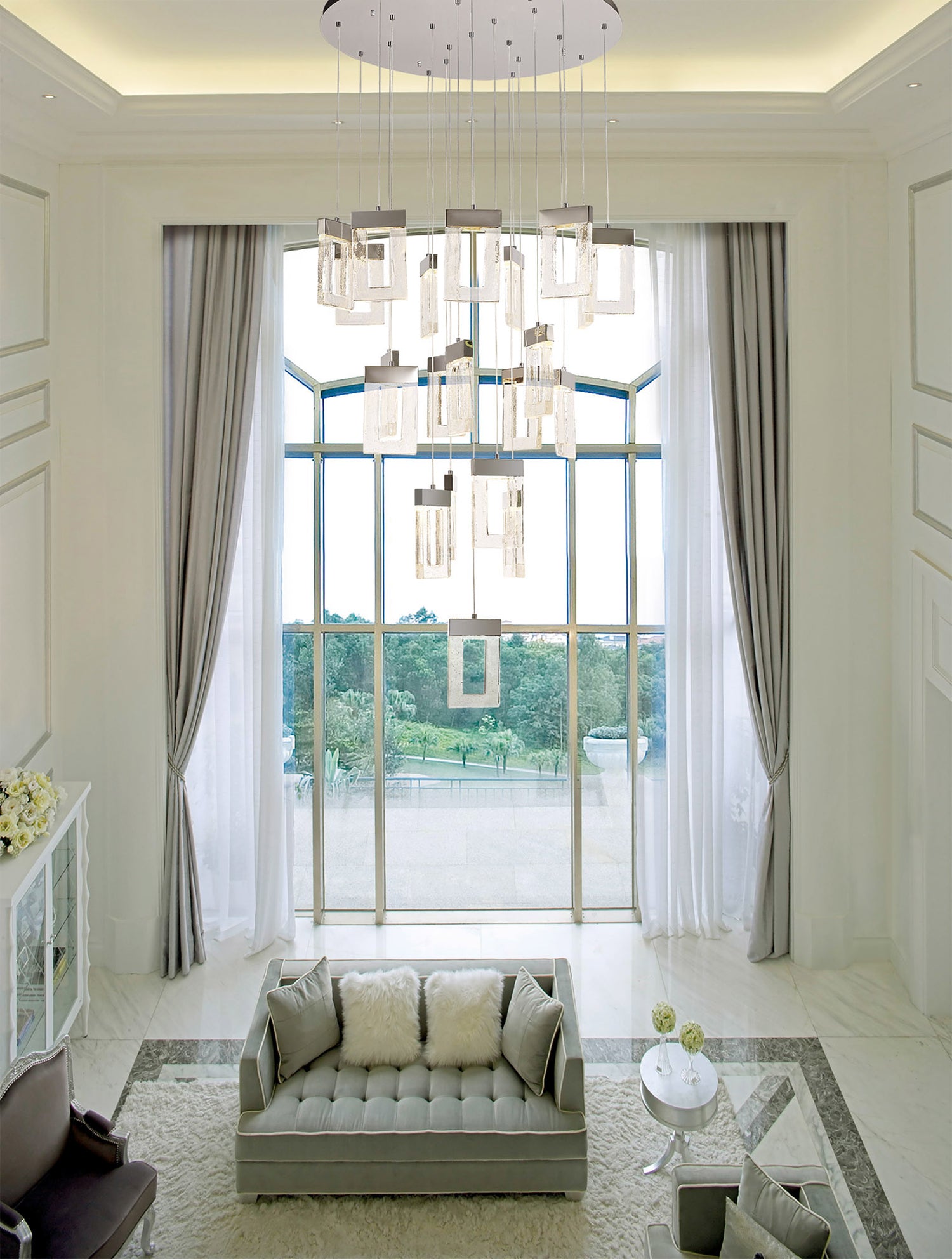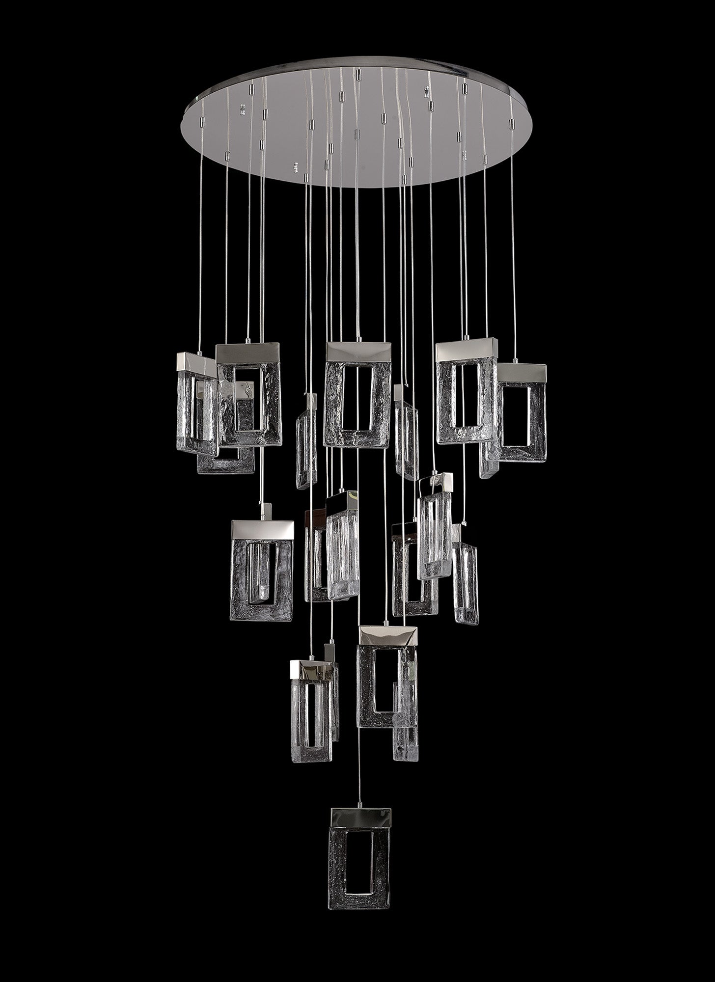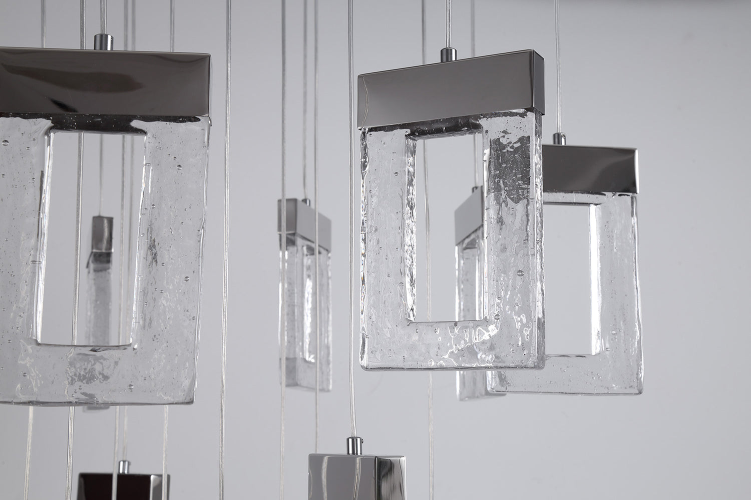 The Electra range includes a multiple LED pendant which hosts a combination of inventive design concepts boasting an individuality within the lighting market. Each drop sees a rectangular glass piece with a central cut-out, moulded to replicate frozen water. The glacial effect looks even more captivating when illuminated by the integral 3000K LEDs which are situated within the polished chrome cap above every glass. With a drastic maximum 5m drop this Electra piece will make a grand impact. Due to its popularity this range has been expanded to now include a single 2m pendant and complementing wall lamp.
