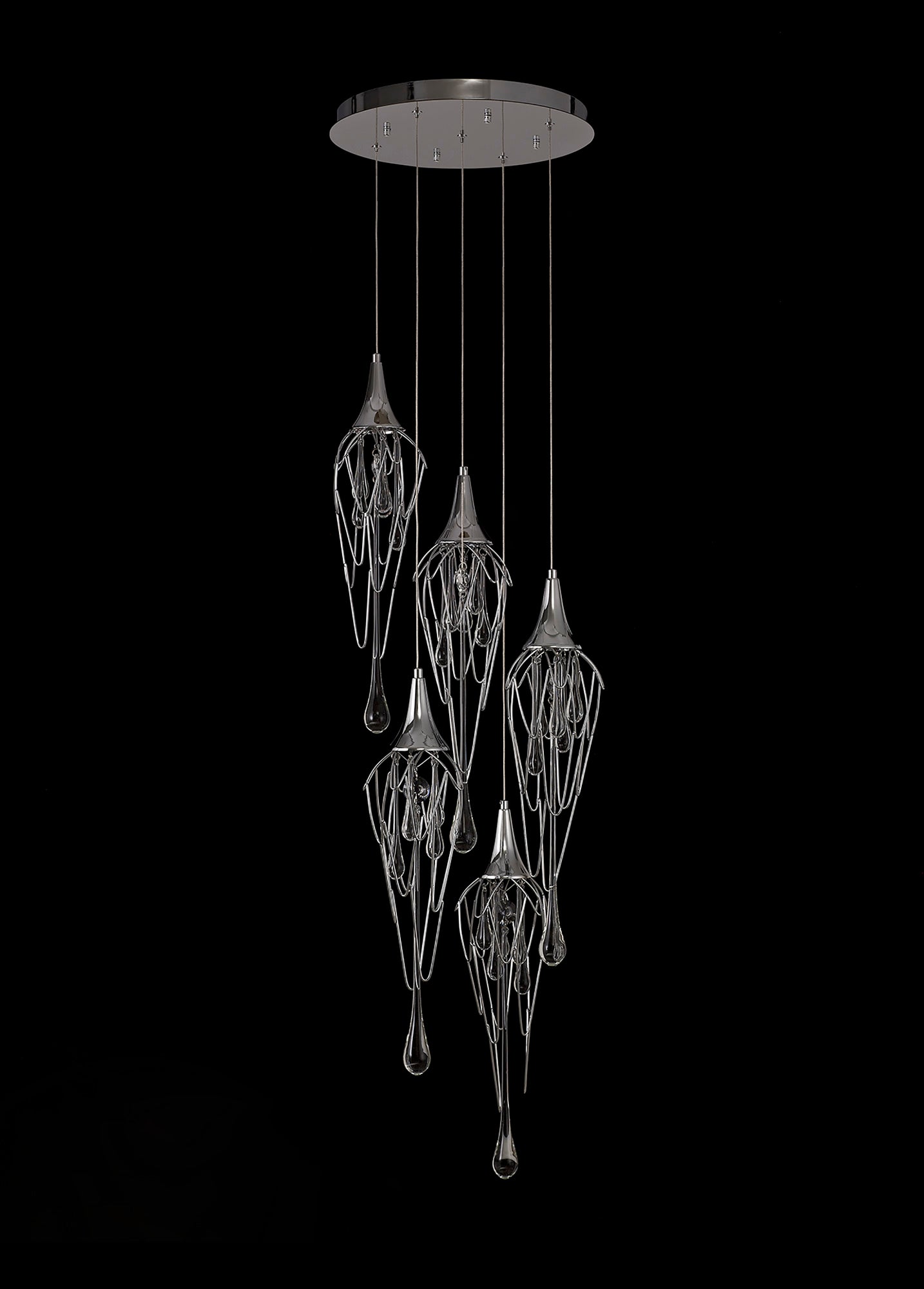 Itonda is a range of multiple pendants and complementing wall lamp, that takes the concept of a melting icicle one step further, not only using long clear crystal drops that mimic a falling drop of water but also shaping the frame which hosts them into a similar statement. The polished chrome metal frames are bent and curved like slowly cascading water which the smaller crystal drops and GU10 lampholders sit inside.