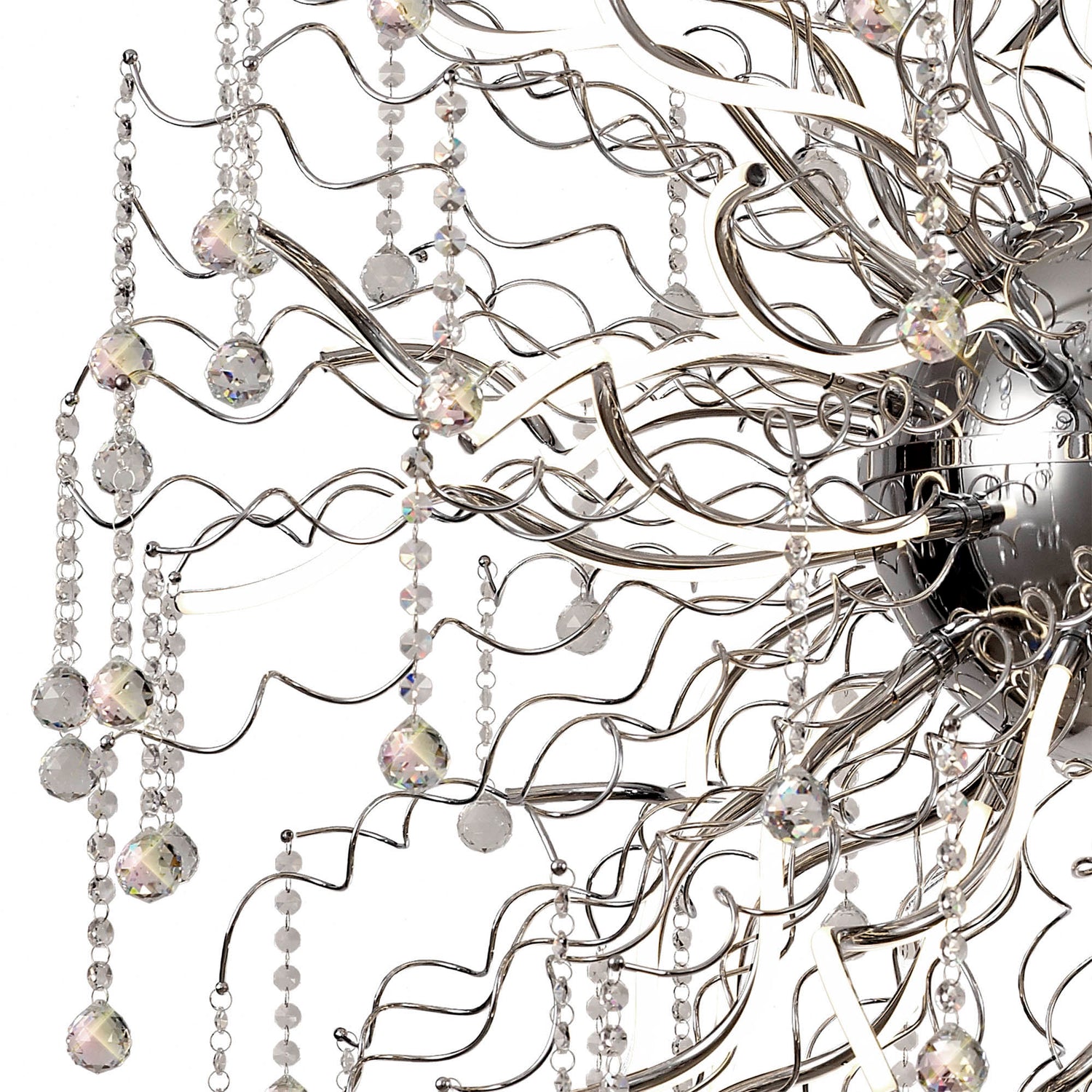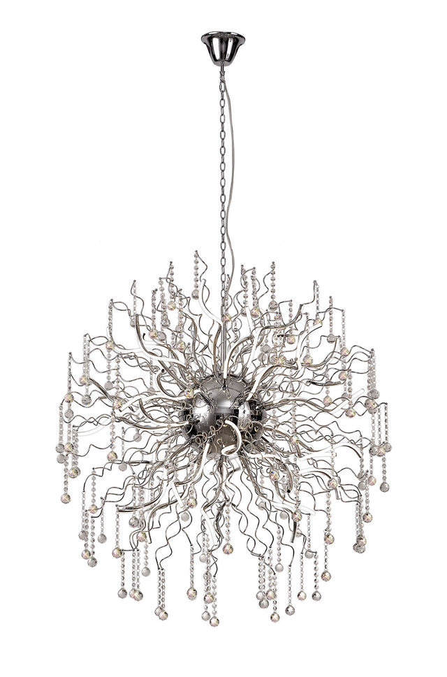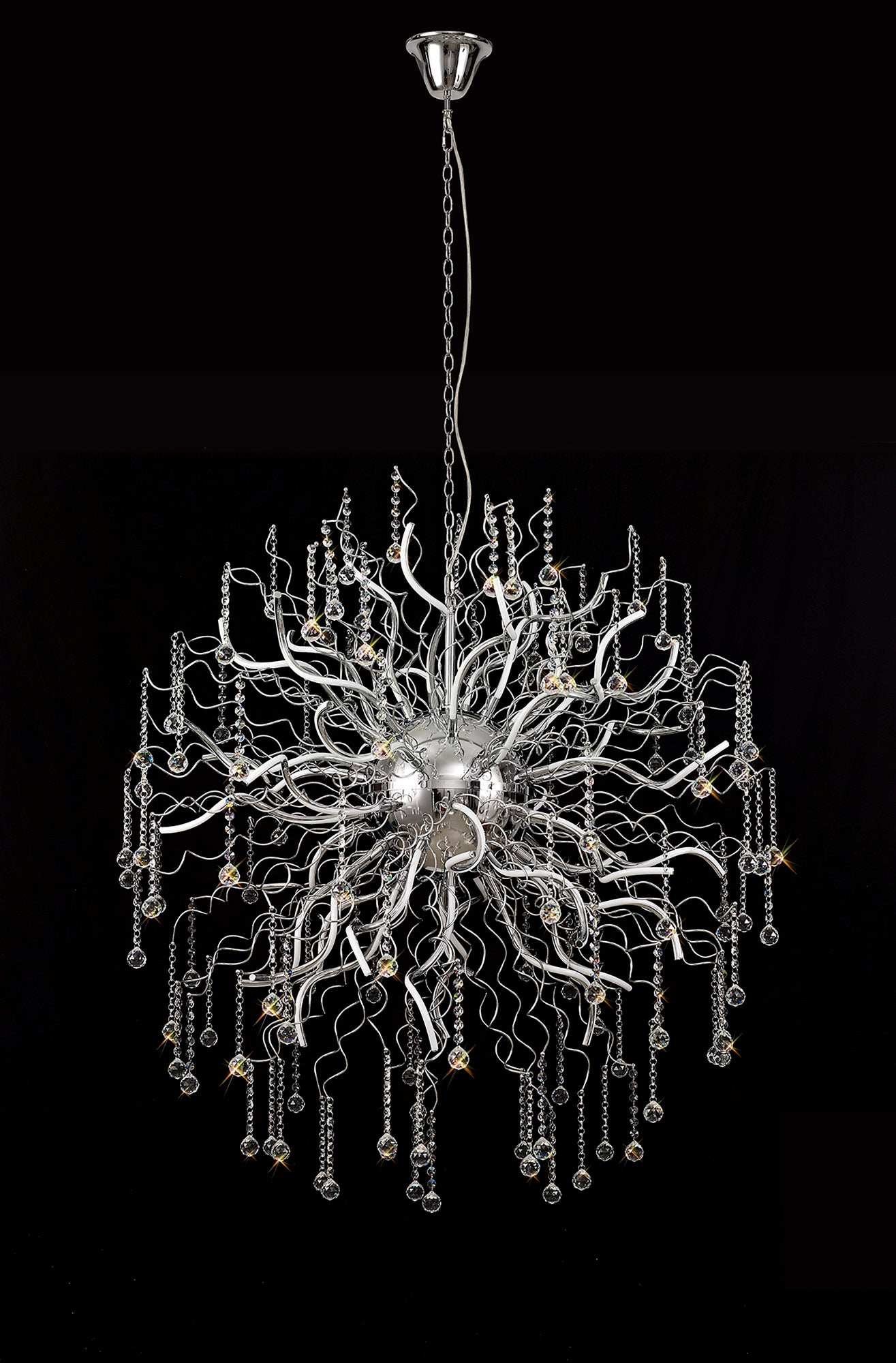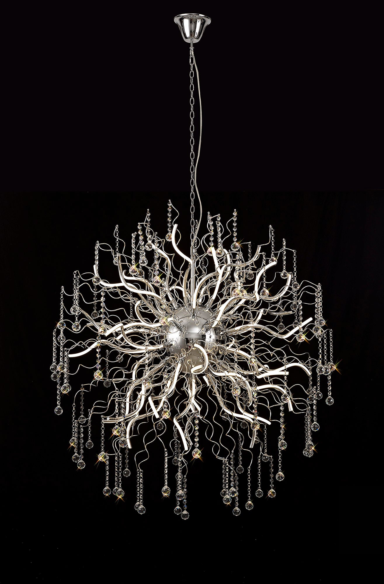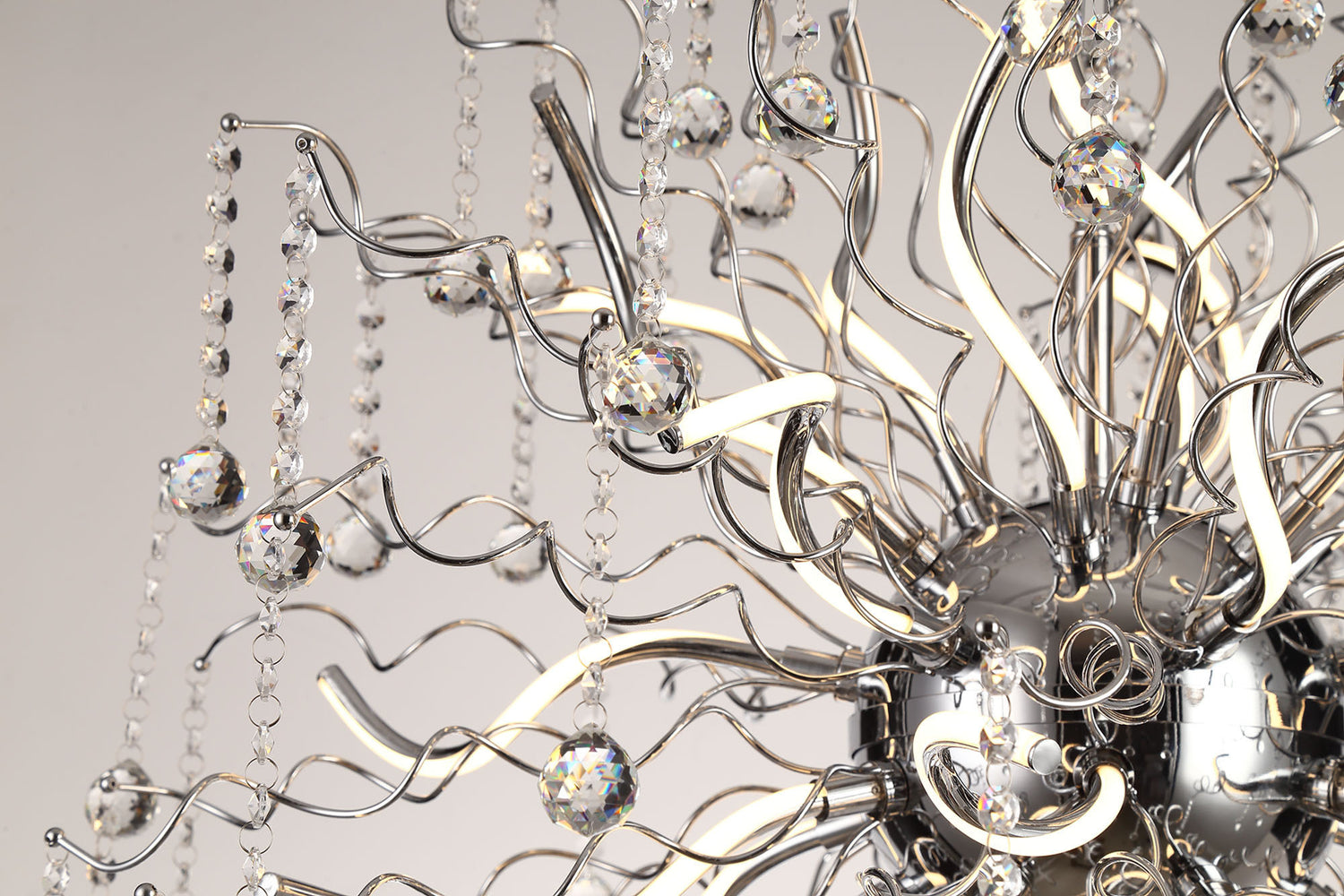 A selection of truly spectacular lighting fixtures, Jaba fuses an abundance of spiral LED arms with twists of polished chrome metal stems. The chrome corkscrews extend in different sizes and are dressed with strands of dazzling clear crystals buttons finished with clear crystal spheres. Its chaotic amalgamation of varied aspects introduces a mesmerizingly enchanting dimmable range.