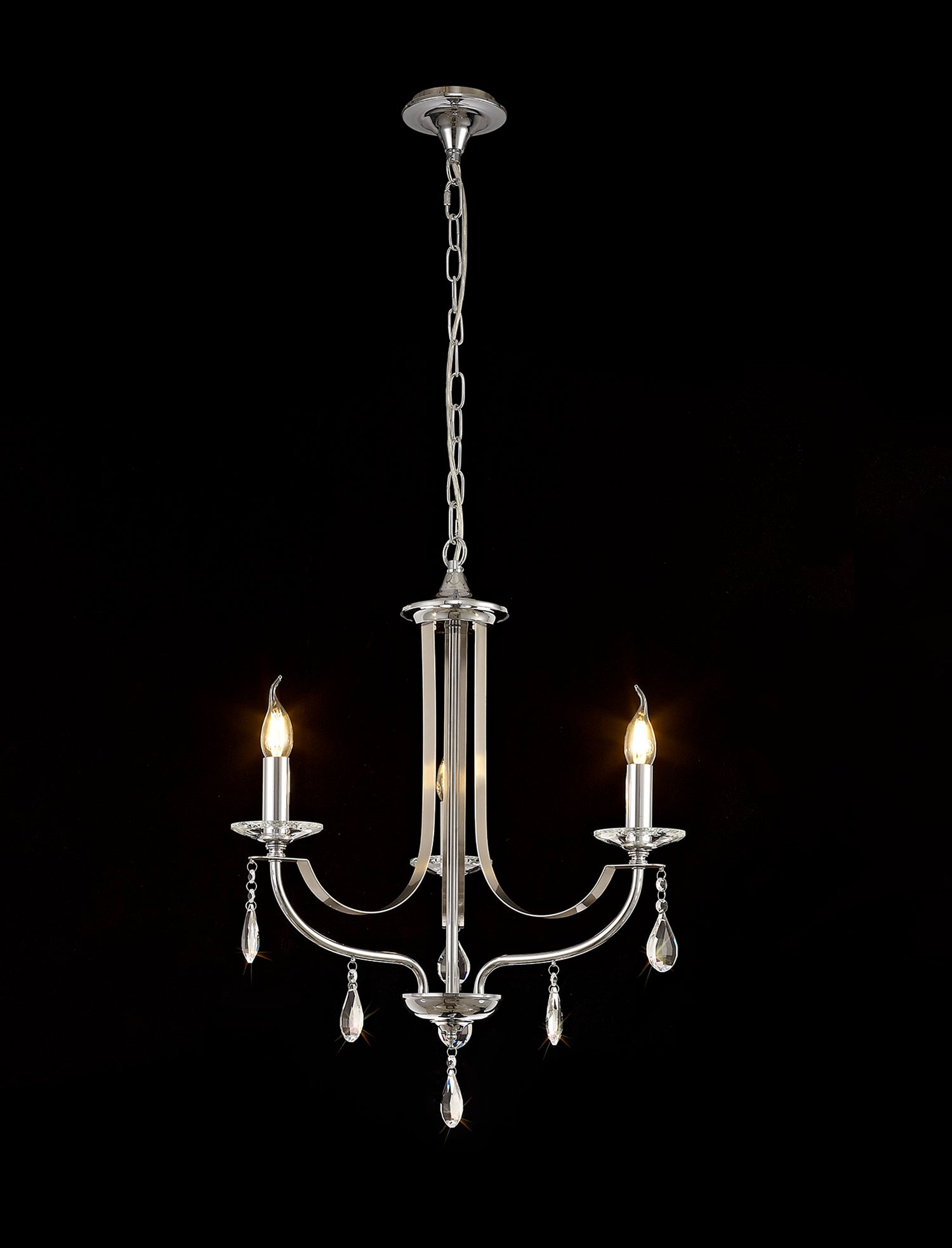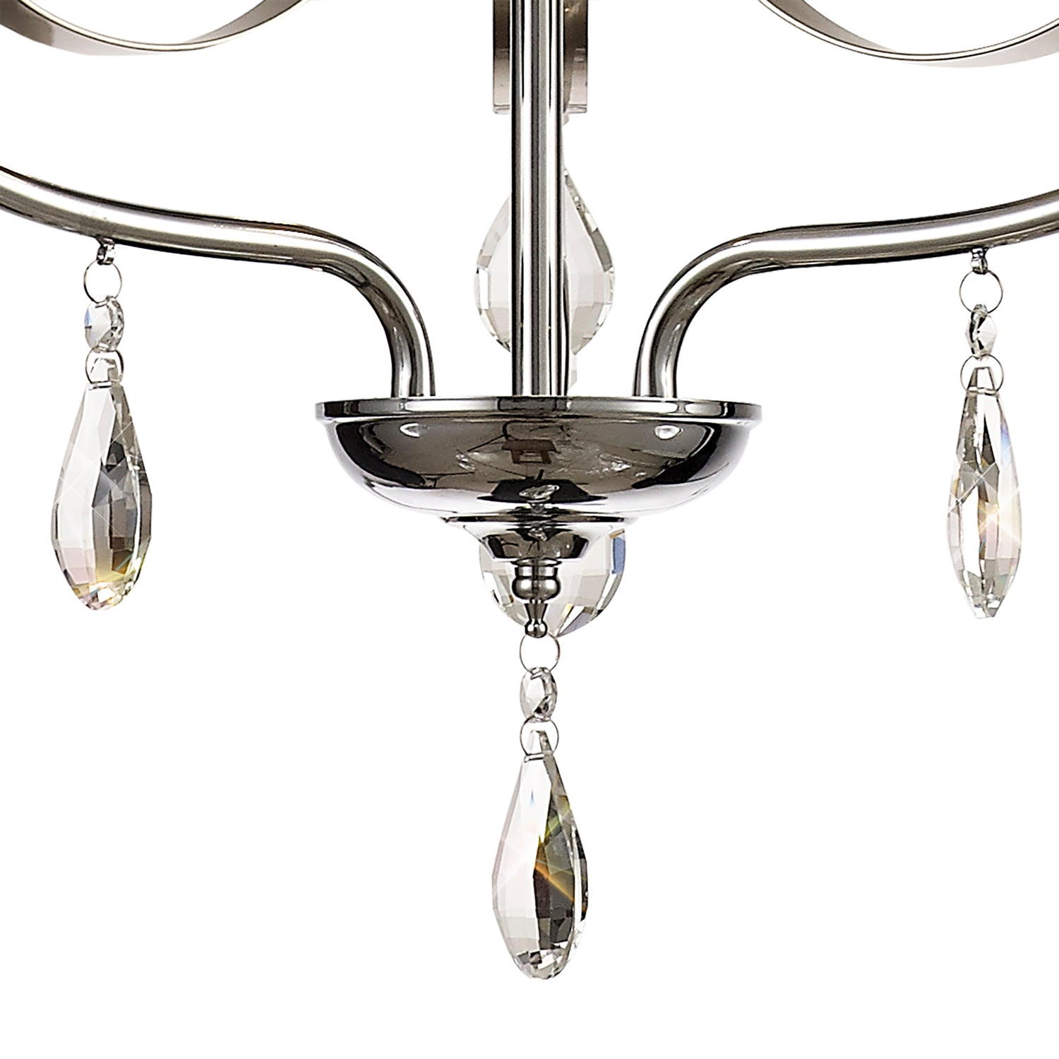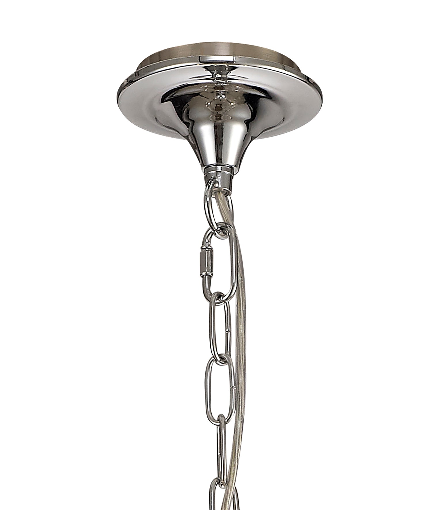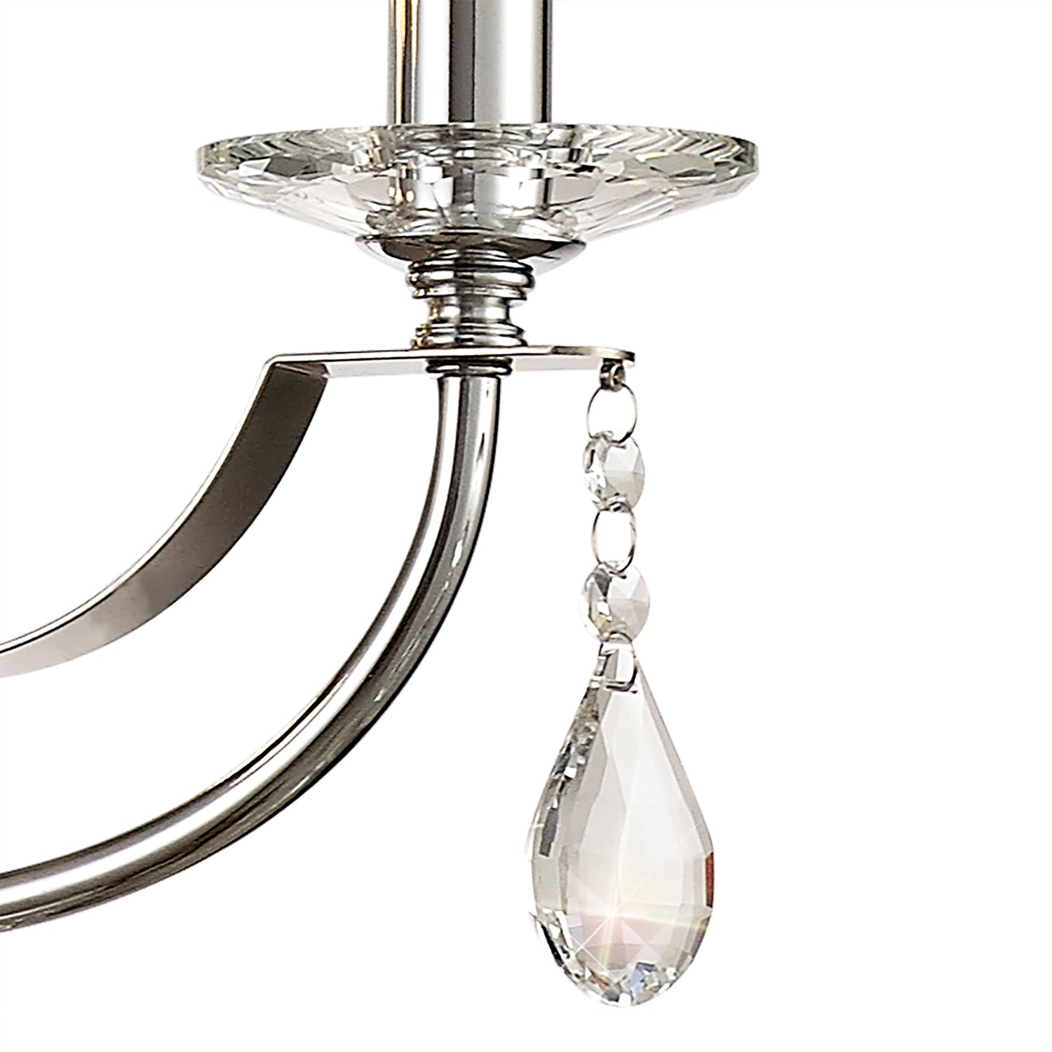Koeia combines modern and traditional components to create a comprehensive contemporary collection of pendants and wall lamps. The classic chandelier design concept has been modernised with a polished chrome finish and an abundance of stunning crystals drops which adorn the arms. A slim band of satin nickel metalwork curves above the top of each arm and flows into the centre column of the pendants and back plate of the wall lamps, to add a unique touch seamlessly contrasting the modern aspects of the range.