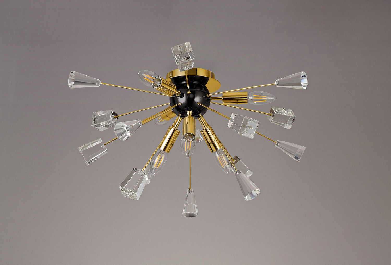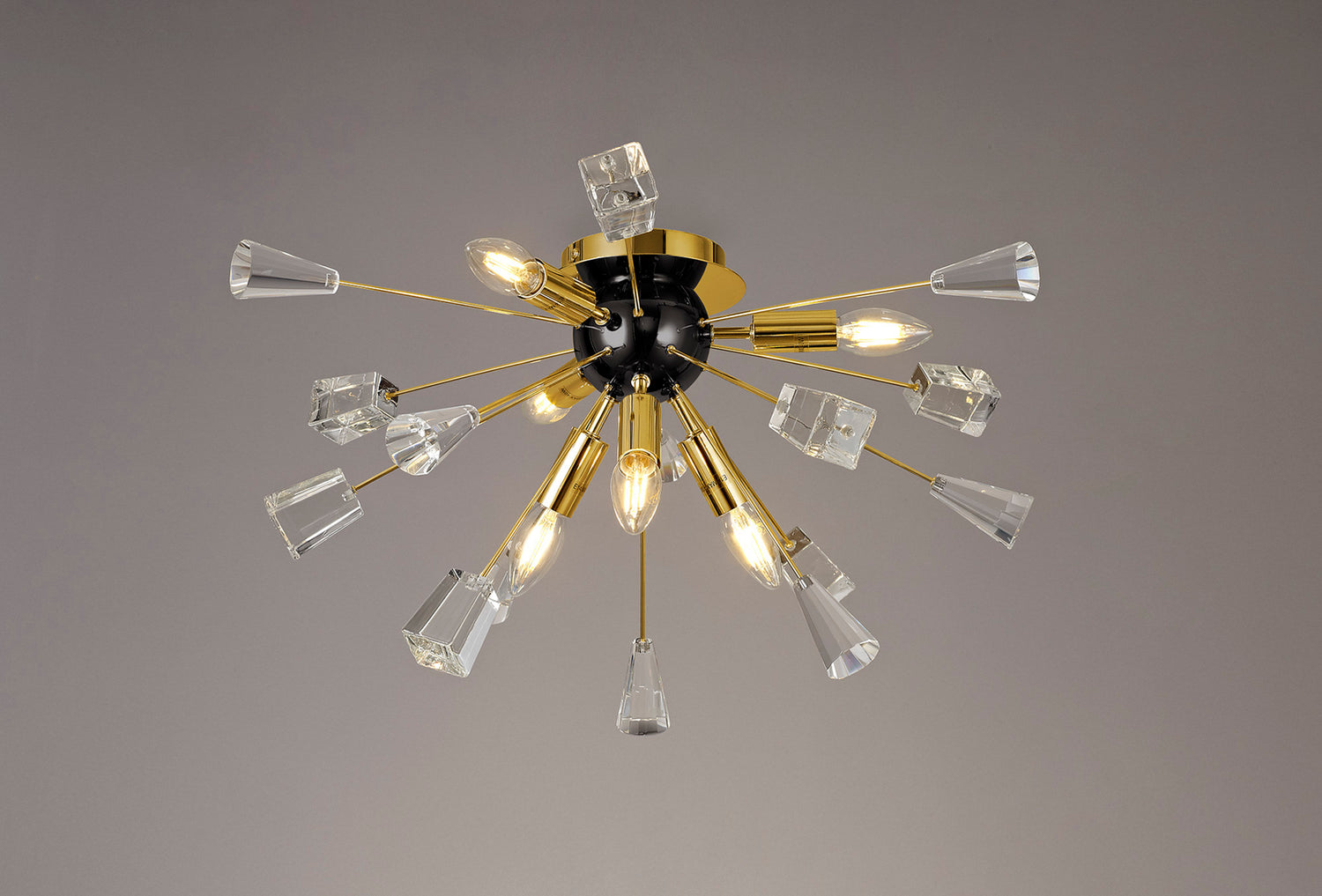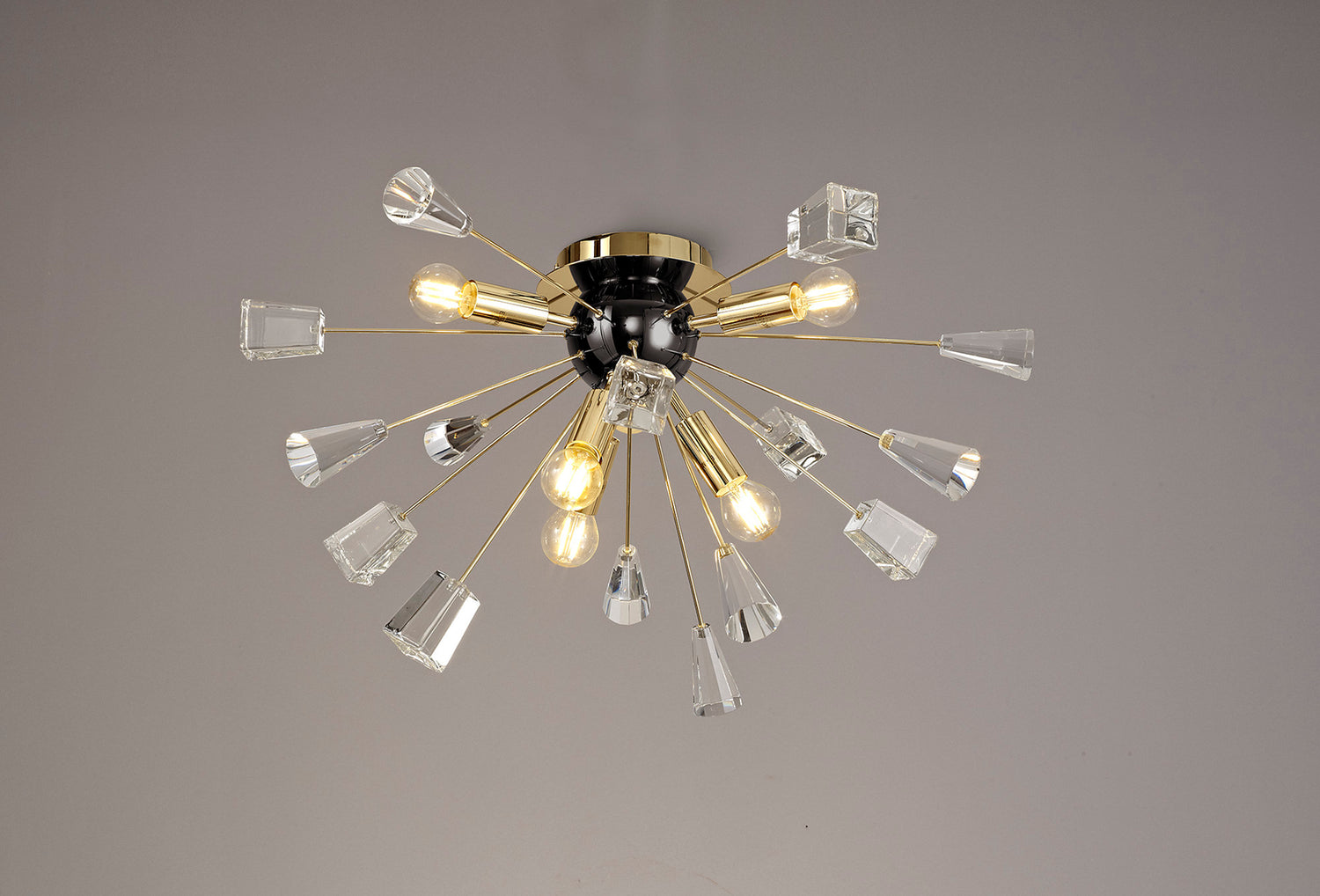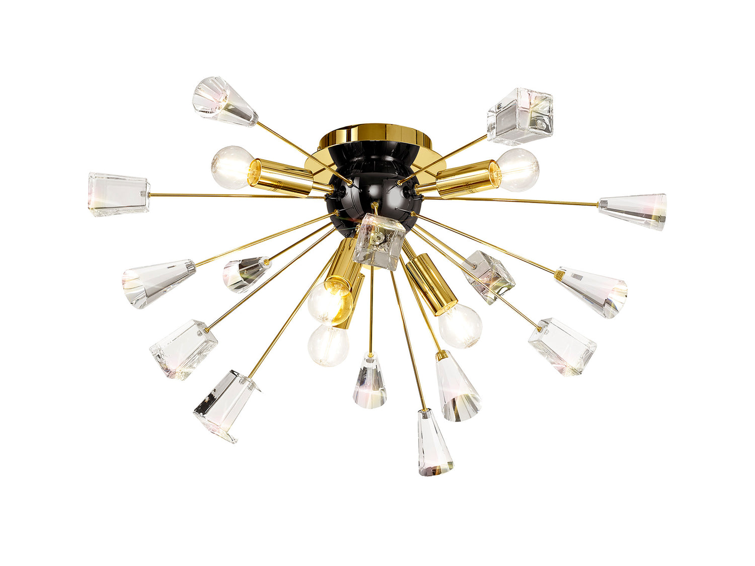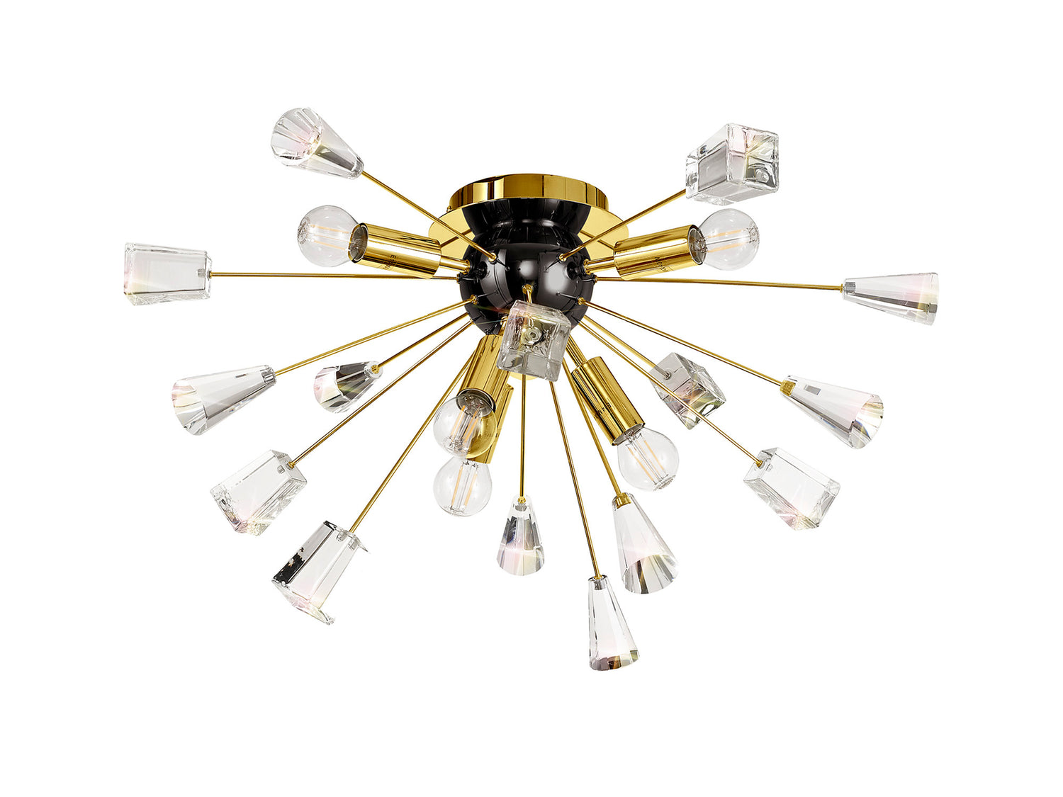 A sputnik composition is used to form the Nunki range with long thin stems protruding from the central orb frame. The tip of each arm is adorned with a substantial block of high quality crystal cut into cones and glass trapezoids. The light from the E14 lampholders refracts across the crystals and glass for a brilliant effect. Both the flush 6 light and pendant 9 light are available in either a brushed gold and gloss black finish or polished nickel.