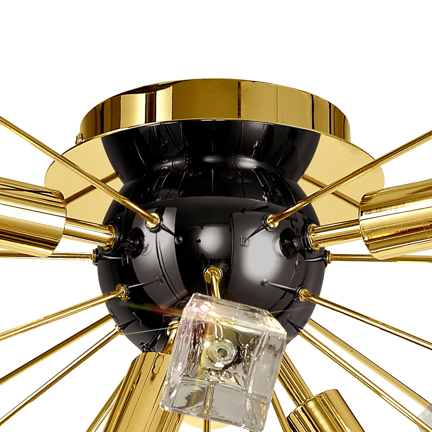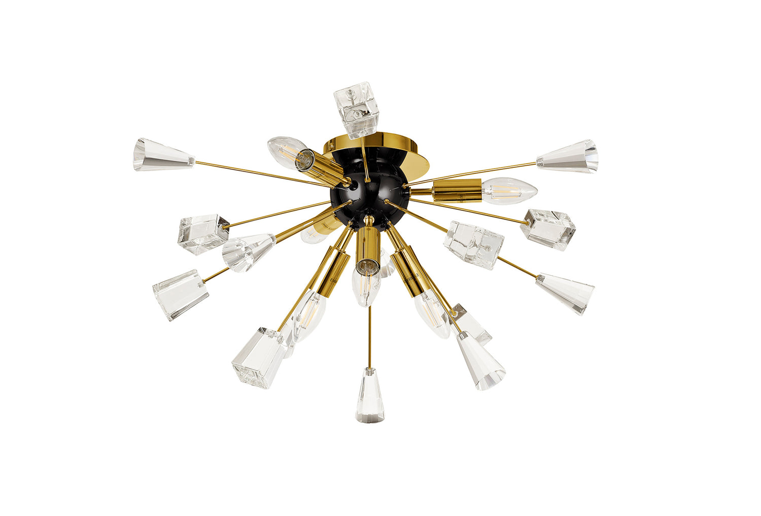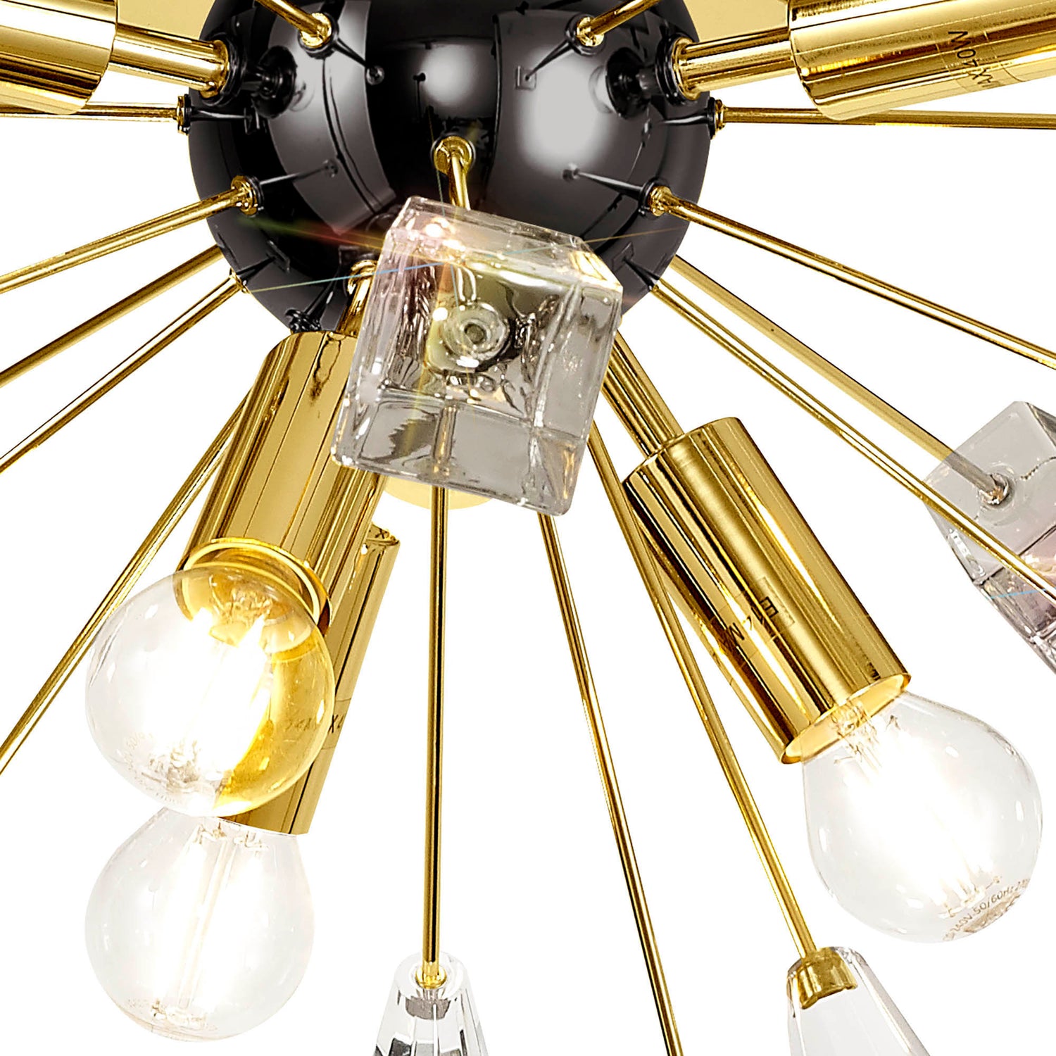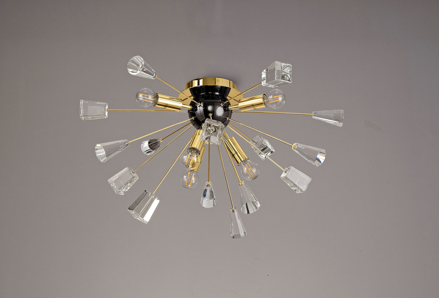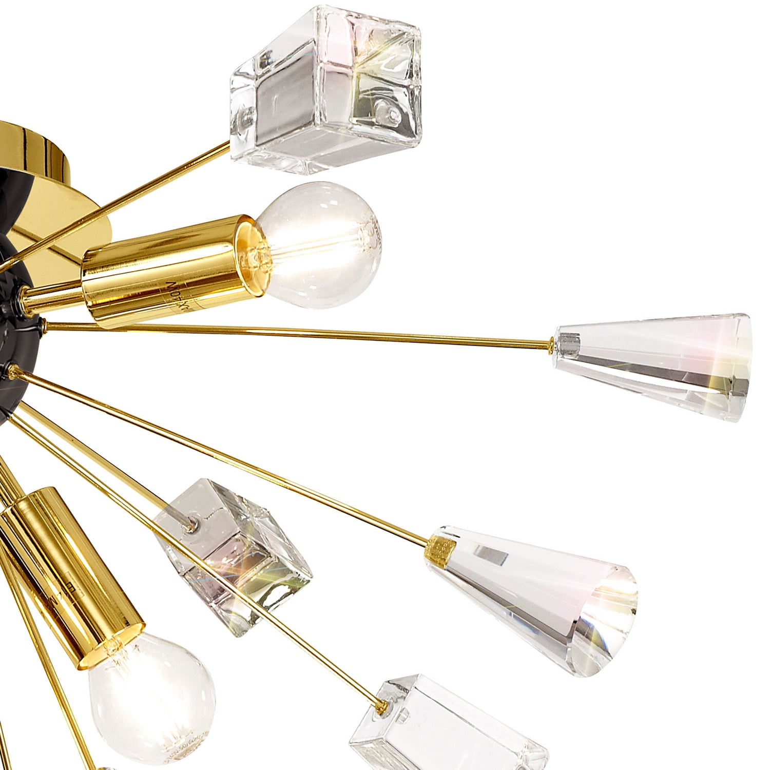 A sputnik composition is used to form the Nunki range with long thin stems protruding from the central orb frame. The tip of each arm is adorned with a substantial block of high quality crystal cut into cones and glass trapezoids. The light from the E14 lampholders refracts across the crystals and glass for a brilliant effect. Both the flush 6 light and pendant 9 light are available in either a brushed gold and gloss black finish or polished nickel.