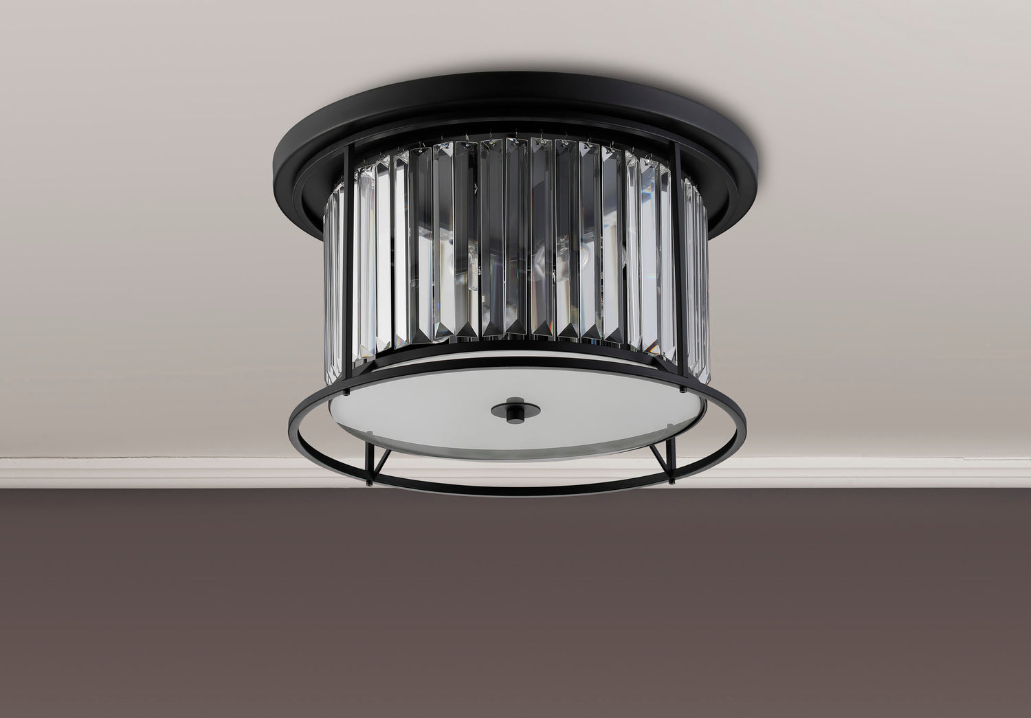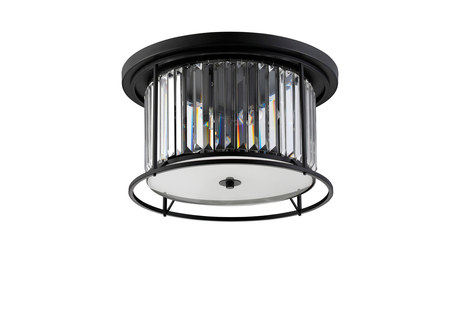 This stunning 4 light crystal ceiling light comes from the Hillano Royal range, item code ROY2119. The 4 light ceiling light comes in a modern satin black finish complete with elegant prism crystals and a frosted glass diffuser.