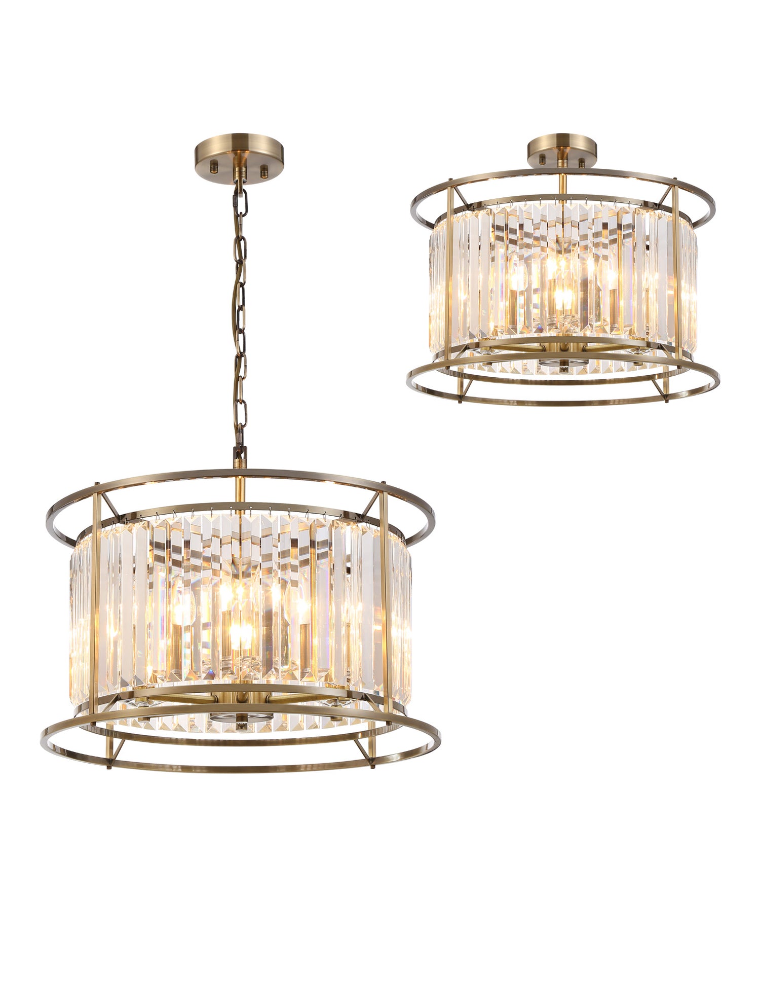 The Royal collection offers a wide variety of pendant lights including multiple sized round options and an oval linear light. The comprehensive selection also includes flush ceiling lights, a wall and table lamp. The high quality, long rectangular, clear crystals are hung around the lamp holders which creates a dazzling effect when illuminated but still maintains a stunning visual when the light is not in use. Available in three colour finishes; antique brass, polished nickel and satin black the regality of this extensive range can be bring class and elegance to its given setting. To view the full range type 'Royal' into the search box.