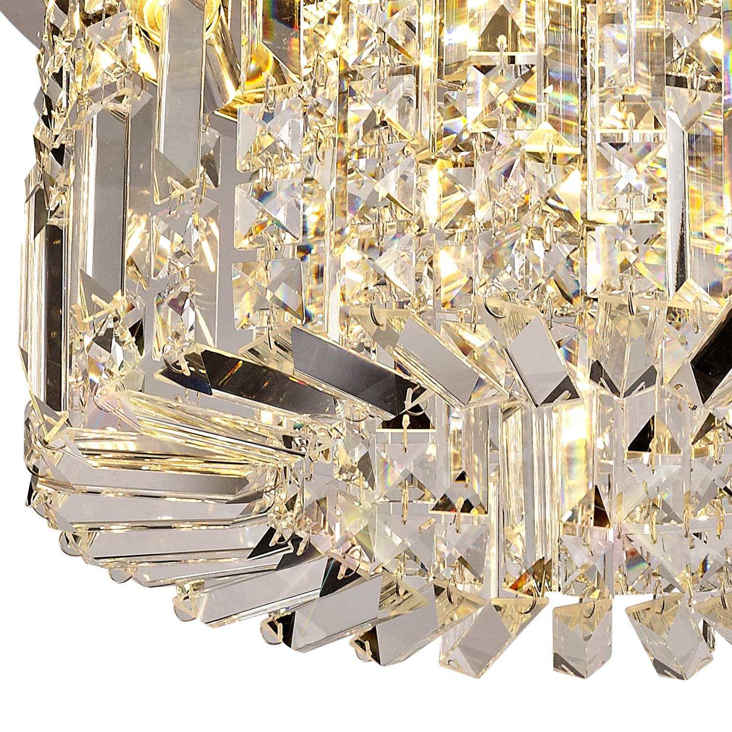 Zosma is a prestigious collection of alluring crystal fixtures that enraptures its audience with the exceptional dazzling quality of each piece of clear crystal. From 1m rectangular pendants to 45cm round flush lights each impressive design is available in either a polished chrome or gold finish. The striking strands of crystal hang either side of the E14 lampholders and are joined beneath them with additional rectangular crystal pieces, to conceal the lamps used and heighten the sparkle demonstrated when illuminated.