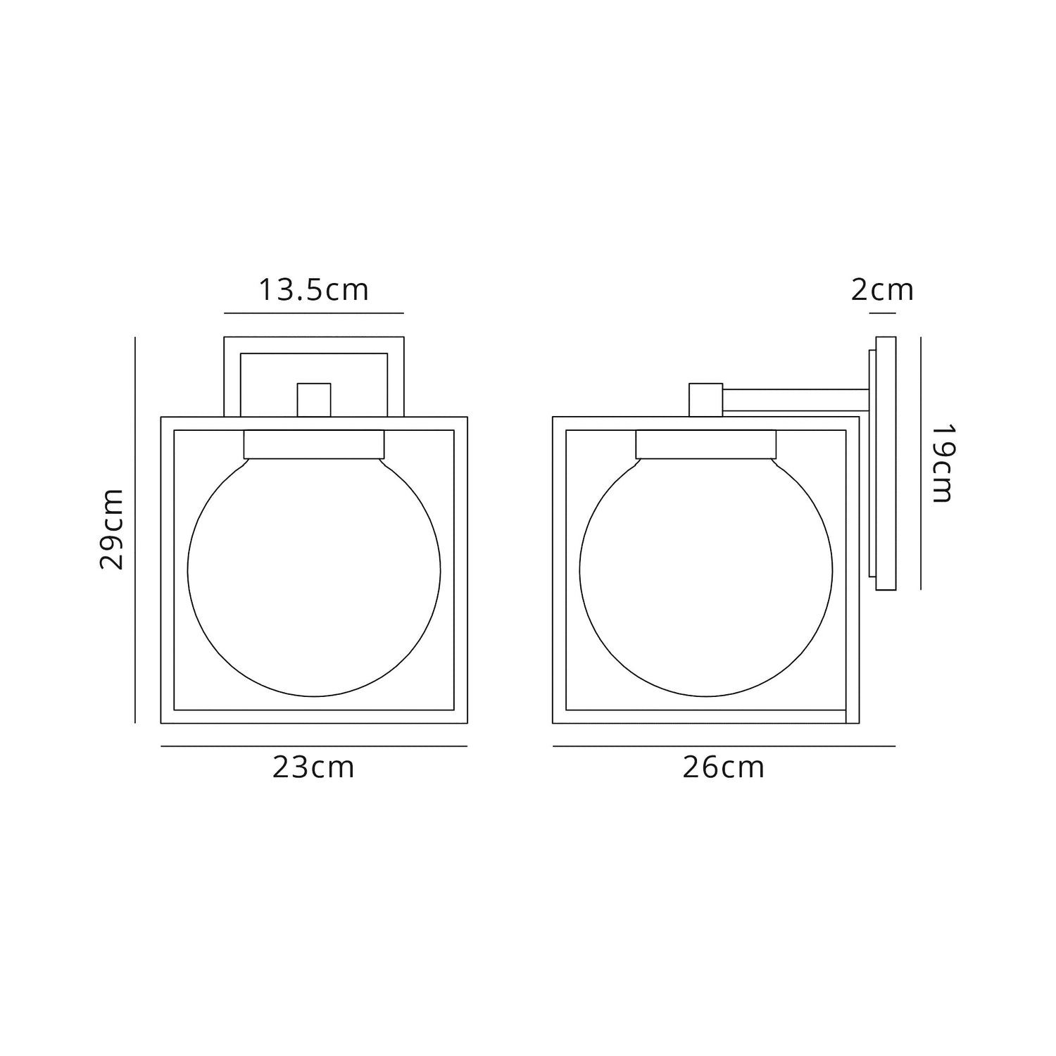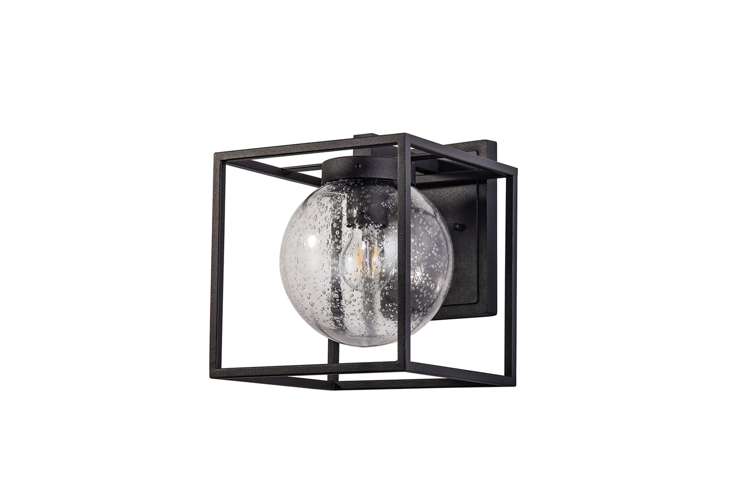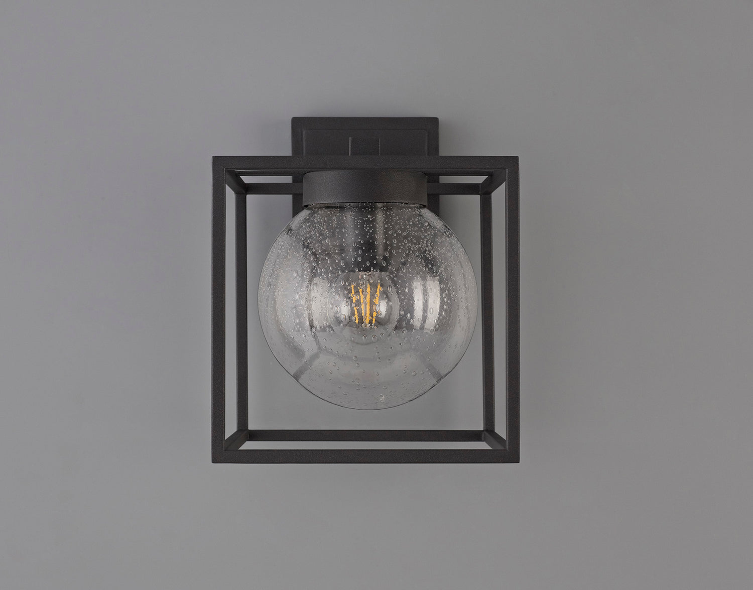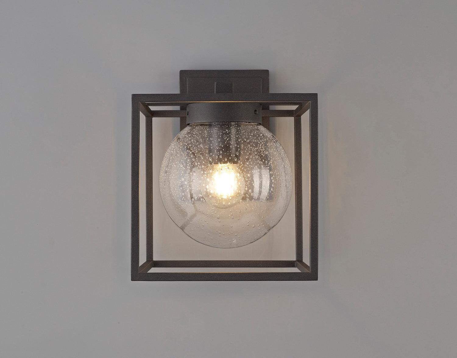 The Ancha outdoor wall lamp uses a uniform cube frame with open faces to offer a clear view of the unique glass globe. The clear seeded glass acts a protective seal around the E27 lampholder giving the fixture an IP54 rating whilst also providing a stylish feature appropriate for outdoor lighting. The dark anthracite colour finish offers extra durability against all types of weather.