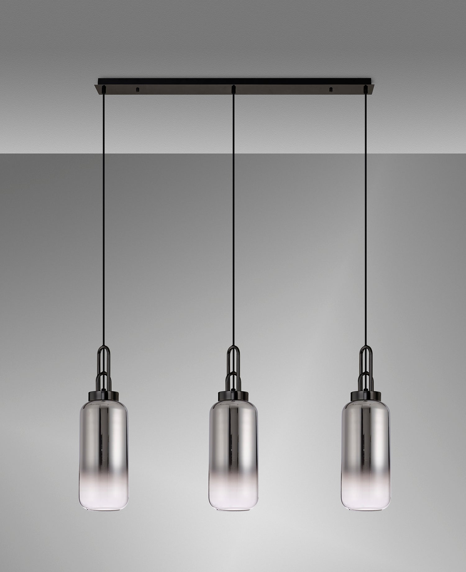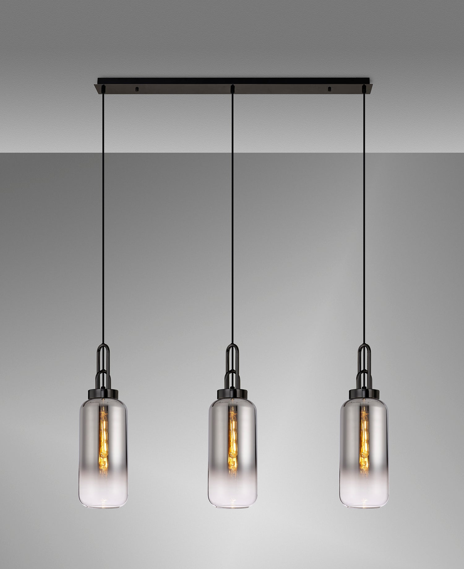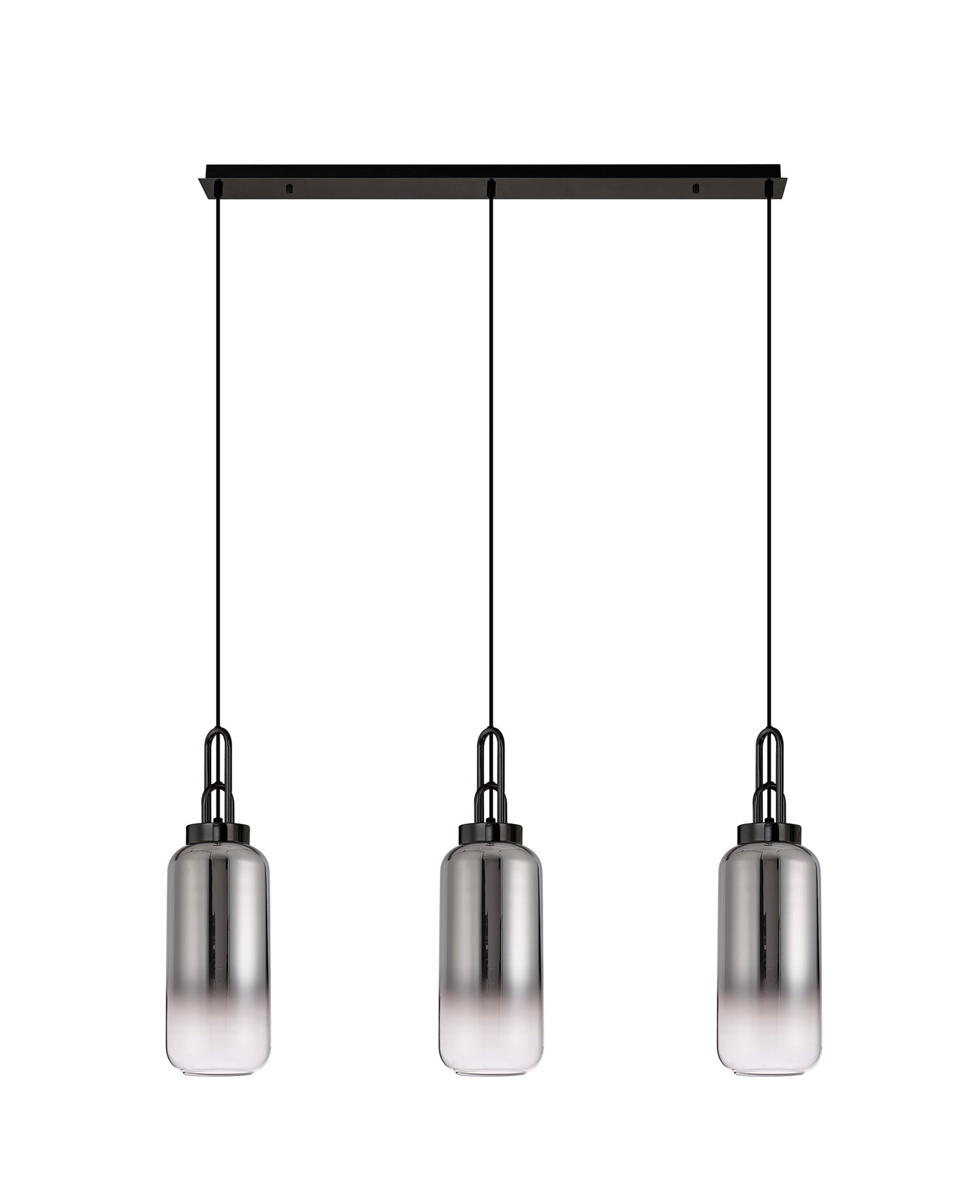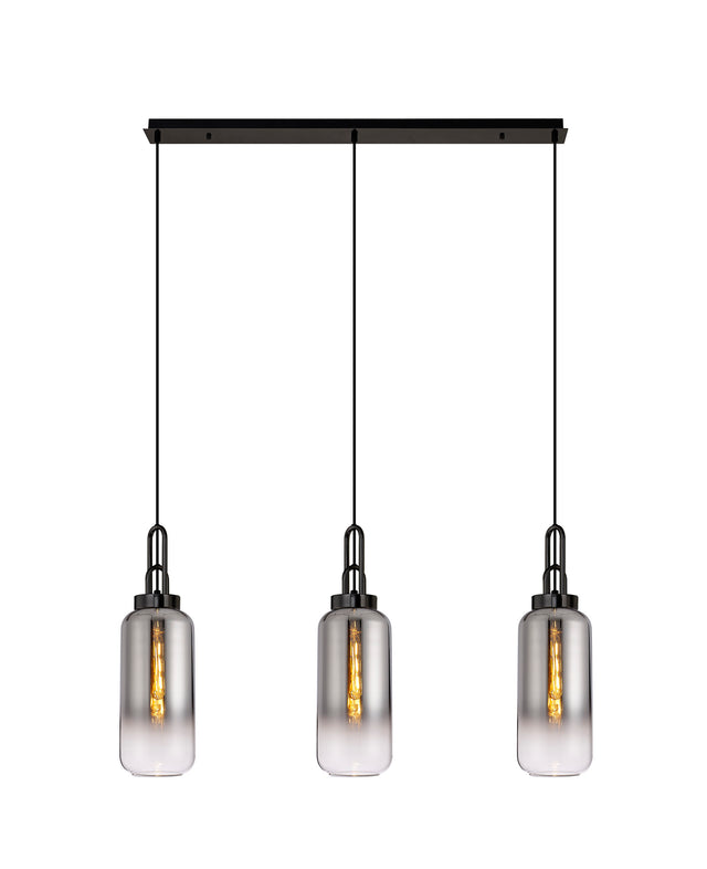 This stylish 3 light bar pendant comes from the Hillano Achernar range, item code ACH2260. The 3 light bar pendant comes with a matt black and black chrome metal work complete with 16cm Cylinder Glass smoke fade shades.
