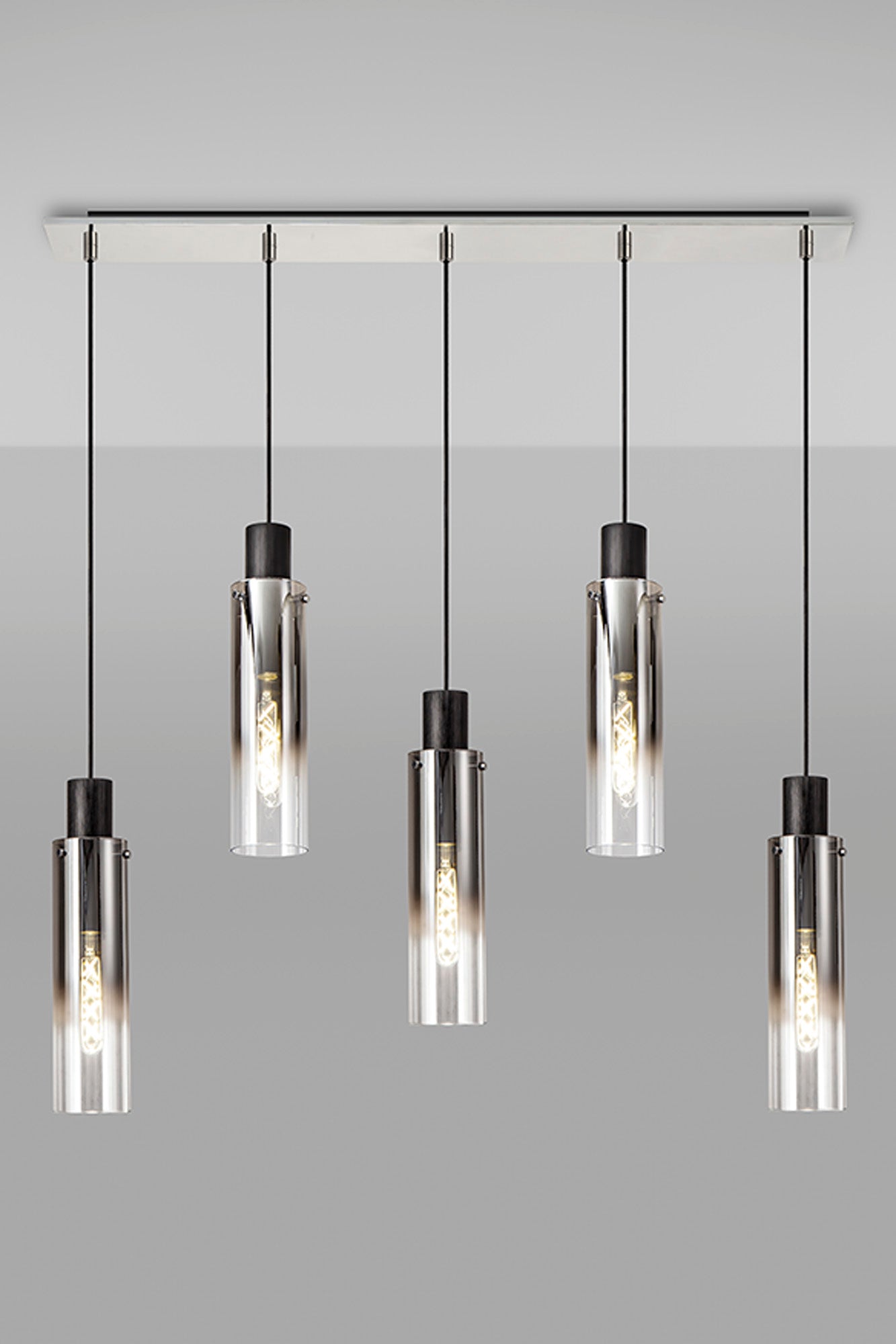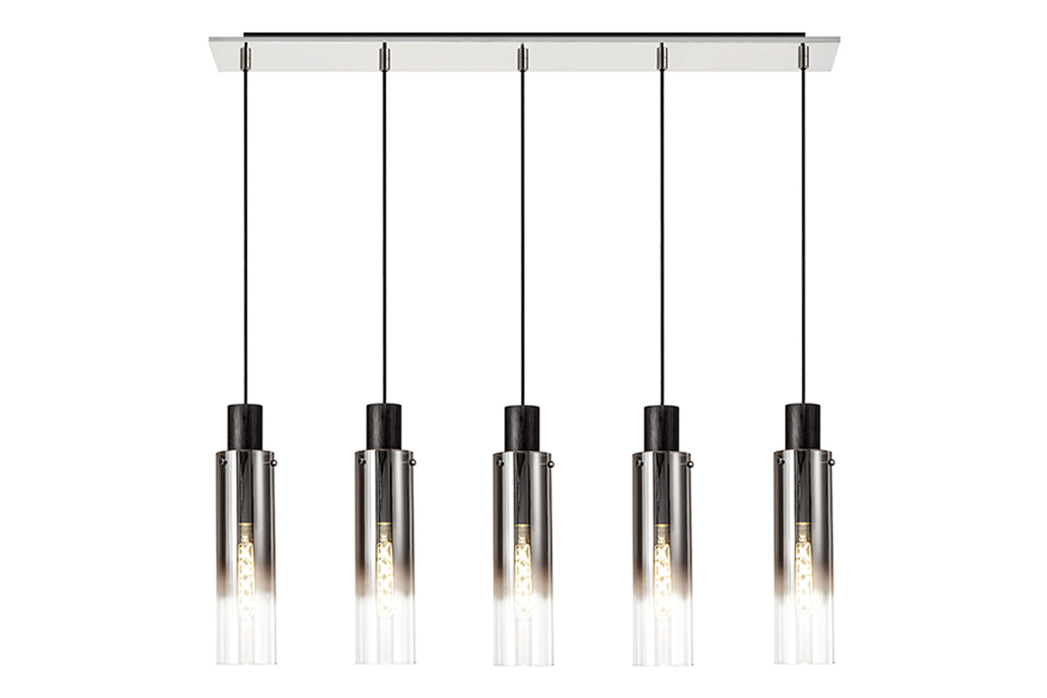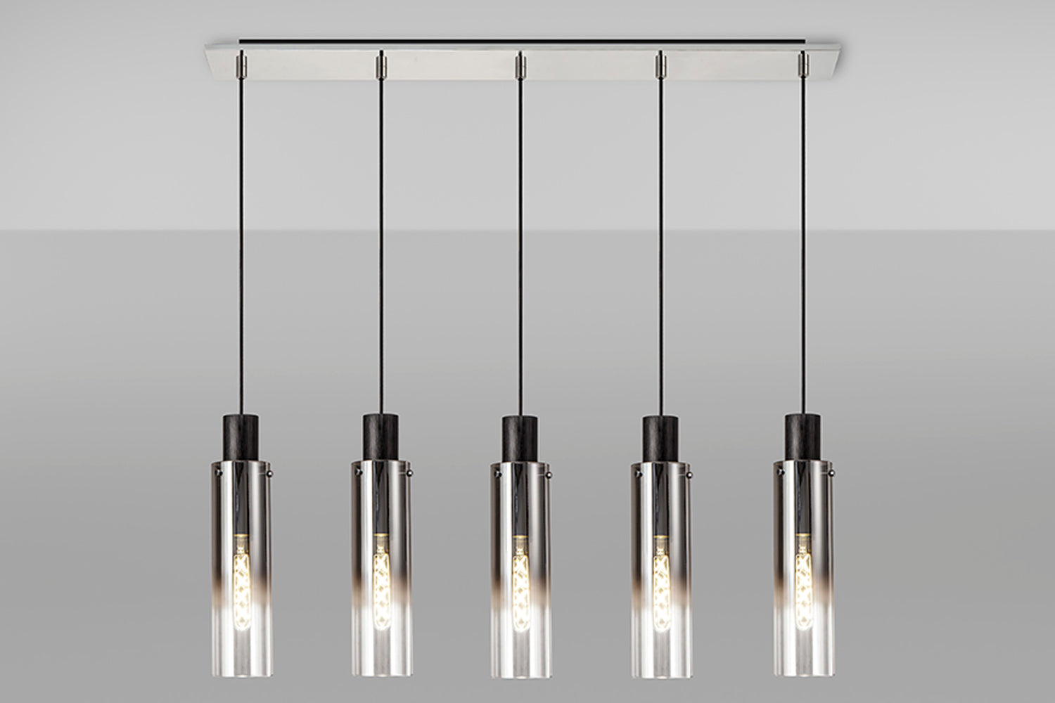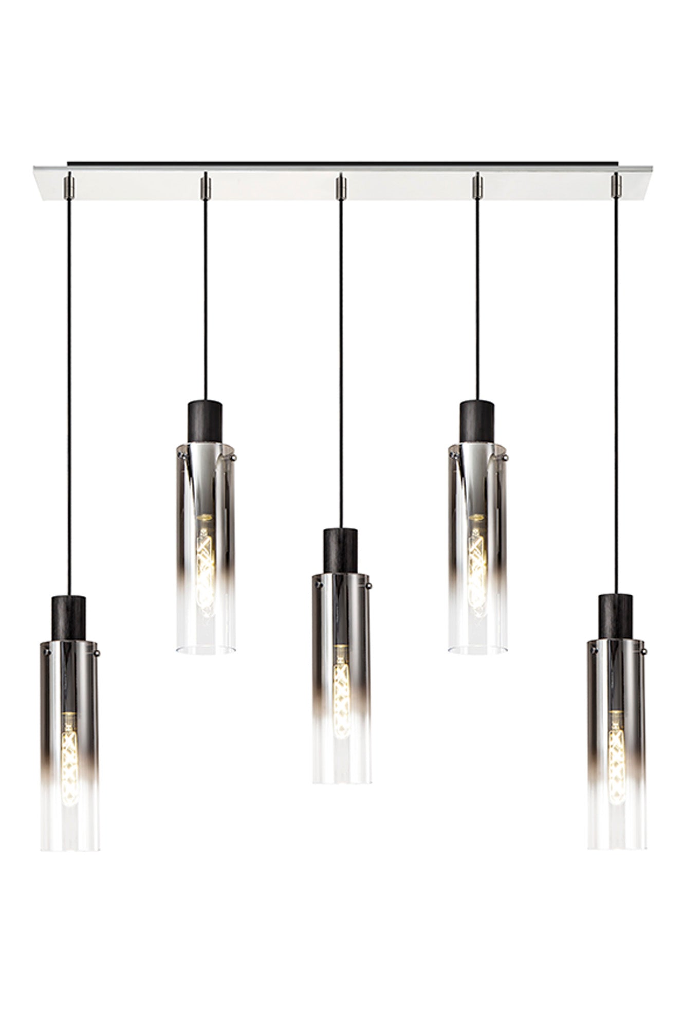 This exclusive 5 light bar pendant light comes from the Hillano Bunda range, the item code for this product is BUN5948. The 5 light bar pendant comes with a chrome ceiling plate, black lamp holders complete with smoked fade glass shades.