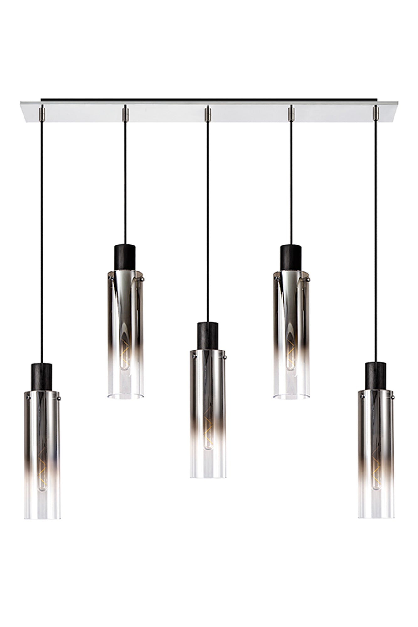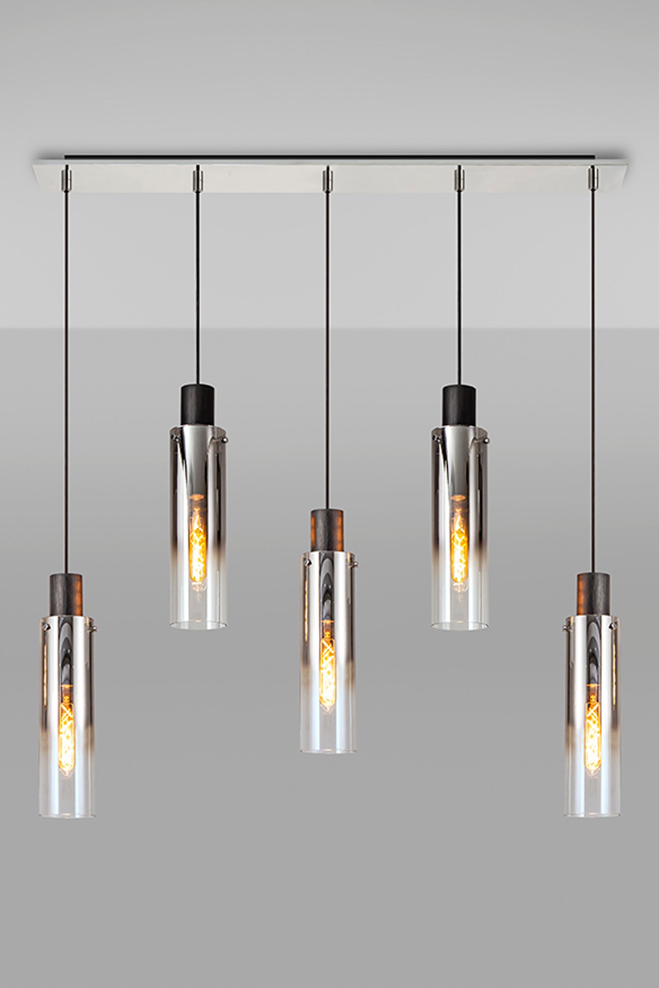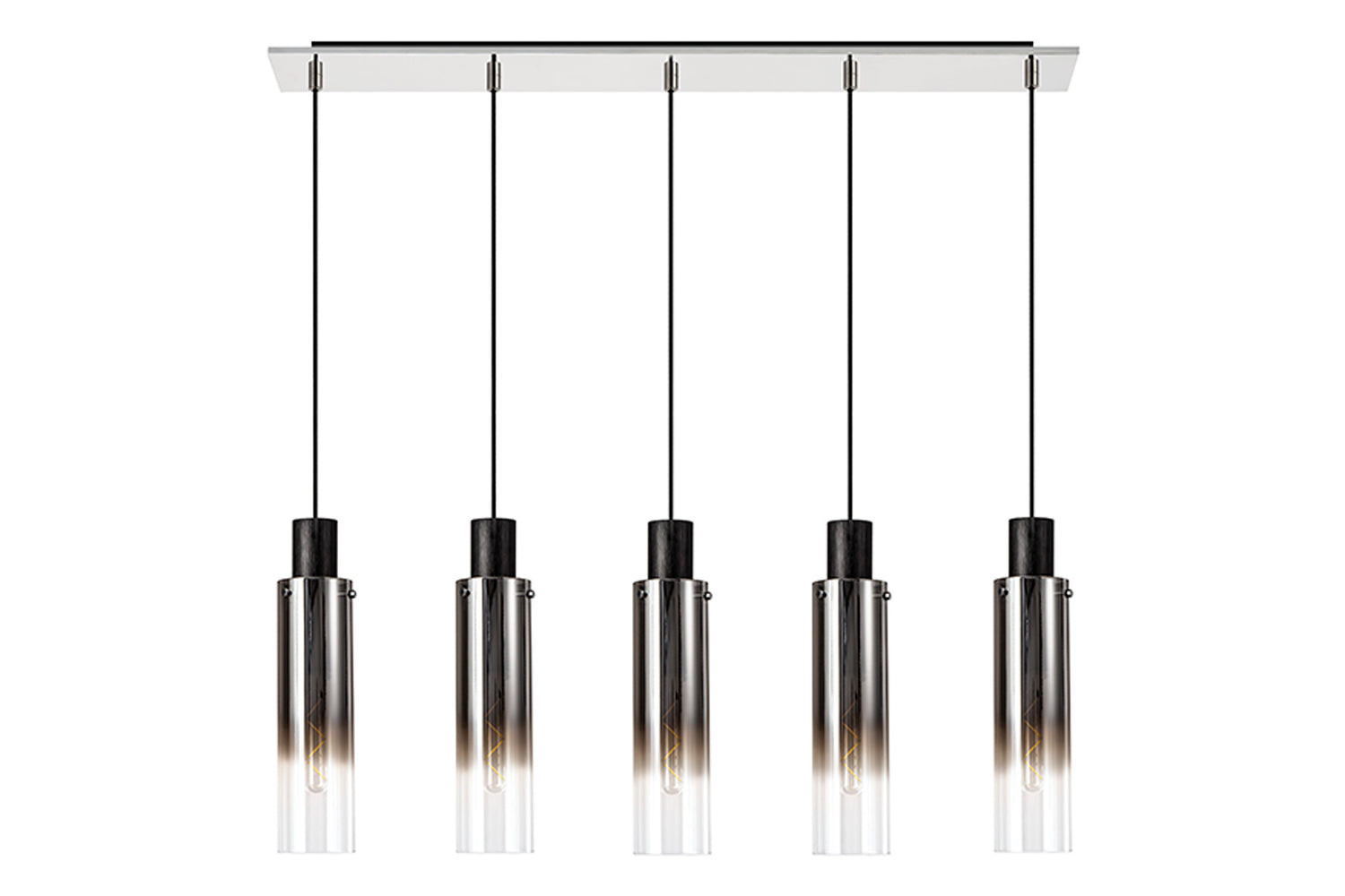 This exclusive 5 light bar pendant light comes from the Hillano Bunda range, the item code for this product is BUN5948. The 5 light bar pendant comes with a chrome ceiling plate, black lamp holders complete with smoked fade glass shades.