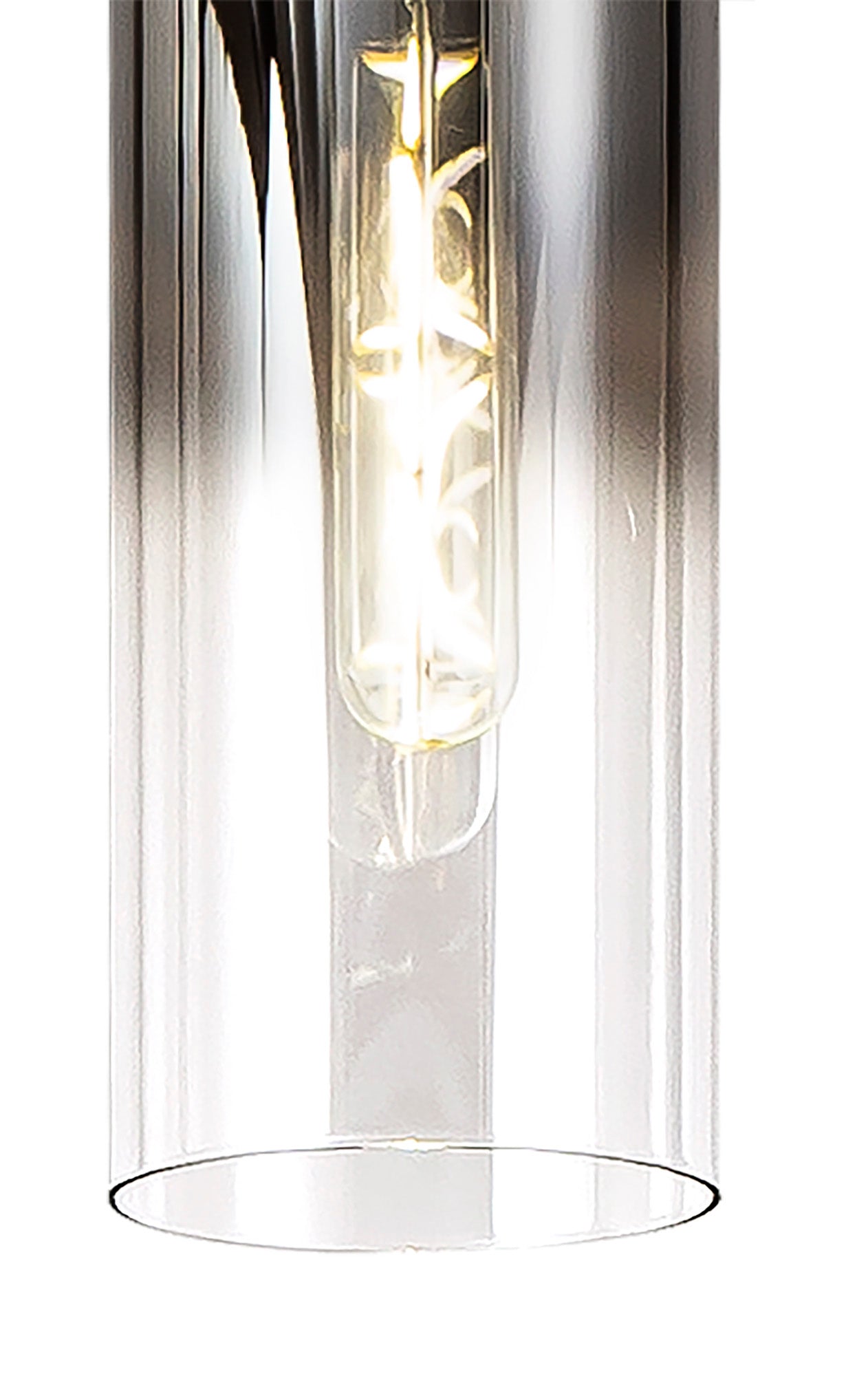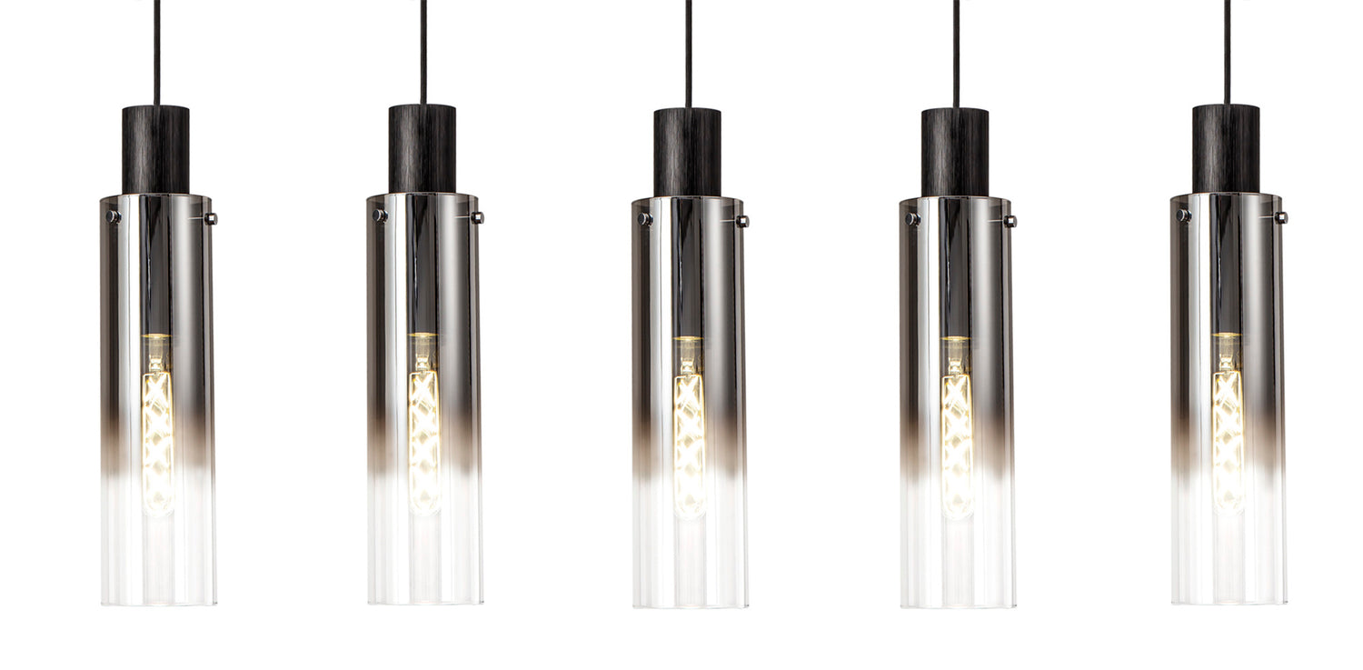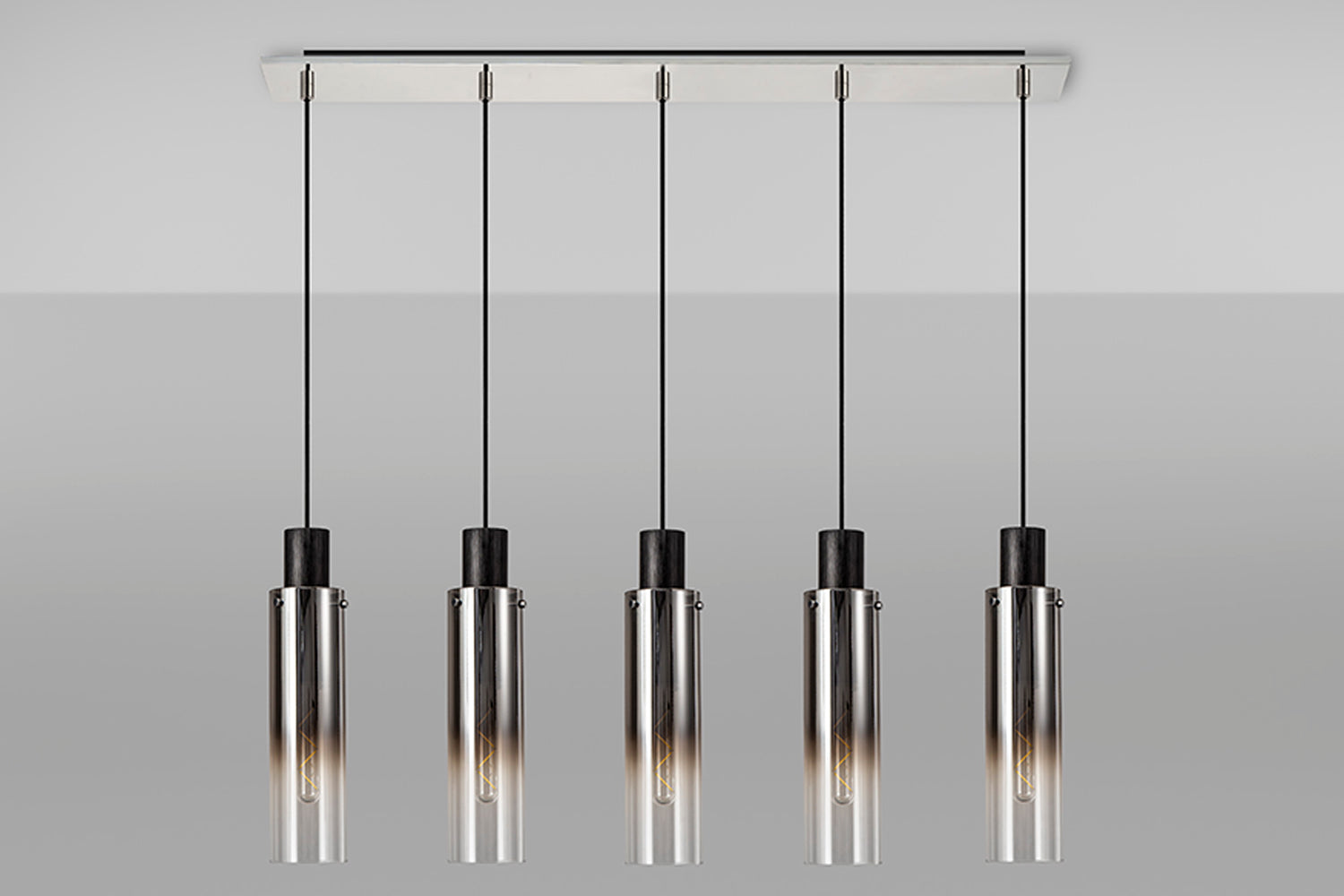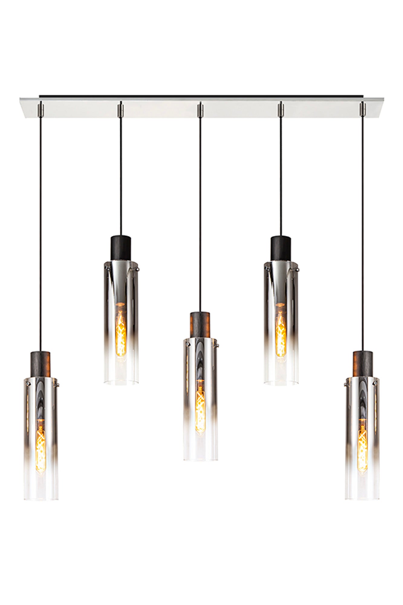 This exclusive 5 light bar pendant light comes from the Hillano Bunda range, the item code for this product is BUN5948. The 5 light bar pendant comes with a chrome ceiling plate, black lamp holders complete with smoked fade glass shades.
