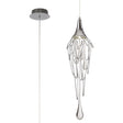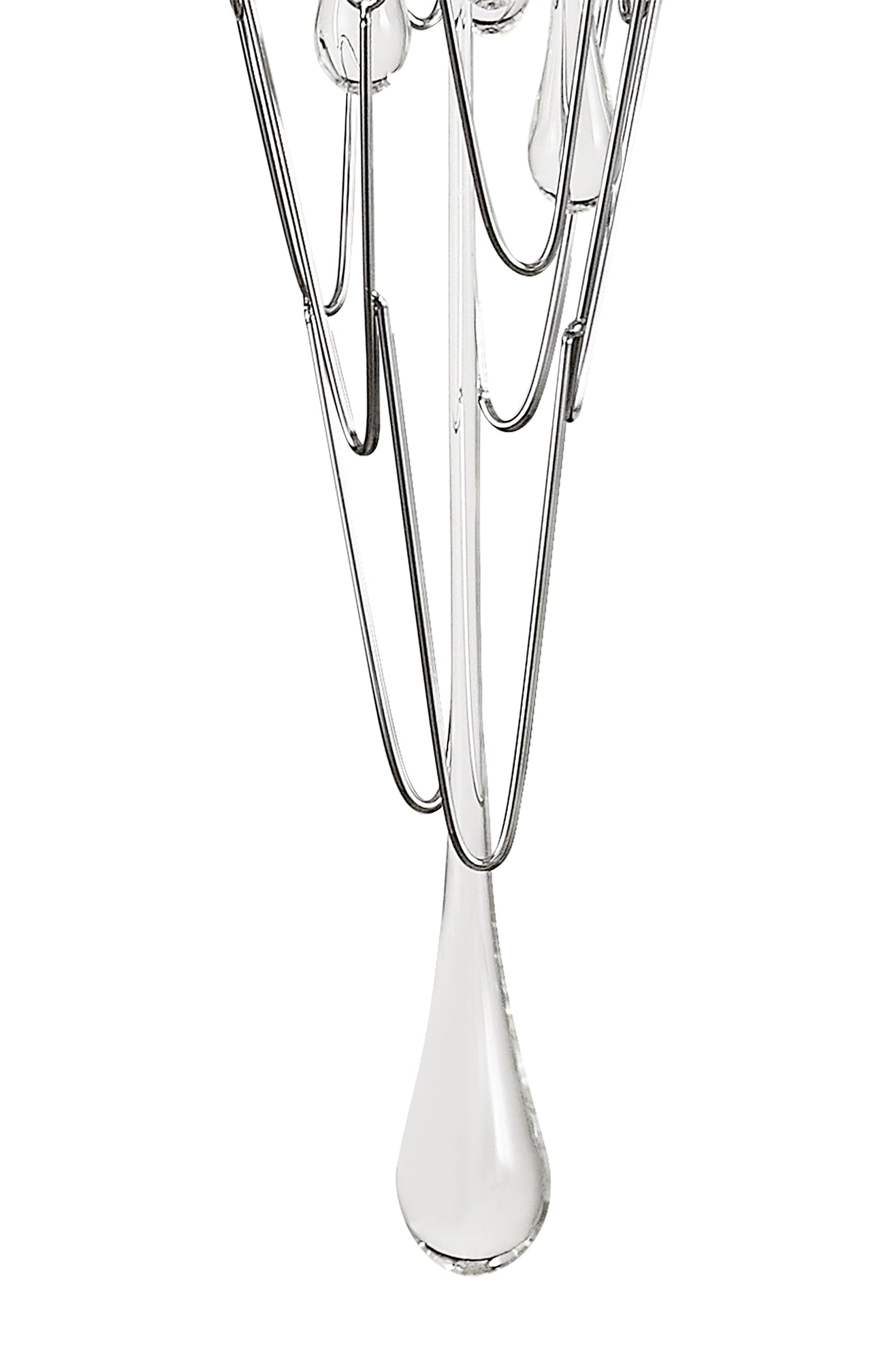 Itonda is a range of multiple pendants and complementing wall lamp, that takes the concept of a melting icicle one step further, not only using long clear crystal drops that mimic a falling drop of water but also shaping the frame which hosts them into a similar statement. The polished chrome metal frames are bent and curved like slowly cascading water which the smaller crystal drops and GU10 lampholders sit inside.