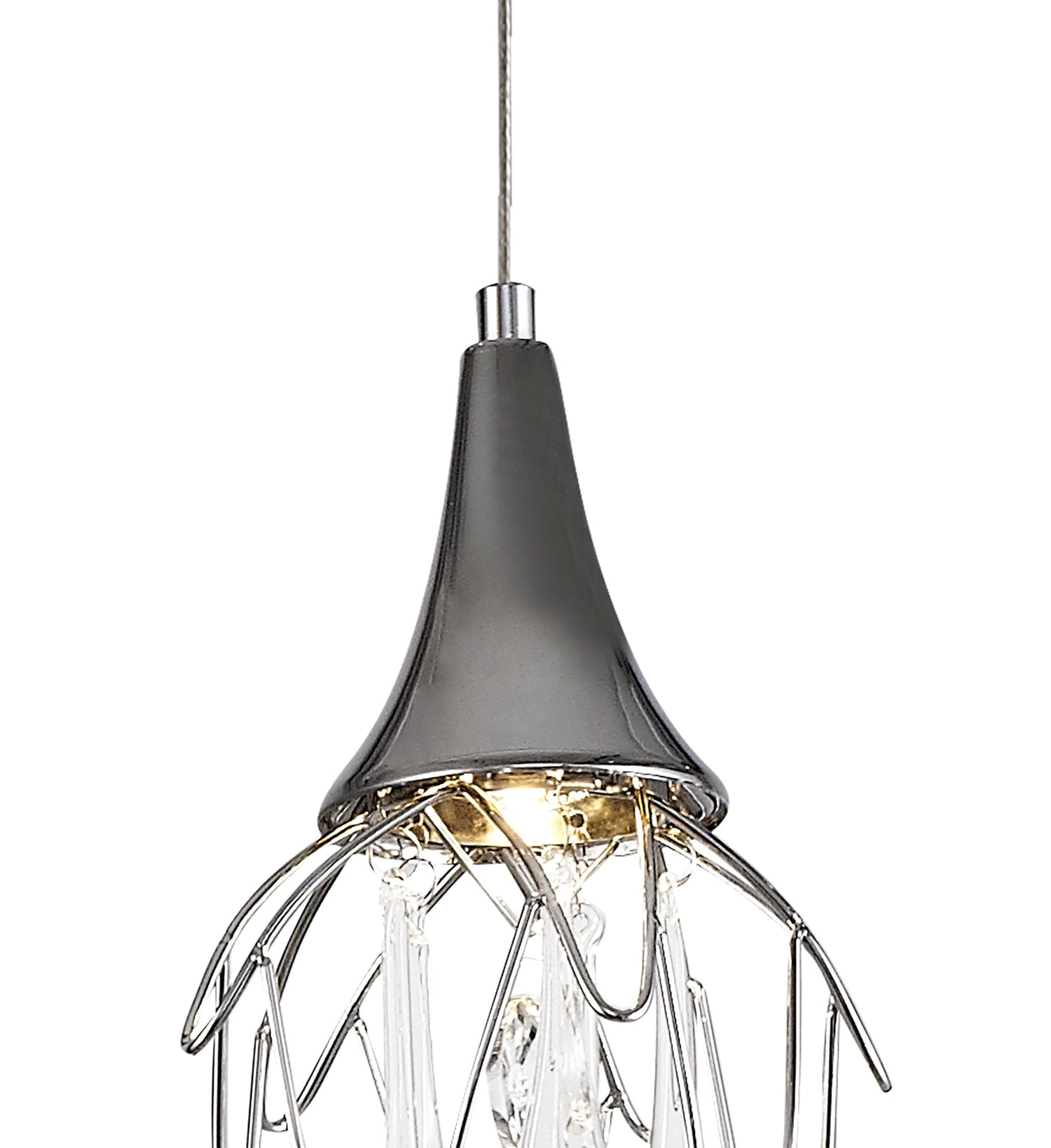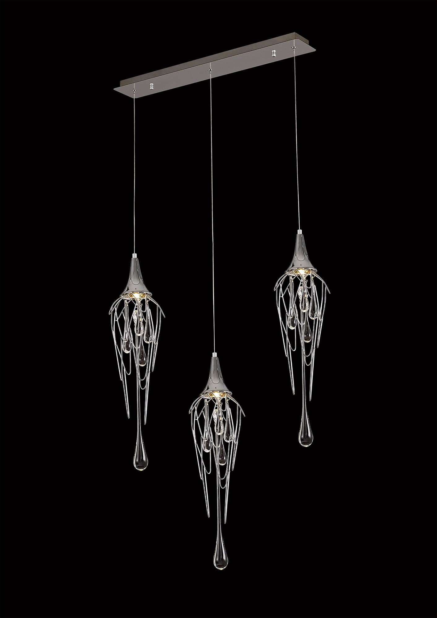 Itonda is a range of multiple pendants and complementing wall lamp, that takes the concept of a melting icicle one step further, not only using long clear crystal drops that mimic a falling drop of water but also shaping the frame which hosts them into a similar statement. The polished chrome metal frames are bent and curved like slowly cascading water which the smaller crystal drops and GU10 lampholders sit inside.