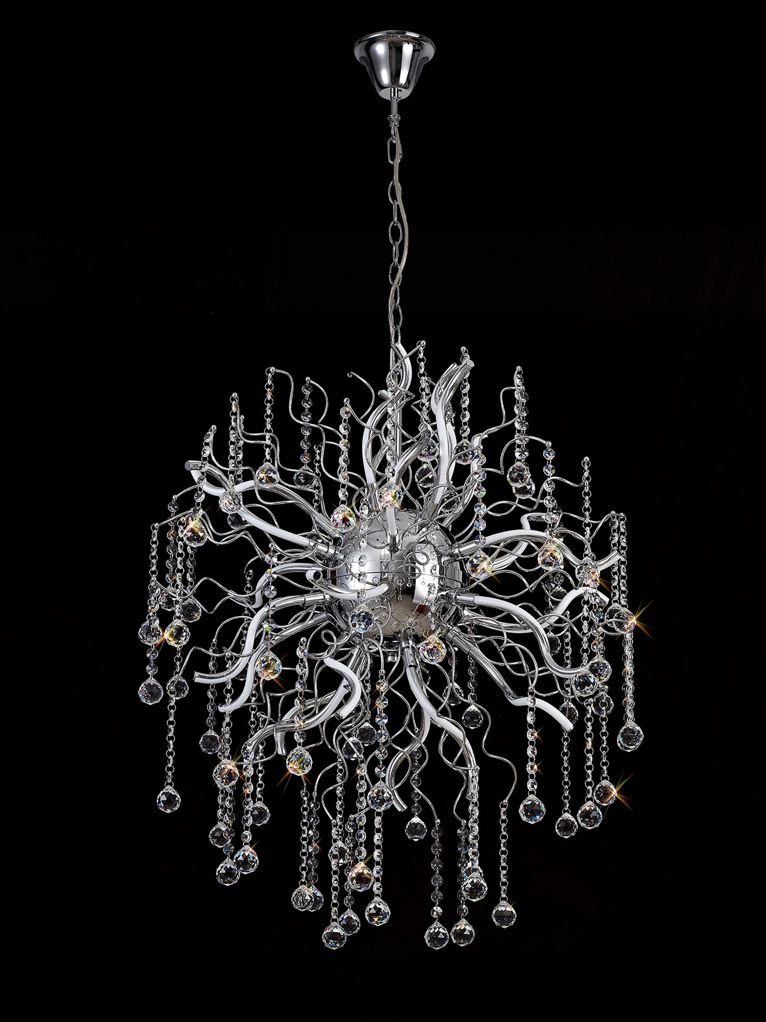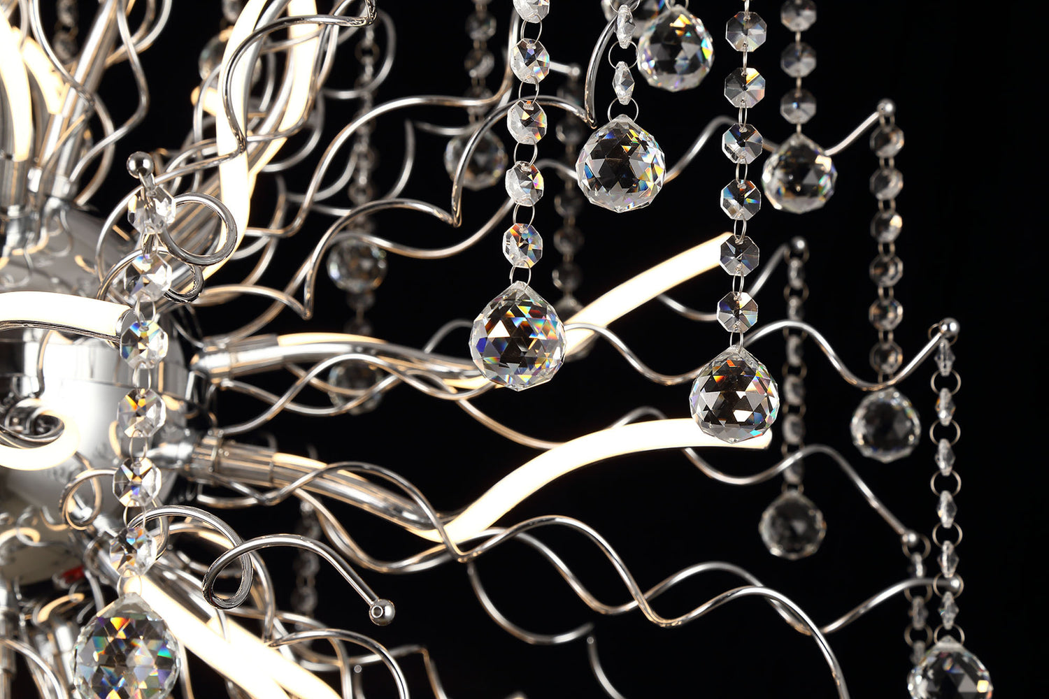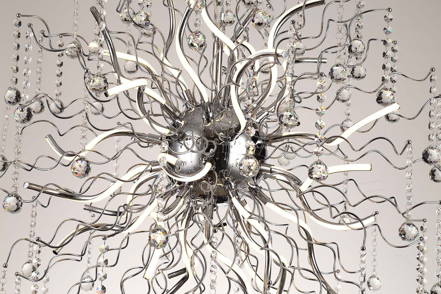 A selection of truly spectacular lighting fixtures, Jaba fuses an abundance of spiral LED arms with twists of polished chrome metal stems. The chrome corkscrews extend in different sizes and are dressed with strands of dazzling clear crystals buttons finished with clear crystal spheres. Its chaotic amalgamation of varied aspects introduces a mesmerizingly enchanting dimmable range.