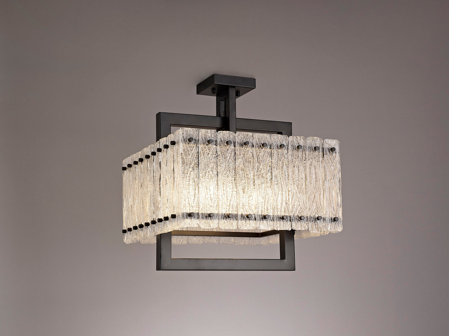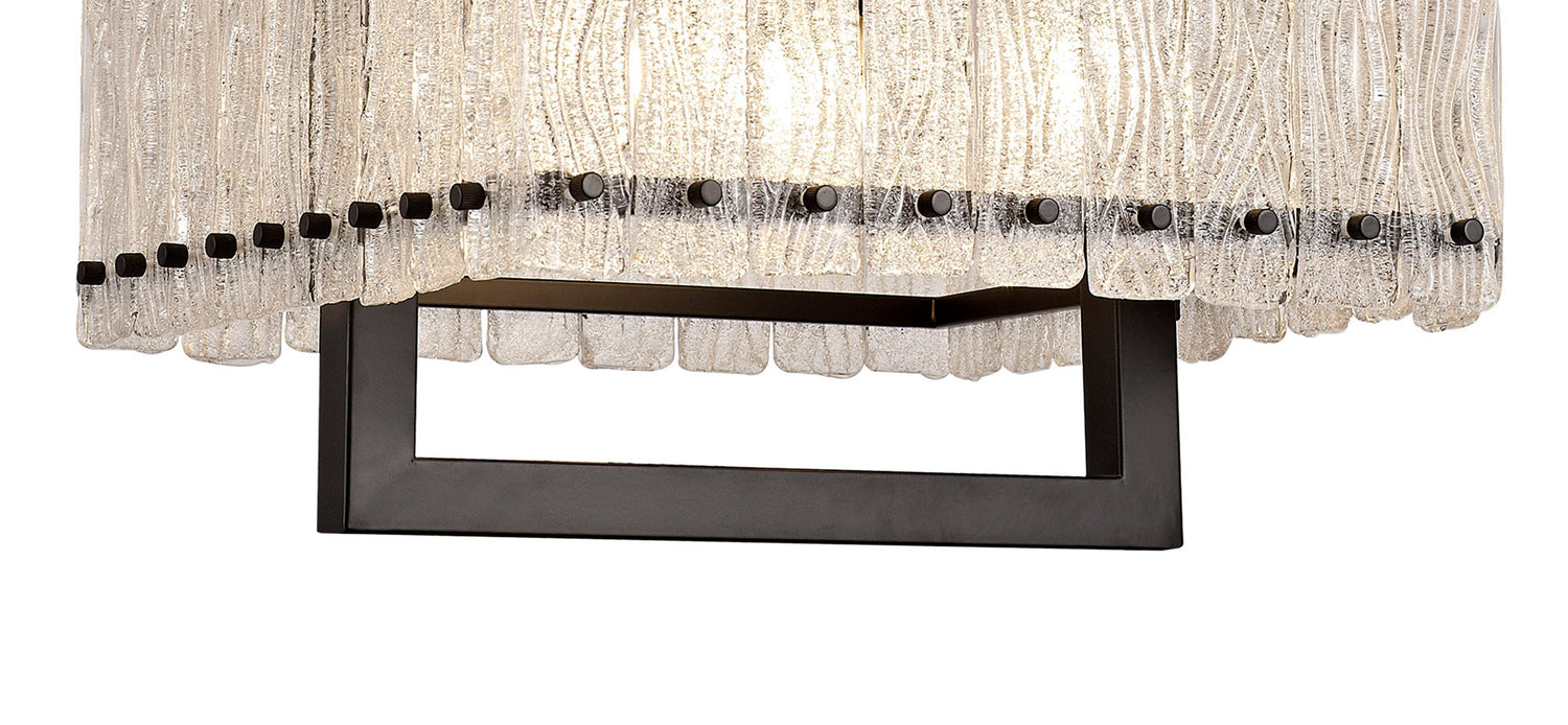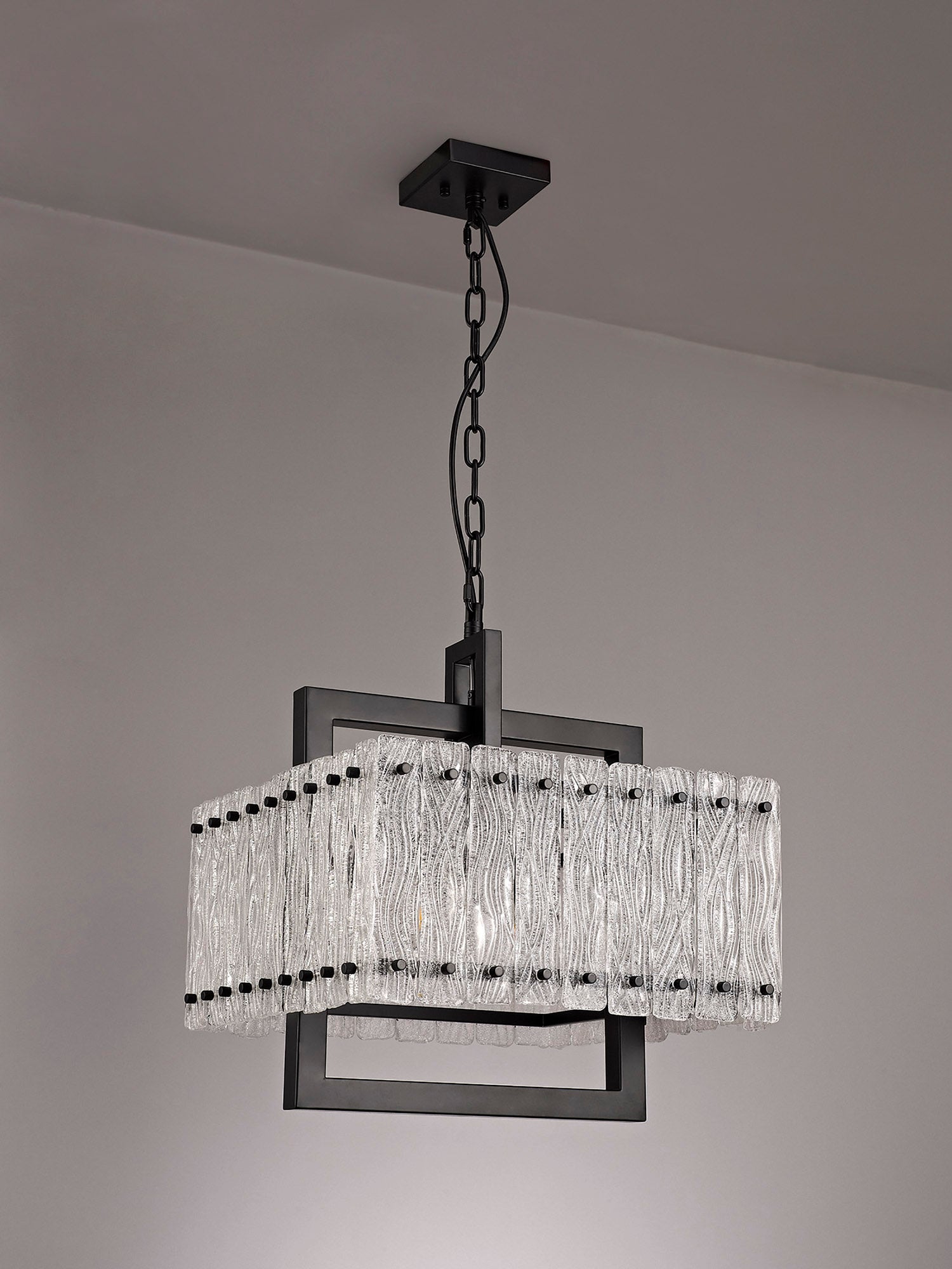 Sarin is another ingeniously invented decorative concept across a comprehensive range of pendants with matching wall, table and floor lamp. Rectangular pieces of glass with a crystallised frosted pattern are held onto the frames with black caps to match the colour of the frame. The fixings are positioned at either end of the glass so the theme appears as a reimagined xylophone. These unique features add a dramatic statement to their given setting.