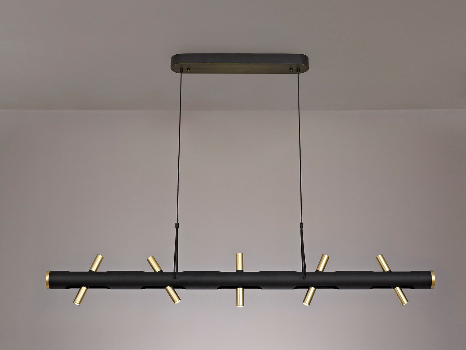 A fascinating original design concept within the Acamari range sees central tubular columns each with numerous protruding LED spotlight arms, combining an organic tree like design with modern technology. Not only is each fixture an eye-catching feature with their two tone sand black and gold colour finish, they also offer the opportunity to control the directionality of the light emitted as each LED arm is adjustable.