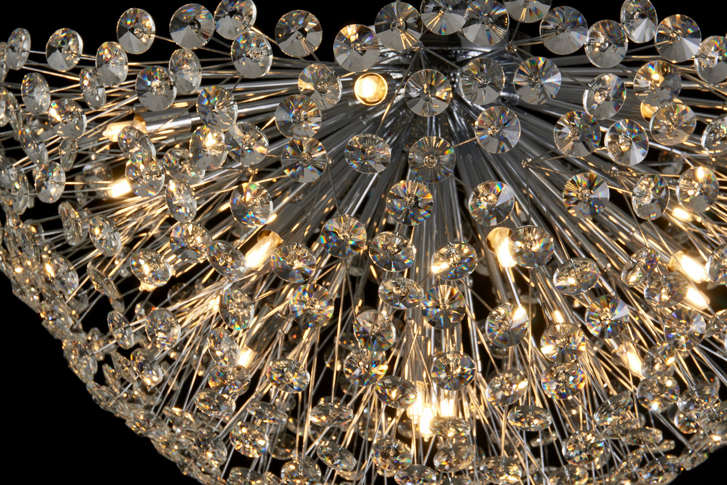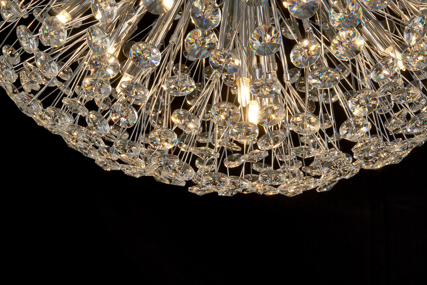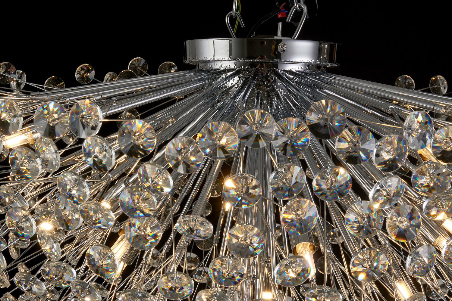 This beautiful comprehensive collection available in either a polished chrome or french gold colour finish, uses slim stems angled erratically to form an enchanting cluster of clear crystal disks. The lines of the central framework of round, tiered and oblong pendants, act as a base from which the crystals can sit around the G9 lampholders ensuring the light emitted from the chosen lamp refracts through each facette throwing sublime spectrums. An extensive range of products are available within the Bosona range, making it suitable for an array of applications.