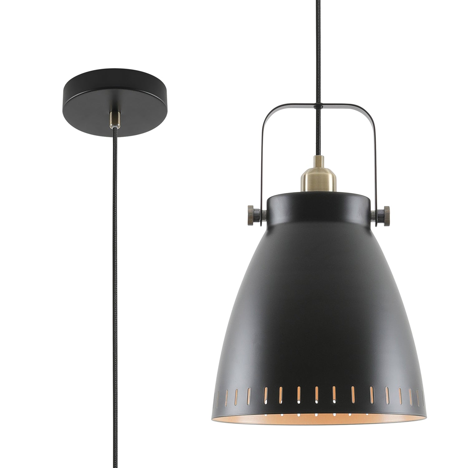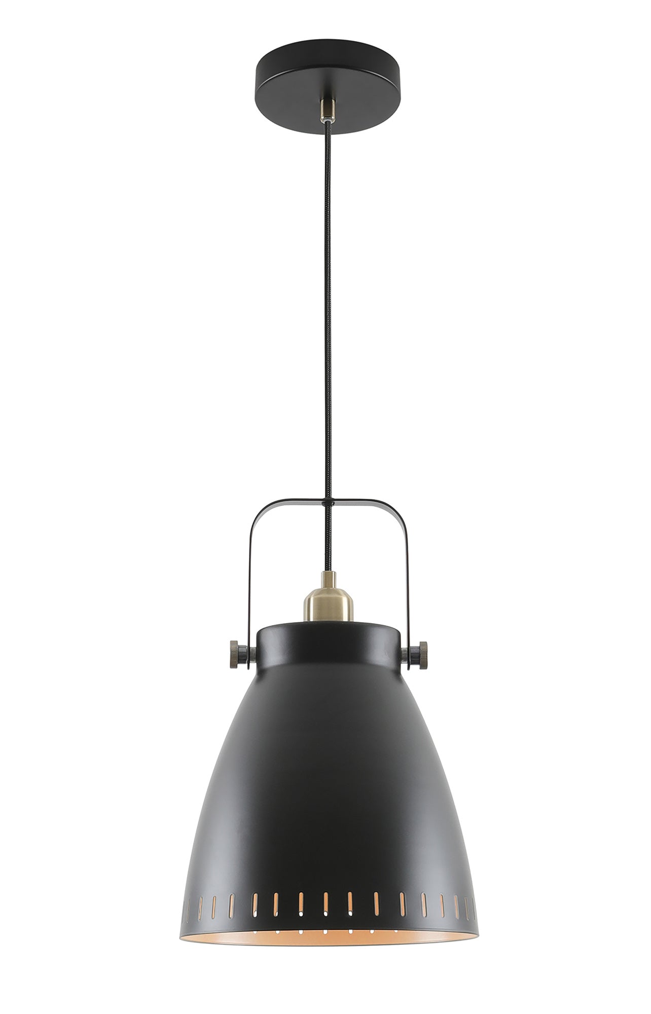Brachi is a comprehensive range which awards a number of original features to a classic design concept. A familiar metal, narrow domed shade houses the E27 lampholder on a selection of pendants and matching wall, table and floor lamp. Our designers have given these adjustable fixtures a modern twist firstly with the colour finishes of each component. The majority of the fittings have a matt black finish with the lampholders and adjustable bolts coated in antique brass. The most unique colour is on the inside of each shade which is a khaki finish; in order to further accentuate this whilst also adding another feature, the edge around the outer rims of the shades have small oval cut outs to display the inner shade and create fascinating shadows when illuminated.