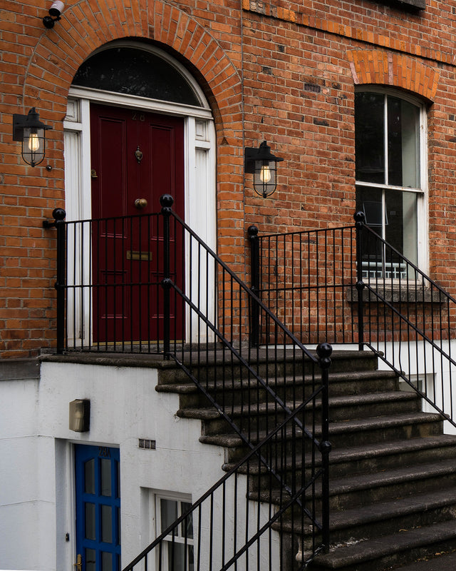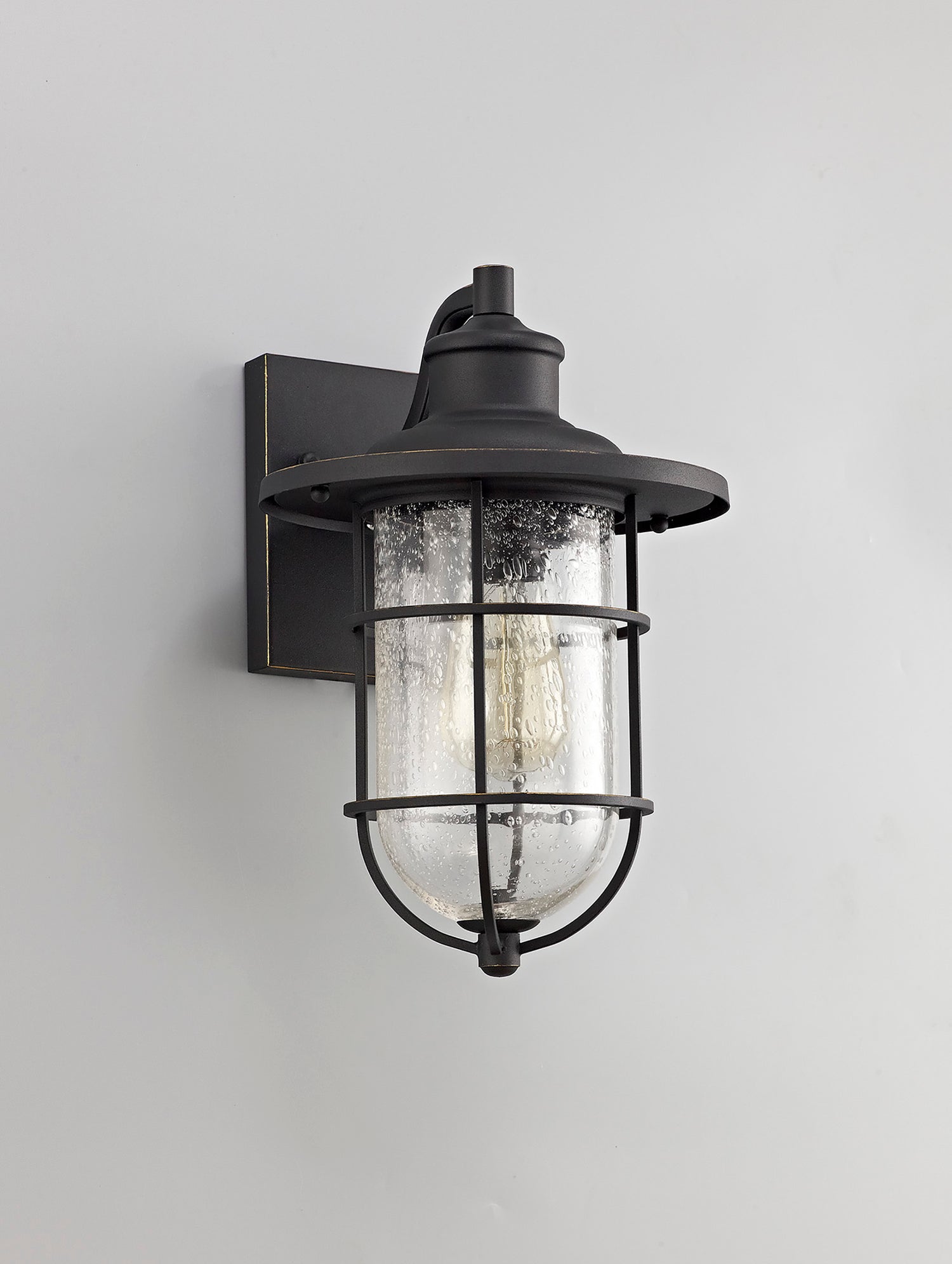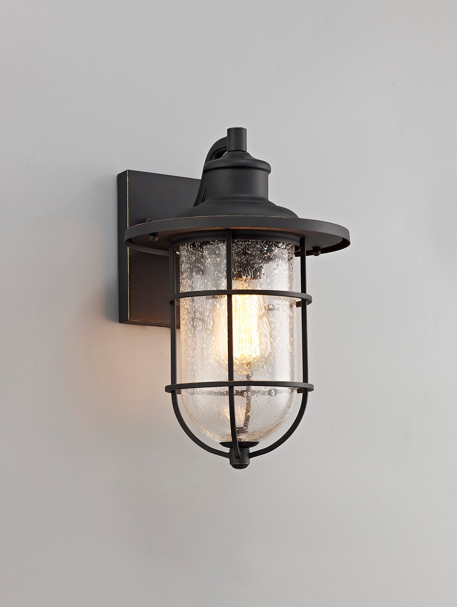 Bronxei's wall lamp and pendant follow a vintage theme reminiscent of the classic lanterns used on sailing boats. A clear bell shaped glass, formed with small bubbles to replicate fine drops of water, safely houses an E27 lampholder. The nautical nature of the gridline frame complements the glass feature whilst providing an added defence against outdoor elements. The black colour finish with gold trim also enhances the ranges durability.