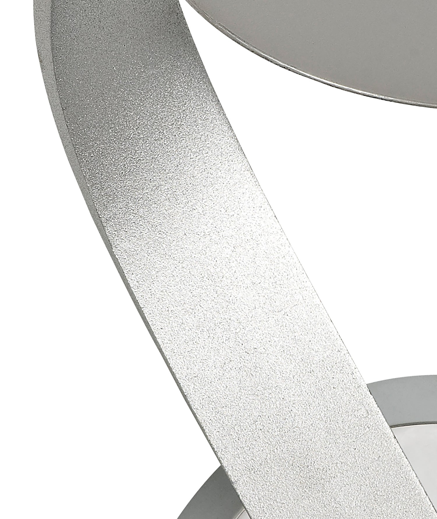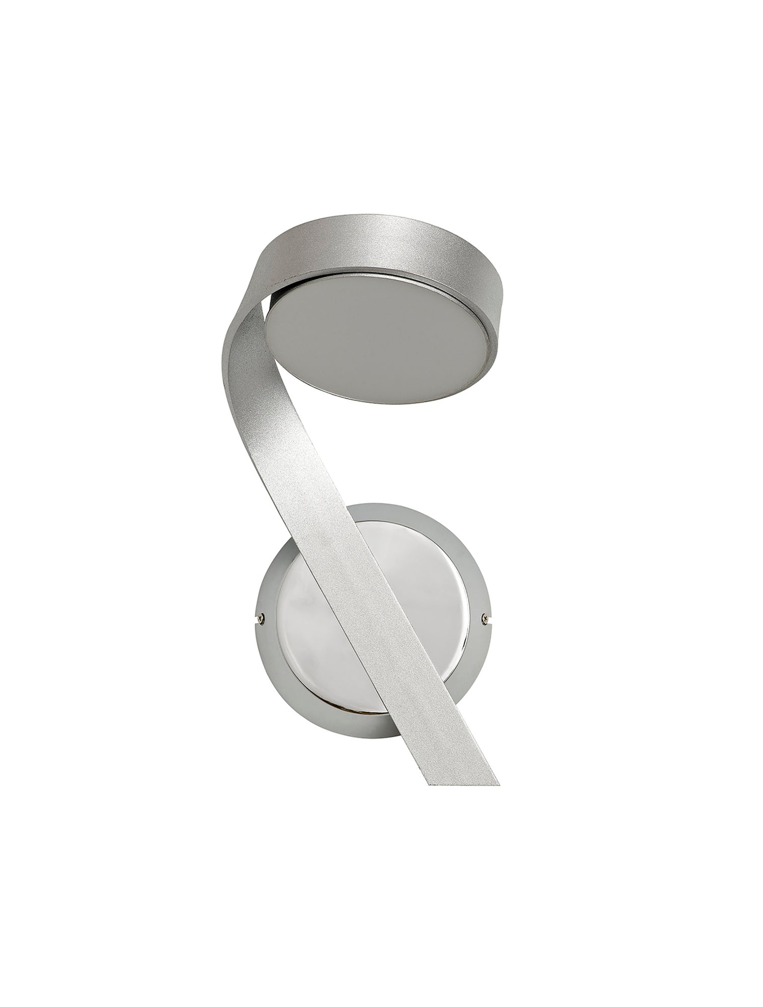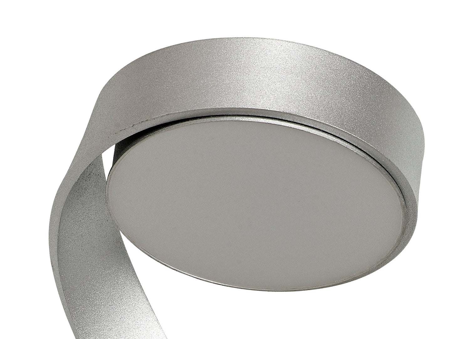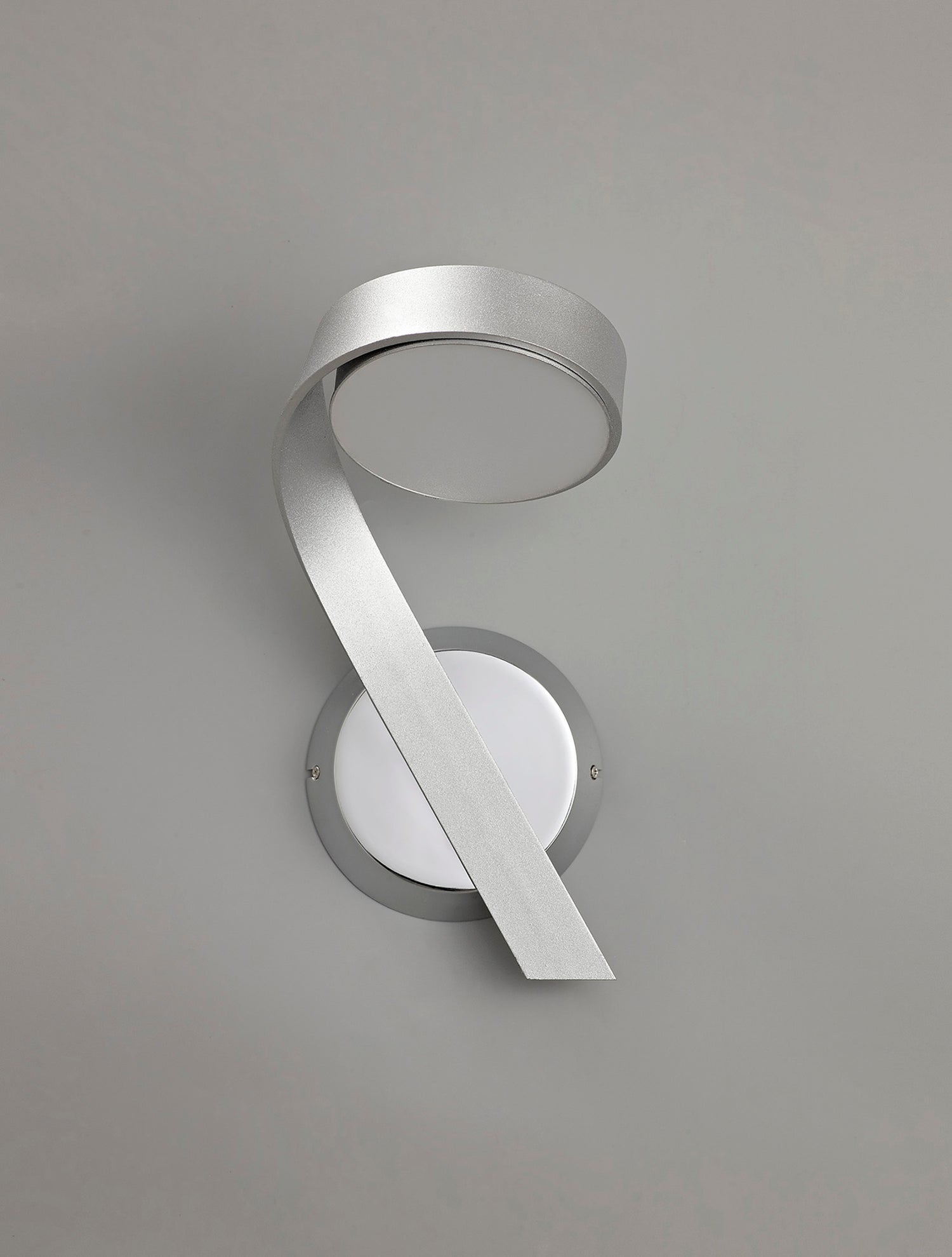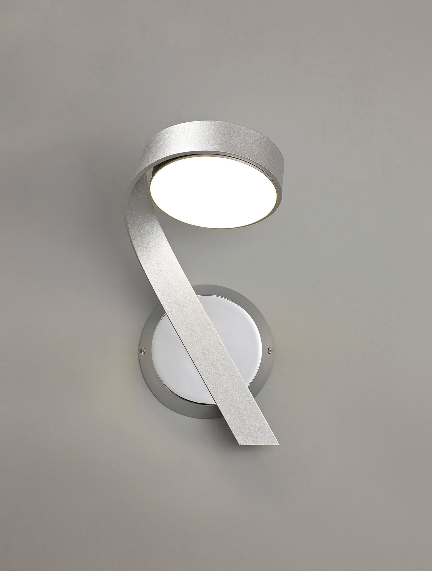 Capella presents silver framework manipulated to reflect lengths of ribbon which twist into a ring at the end. These rings encircle the round diffuser disk that houses the integral 3000K LEDs. The flat disk surface dispels the optimum amount of light possible to ensure there is no waste from the high wattage LEDs. The switched wall lights are available in both a left and right version, along with the table lamp and semi ceiling light, the fixing plates are also round in keeping with the rest of the fixture.