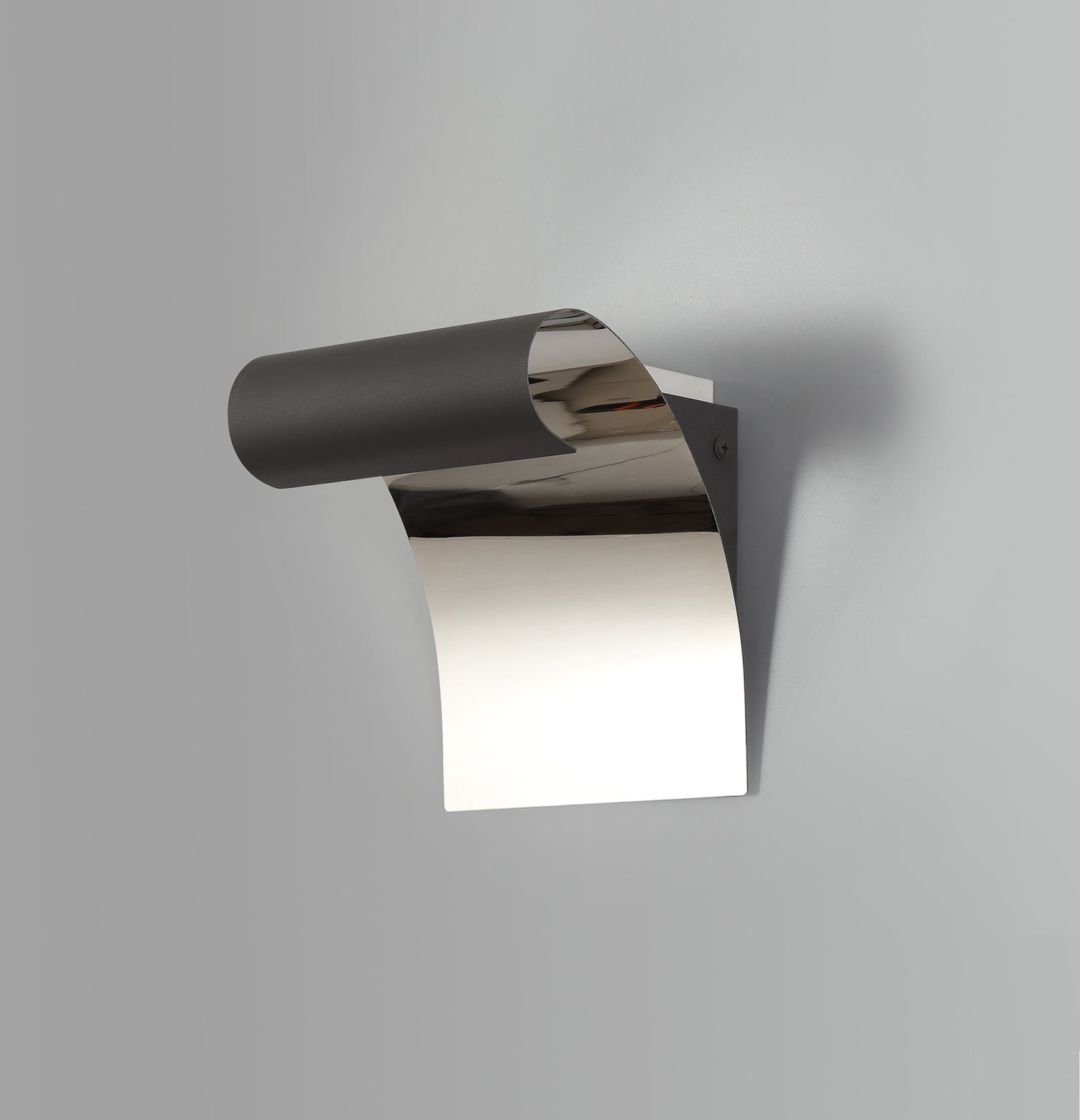 The rolling wave construct of these modern wall lamps, finished with either polished chrome or sand anthracite or polished chrome and sand white, could be used as a stand-alone decorative feature. Dubhe's unique form casts the light from the integral 3000K LEDs along the wall surface in an upward directionality. Each of the two sizes boast an impressive lumen output for wall lights of their size.
