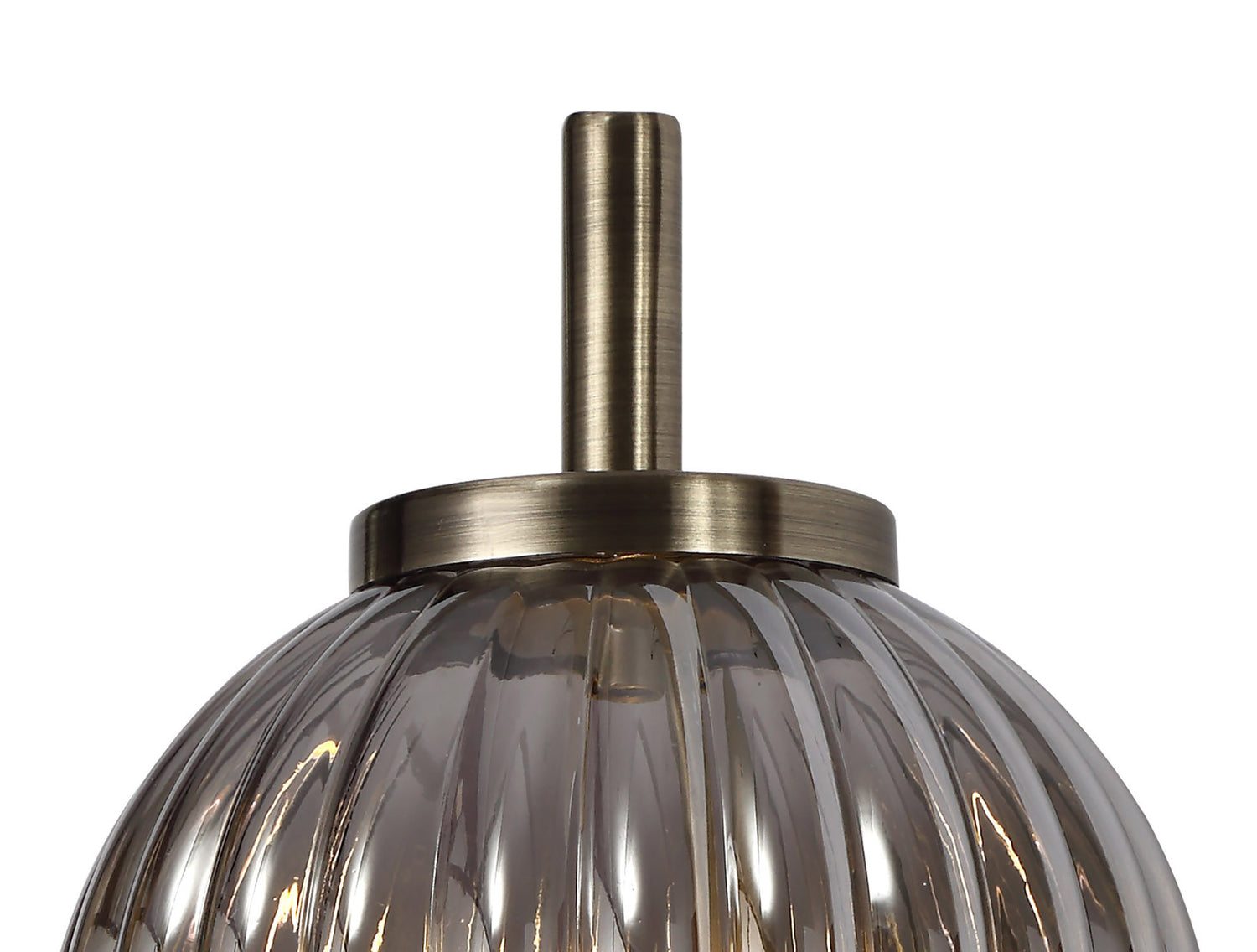 The pendant, table and floor lamp featured in the Franz range host a two tone effect produced by the smoked and amber globe glass. These glass pieces, encircling the G9 lampholders, have a ridged moulding enhancing the luminous sheen given off their coloured tint. The glass fixes to the slim tubular stem, finished in antique brass, in such a way that imitates beads being threaded along string. This peculiar composition can be partnered with one of the two wall lamps available with either a smoked or amber glass to tie in with the pendant, table and floor lamp.