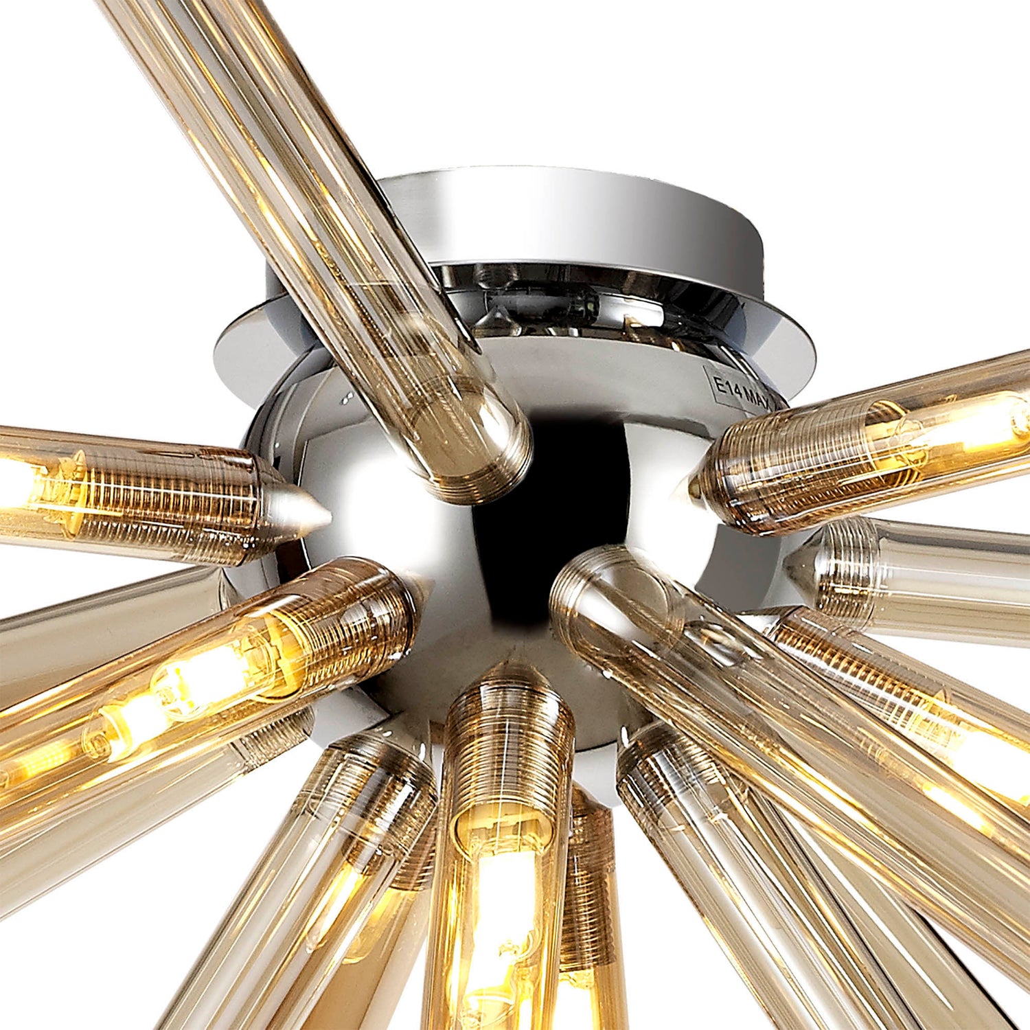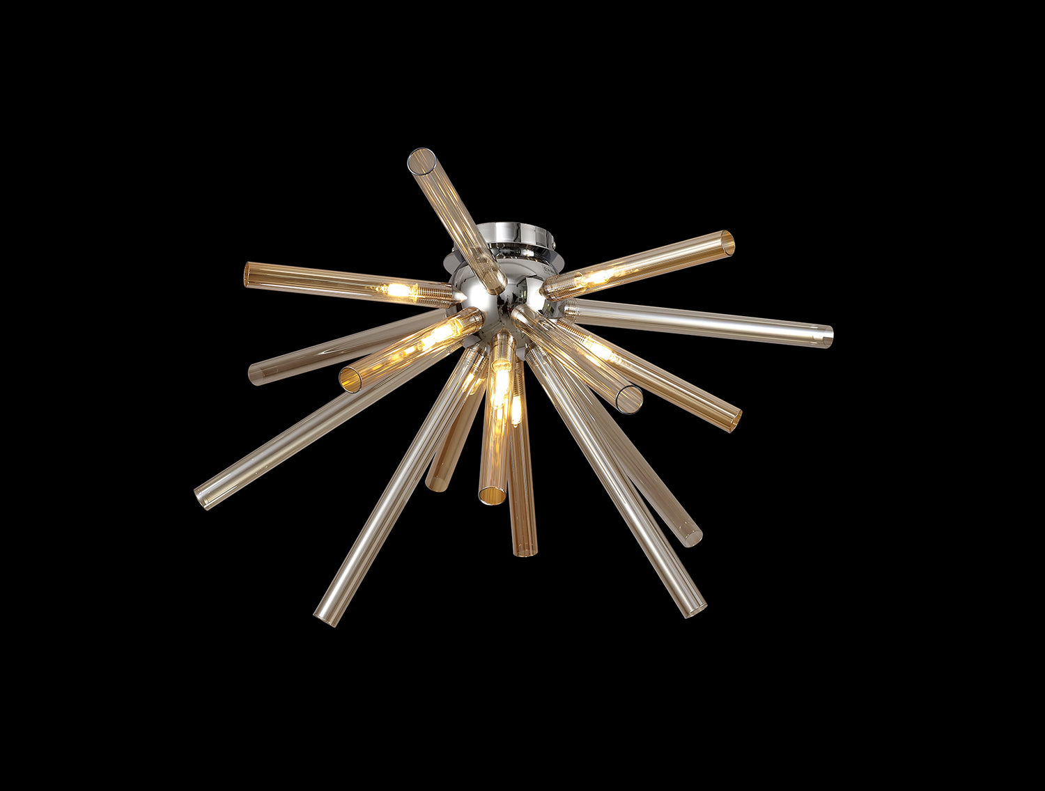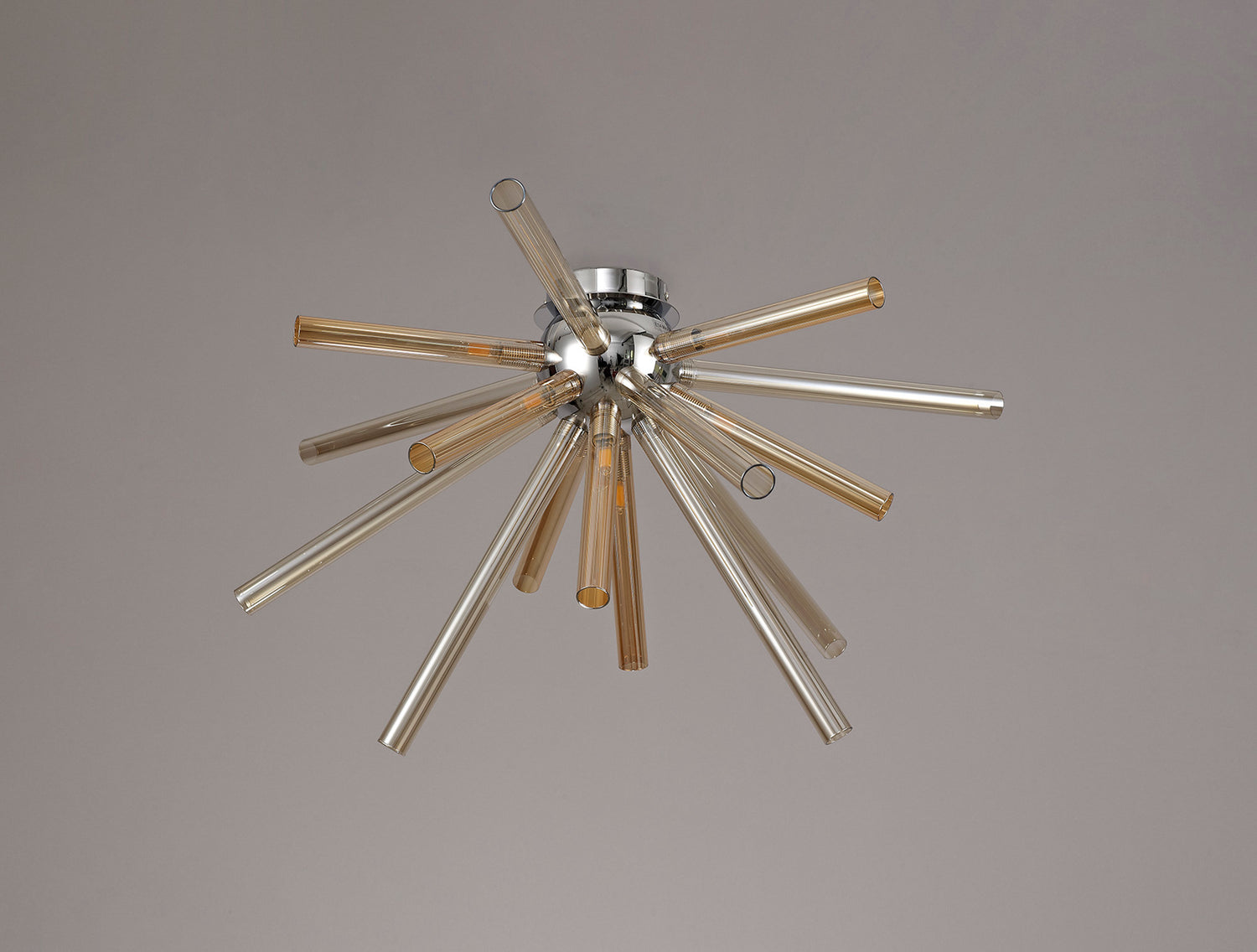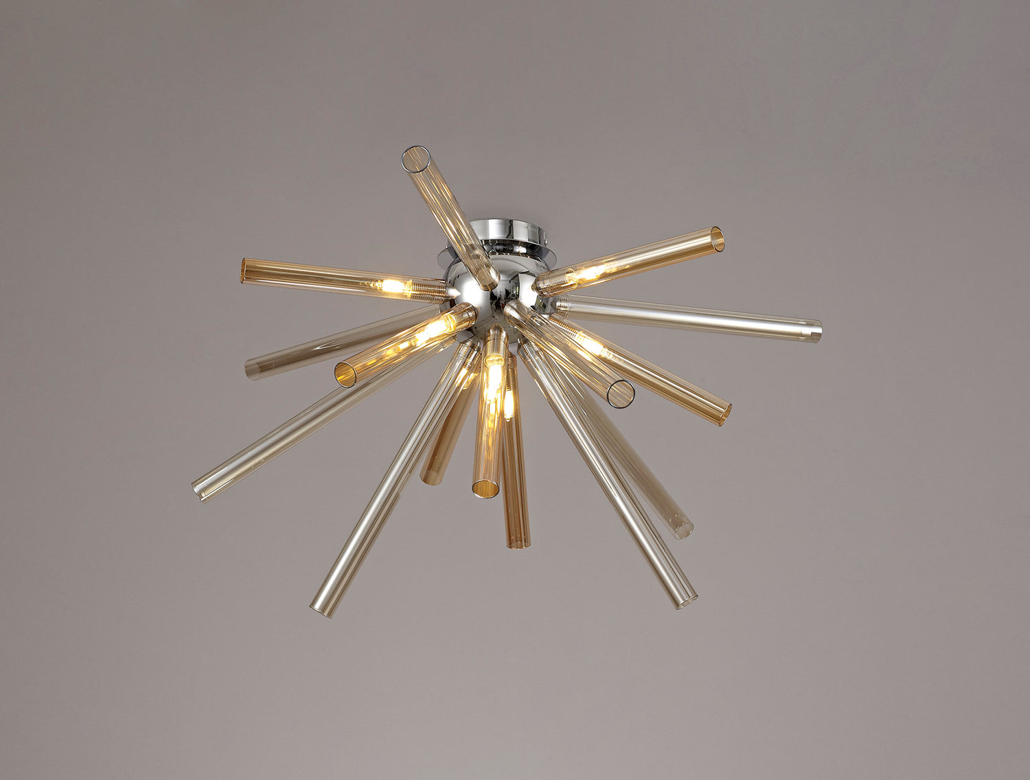 Fulu has an abundance of narrow glass tubes in various sizes which are cleverly arranged into a sputnik composition, devising a larger three dimensional effect around the polished chrome central orb frame. This statement design is applied to both a sixteen light pendant and an eight light semi-flush ceiling fixture, with each G9 lampholder situated within the glass tubes. In order to supply an option for multiple colour schemes each polished chrome item is available with either amber/champagne, chrome/clear or smoked frosted glass pieces.