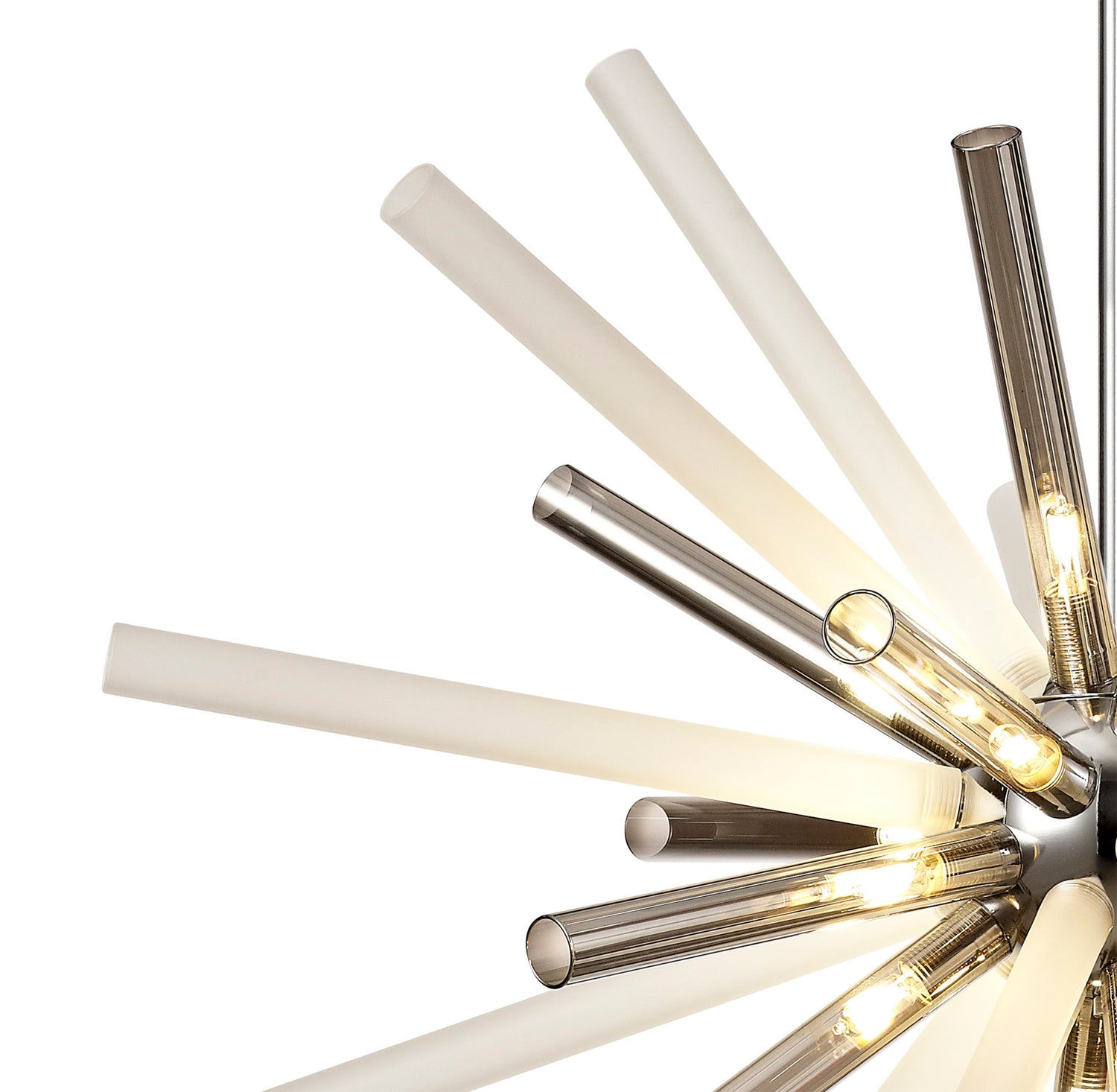 Fulu has an abundance of narrow glass tubes in various sizes which are cleverly arranged into a sputnik composition, devising a larger three dimensional effect around the polished chrome central orb frame. This statement design is applied to both a sixteen light pendant and an eight light semi-flush ceiling fixture, with each G9 lampholder situated within the glass tubes. In order to supply an option for multiple colour schemes each polished chrome item is available with either amber/champagne, chrome/clear or smoked frosted glass pieces.