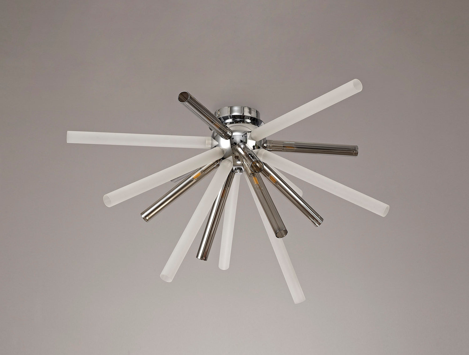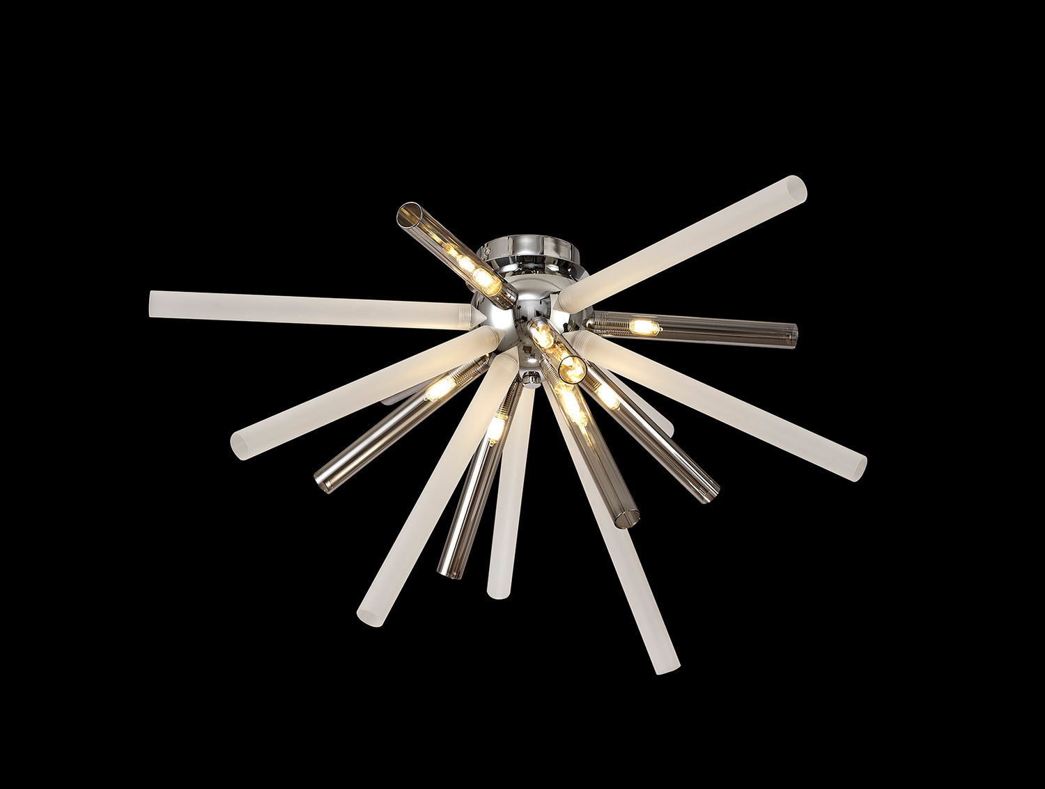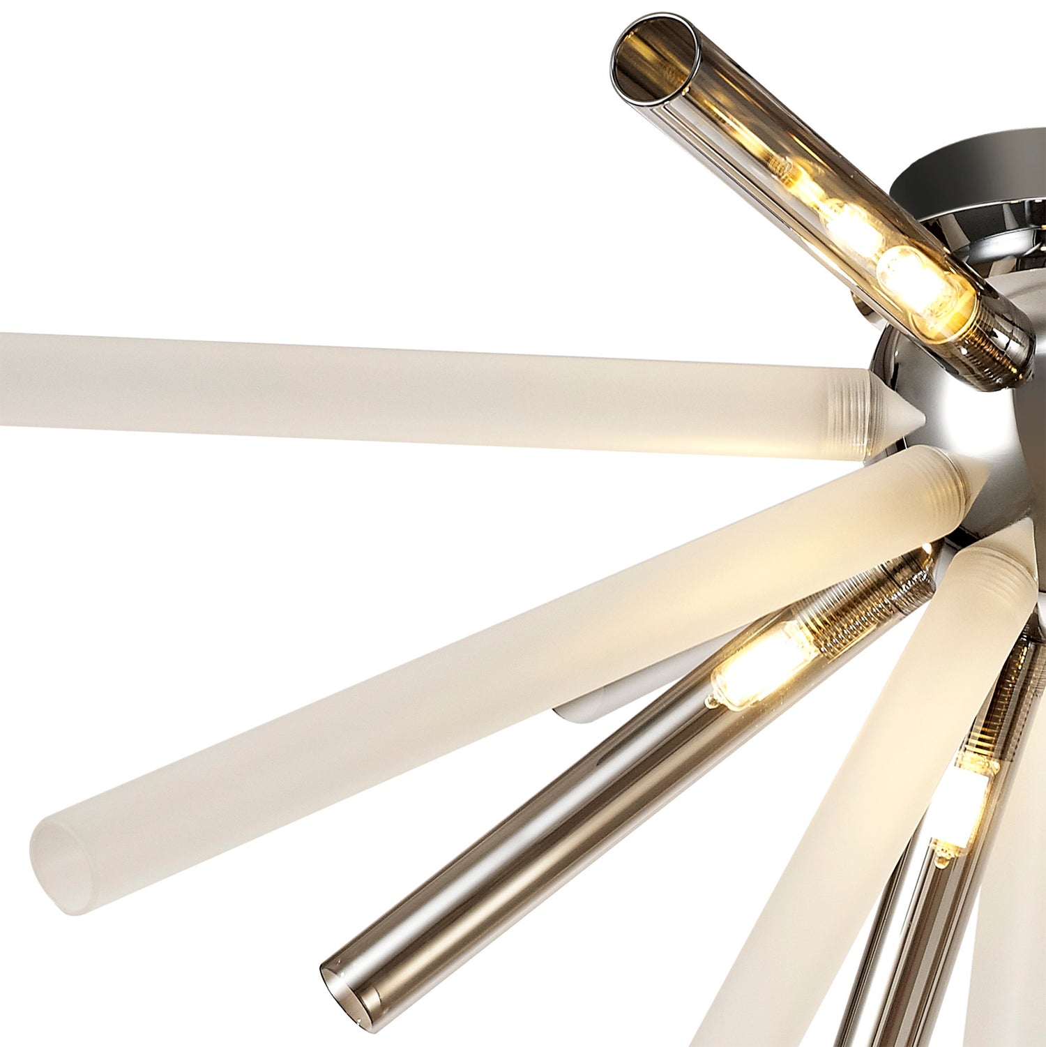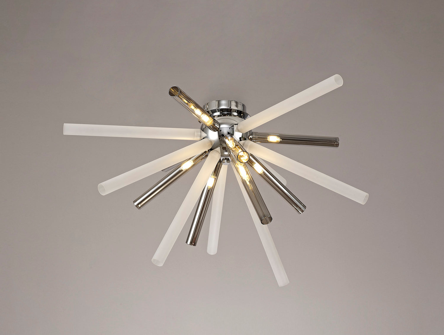 Fulu has an abundance of narrow glass tubes in various sizes which are cleverly arranged into a sputnik composition, devising a larger three dimensional effect around the polished chrome central orb frame. This statement design is applied to both a sixteen light pendant and an eight light semi-flush ceiling fixture, with each G9 lampholder situated within the glass tubes. In order to supply an option for multiple colour schemes each polished chrome item is available with either amber/champagne, chrome/clear or smoked frosted glass pieces.