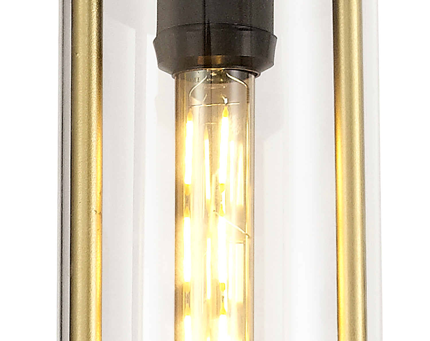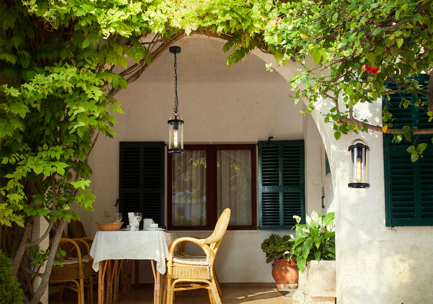 Gakyid is another unique concept for your outdoor lighting needs, this collection of black cylindrical frames with clear glass panes are enhanced by the substantial gold metal arch that begins within the bottom of the frame and protrudes above the top of each fitting. On the small and large wall lamp this mimics a sort of handle effect whilst on the pendant fitting acts as a fixture to which the chain is held.
