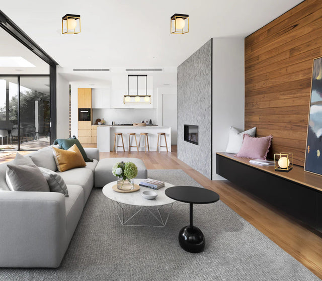 The clean square shapes of this comprehensive range Hamel, emit a slightly art deco feel. The painted gold frame perfectly offset against the matt black plates outlines the E14 lampholders to form an open faced cube shape, producing an ambient source of light in a stylish, fashionable feature.
