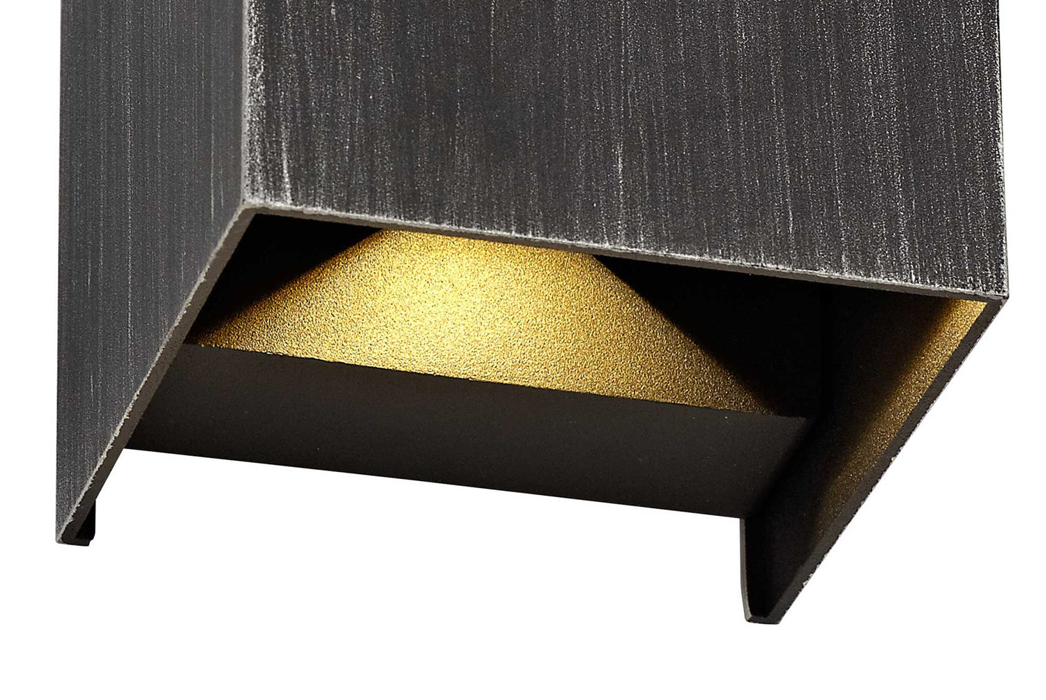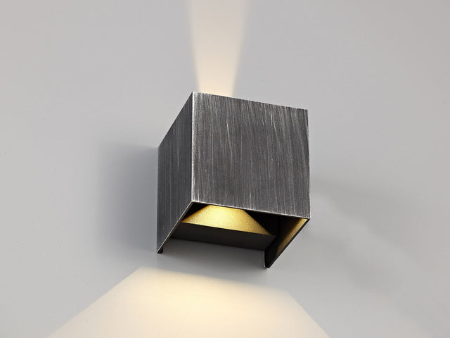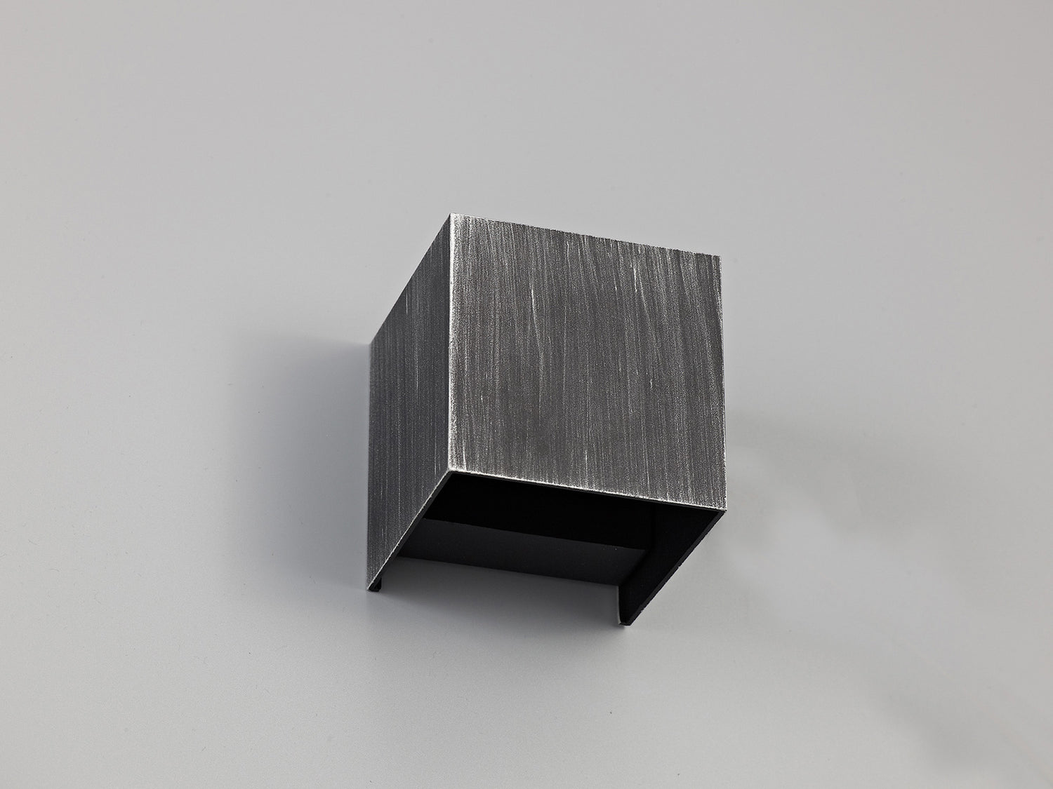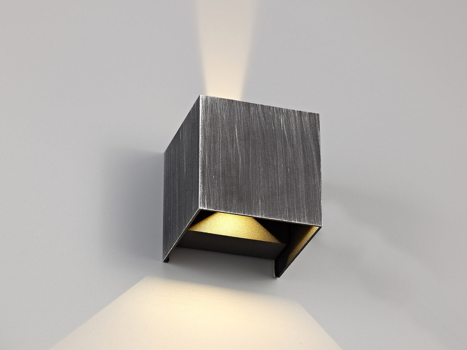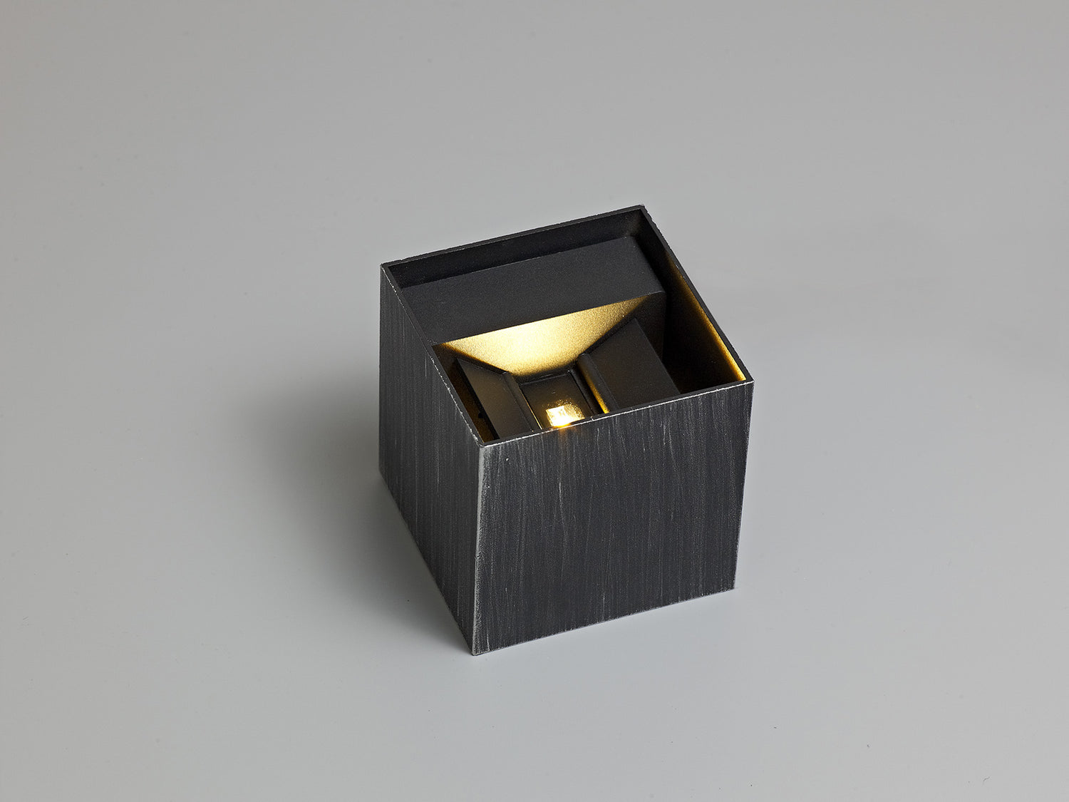 Jishu's unique finish effectively reimagines a chalkboard imitation with the brushed black and silver layered to mimic white chalk swept across the dark backdrop. This worn, raw quality would be the perfect outdoor lighting solution where an urban, industrial atmosphere is being created. With the integral LEDs projected in two directions the functionality of the wall lamp is just as idyllic for outdoor use as its design.