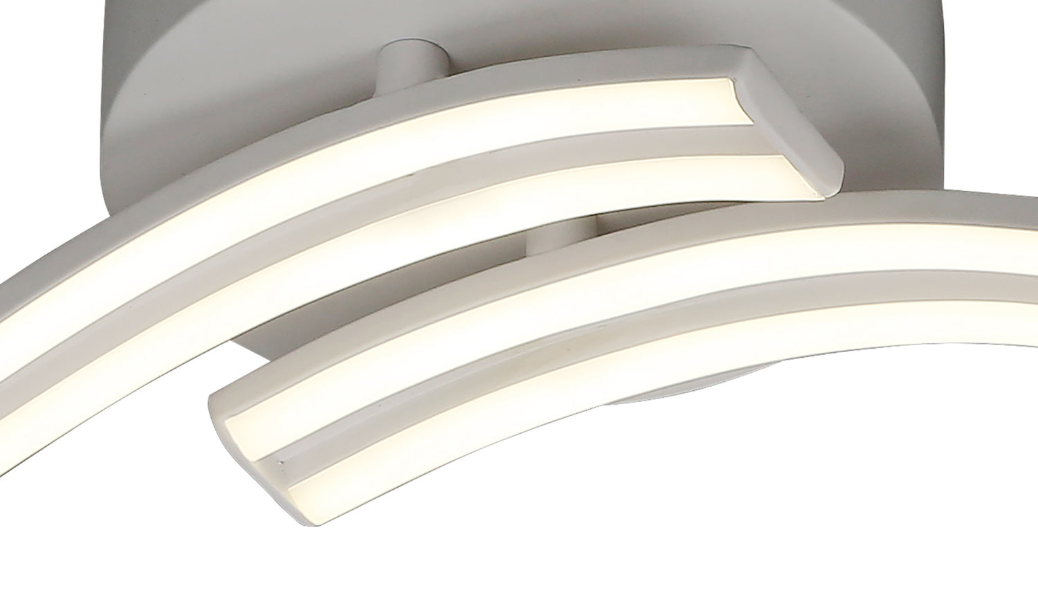 A visually intriguing collection, Jupit's ceiling fixtures host slim, narrow strips of diffused 4000K light. A line of white frame running along the middle of each piece creates an aesthetic impact furthering the waved design aspect. The two light ceiling fixture and wall lamp offer a streamlined linear option whereas the three, five and six light overlap the arms to form a more circular pattern with the six light also including a three step dimming function. This collection also includes a matching table and floor lamp.