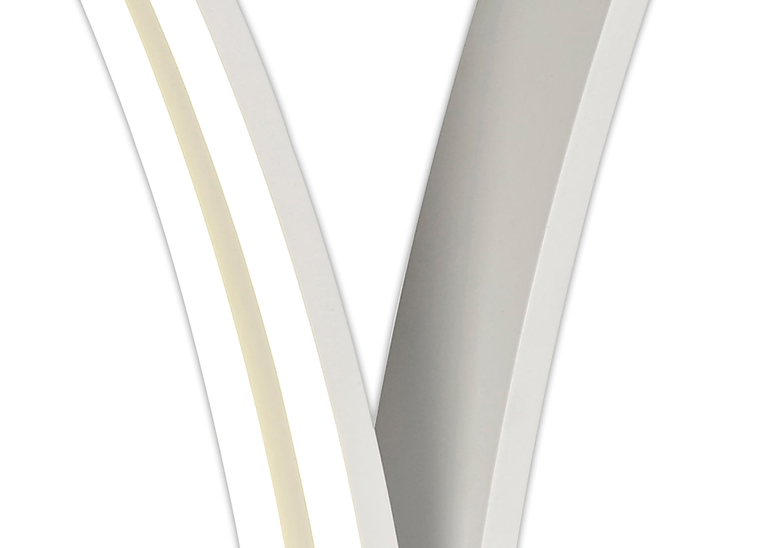 A visually intriguing collection, Jupit's ceiling fixtures host slim, narrow strips of diffused 4000K light. A line of white frame running along the middle of each piece creates an aesthetic impact furthering the waved design aspect. The two light ceiling fixture and wall lamp offer a streamlined linear option whereas the three, five and six light overlap the arms to form a more circular pattern with the six light also including a three step dimming function. This collection also includes a matching table and floor lamp.