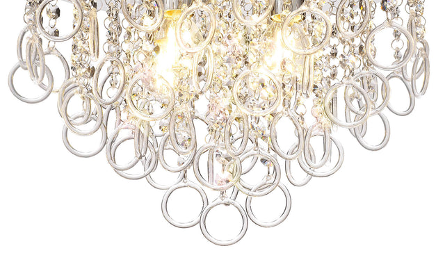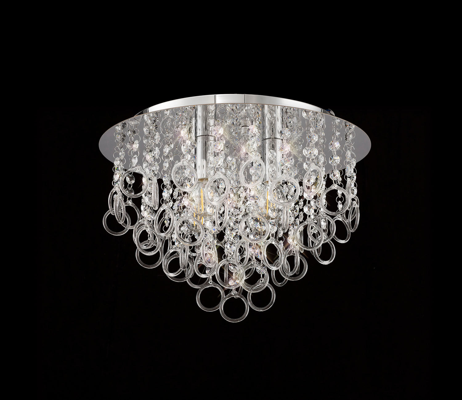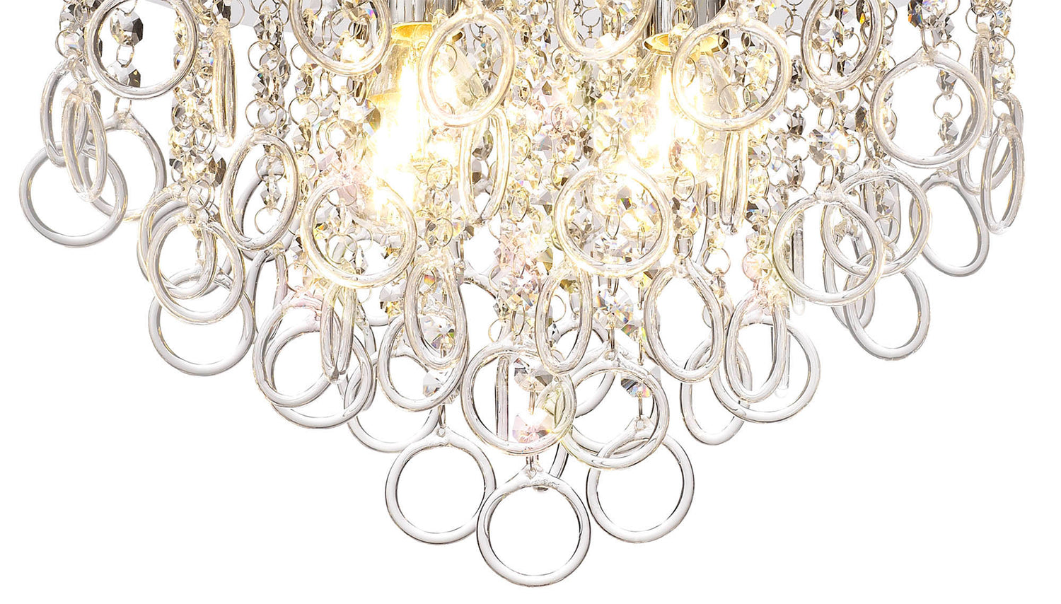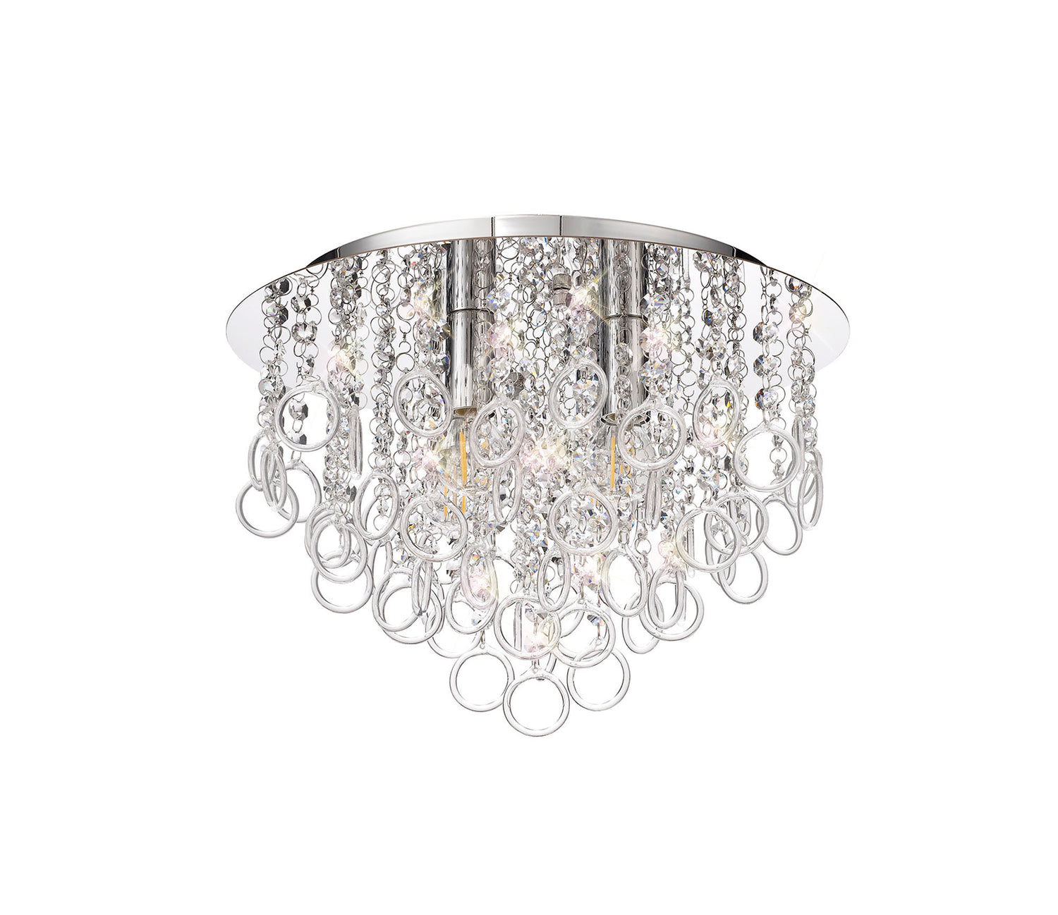 This is a classically stunning range of flush ceiling lights enabling the consumer to add sparkle and class to any low ceiling room. Loppu's round polished chrome frames are available in two different sizes and use crystal components to complement the shape of the ceiling plate. The circular frame hangs strands of clear crystal buttons with a new unique glass hoop drop.