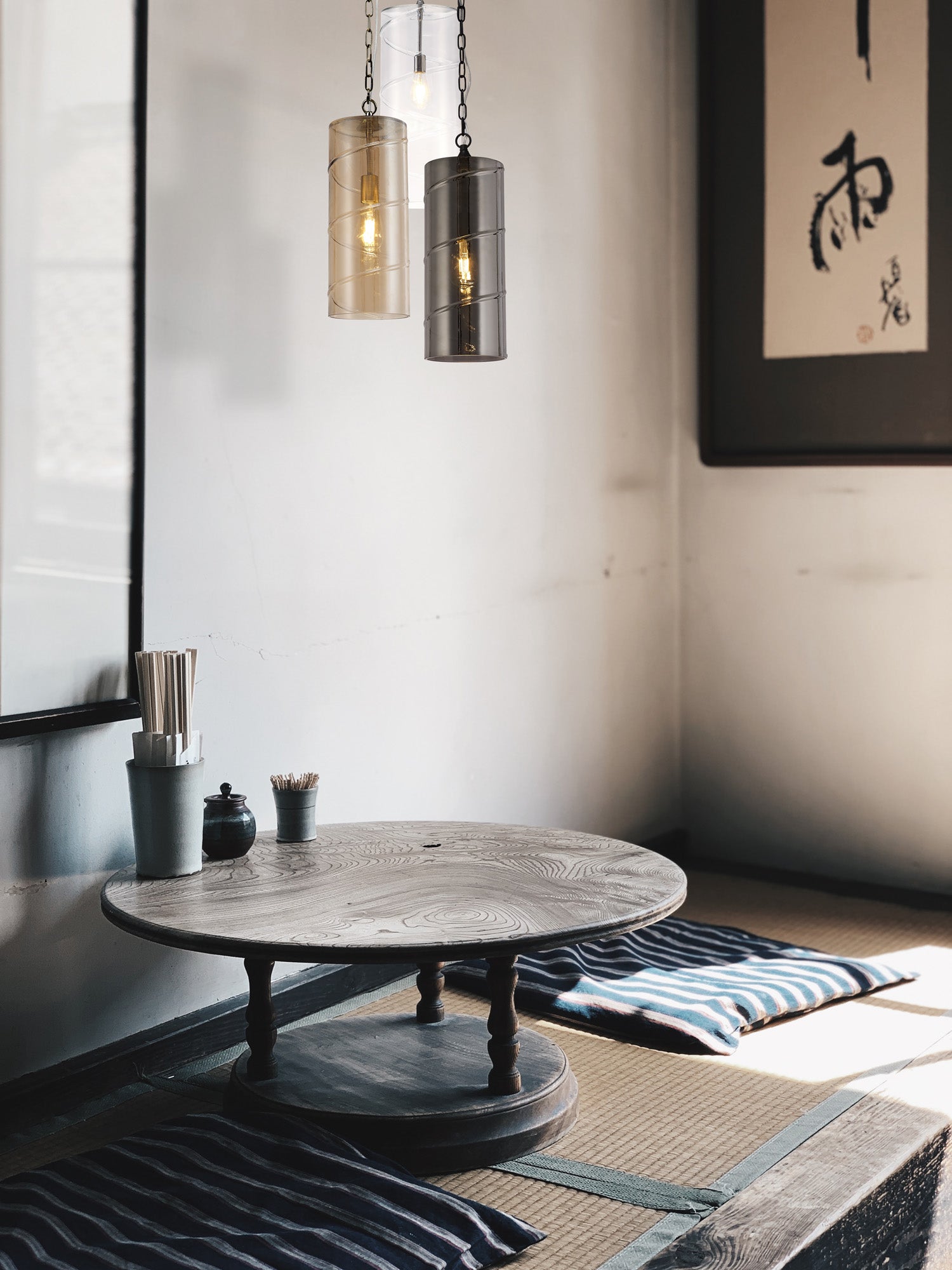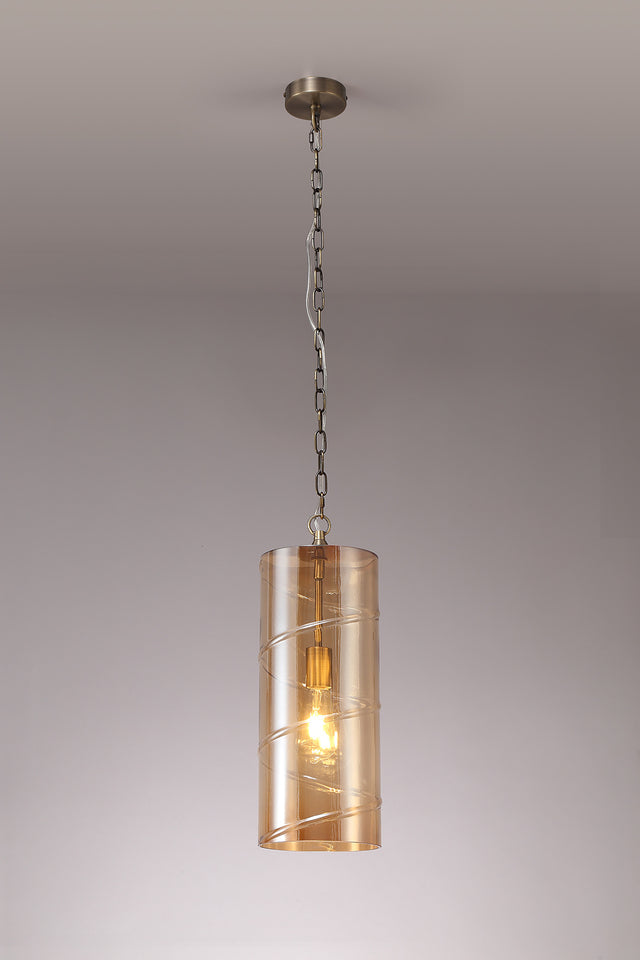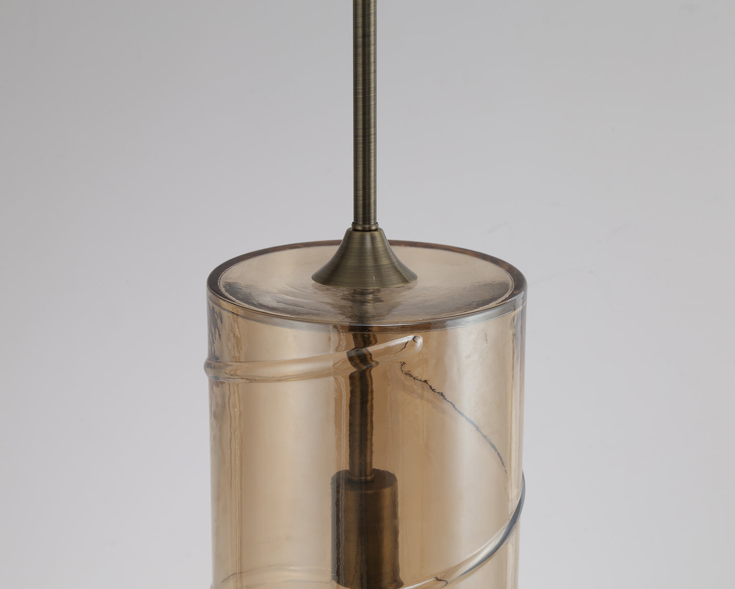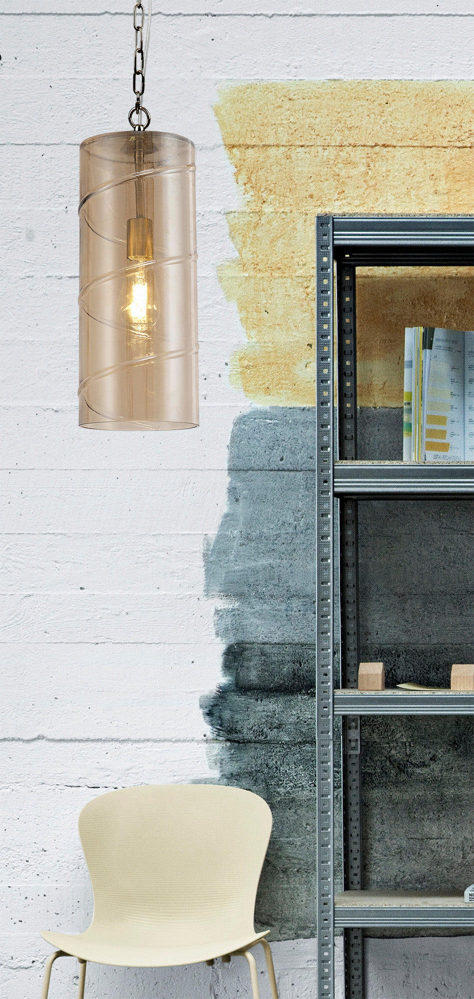 These cylindrical glass pendants present an inspired moulding creating a three dimensional spiral protrusion, extending around the shade. The three different frame colours available in the Ludo range correspond the colour tint used for the glass itself; antique brass with amber glass, matt black with smoked glass or polished chrome with clear glass.