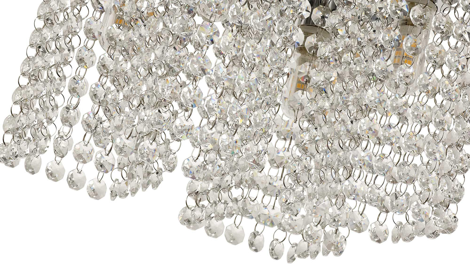 Matar's simple square framework finished in polished chrome provides an unassuming backdrop to ensure the focal point of the range are the strands of clear crystal buttons. Drops of crystal buttons are a staple for many crystal fittings however Matar arranges these pieces into cohesive square shapes. When combined with the generous number of crystals on each drop the format creates a crystal cube around the G9 lampholders. The light from the G9's refracts through the crystals forming interesting spectral patterns. An encasing around the G9 lampholders gives each light in the range an IP44 rating offering a stunning crystal option for bathrooms.