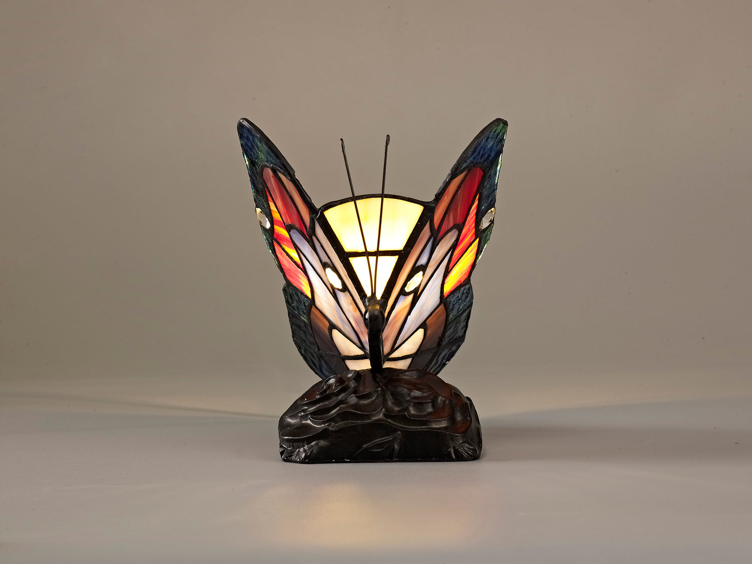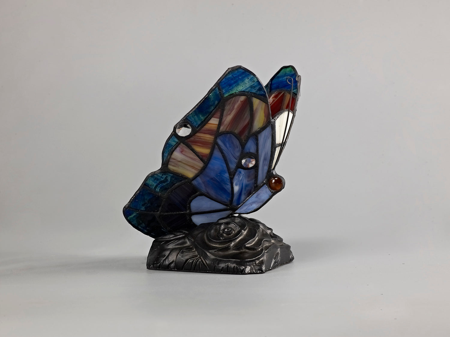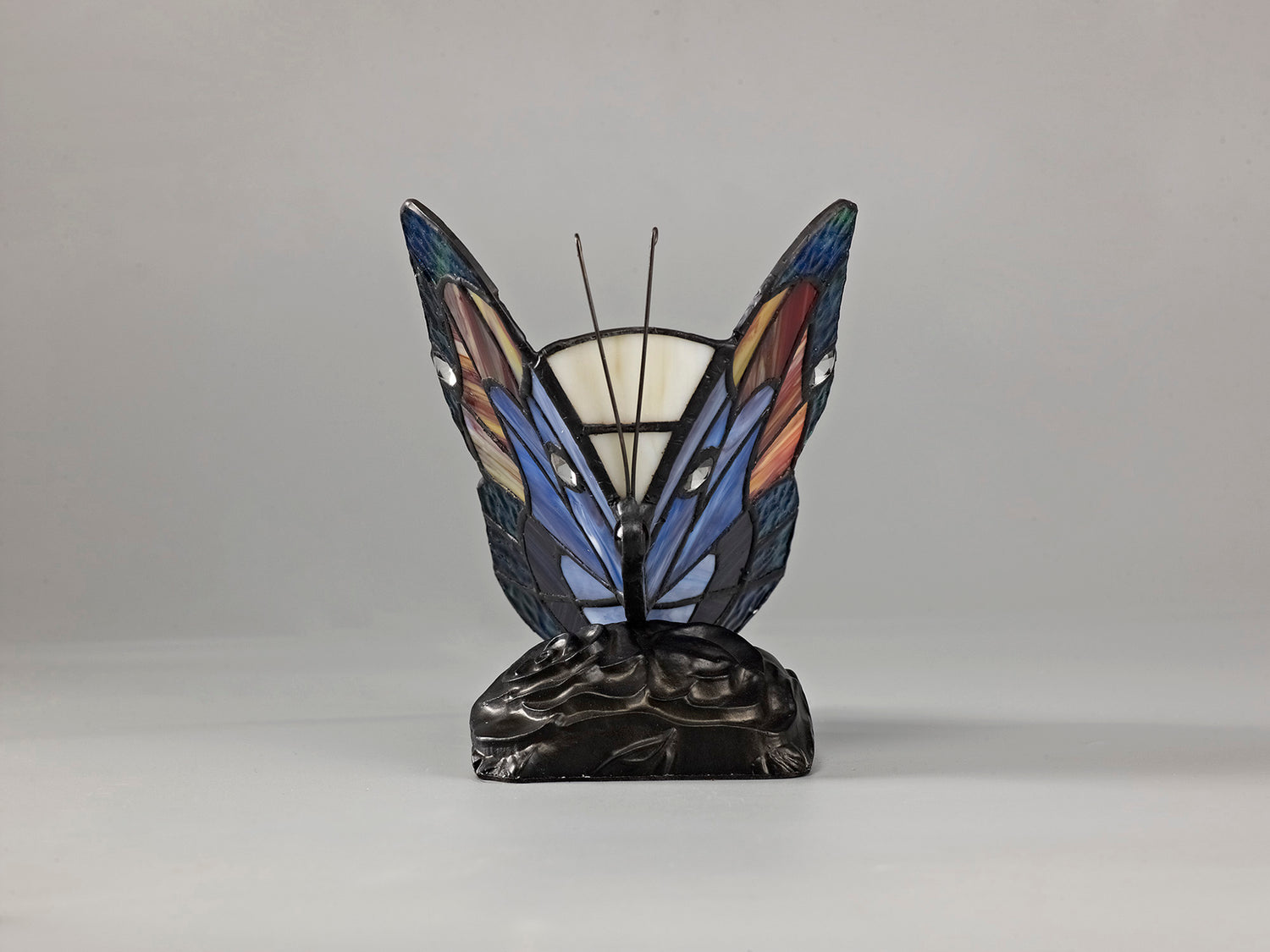 This stunning collection of traditional butterfly table lamps are available in multiple colours and wing shapes in natural reflection of the living creatures. Created from classic Tiffany glass shapes and patterns the colours available range from soft pale blues and pinks to vivid reds and greens. The black textured mounts upon which the glass sits are the perfect, authentically raw base to emphasise the coloured glass. Mizor is both an enchanting ambient illumination and beautiful sculpture.