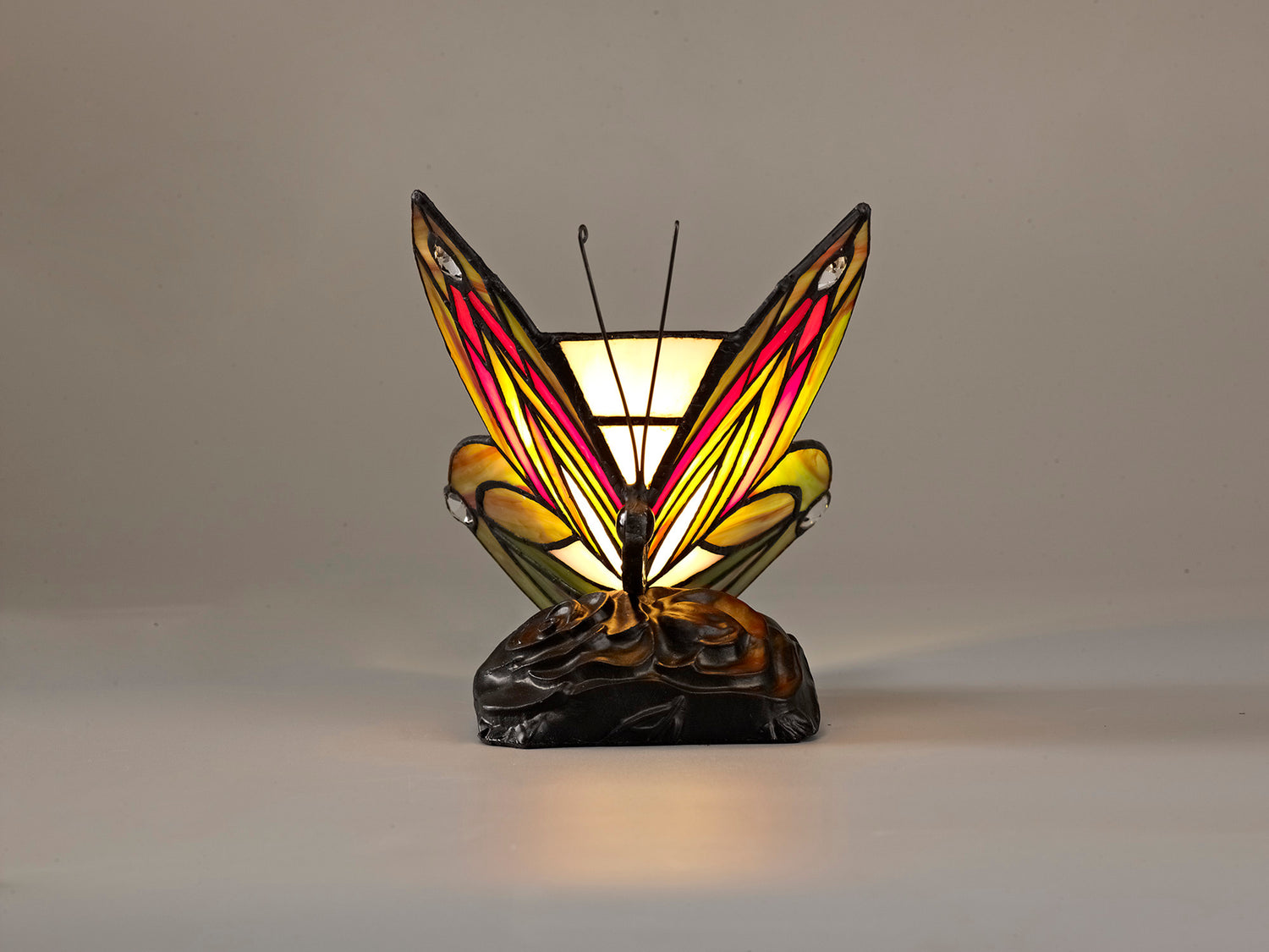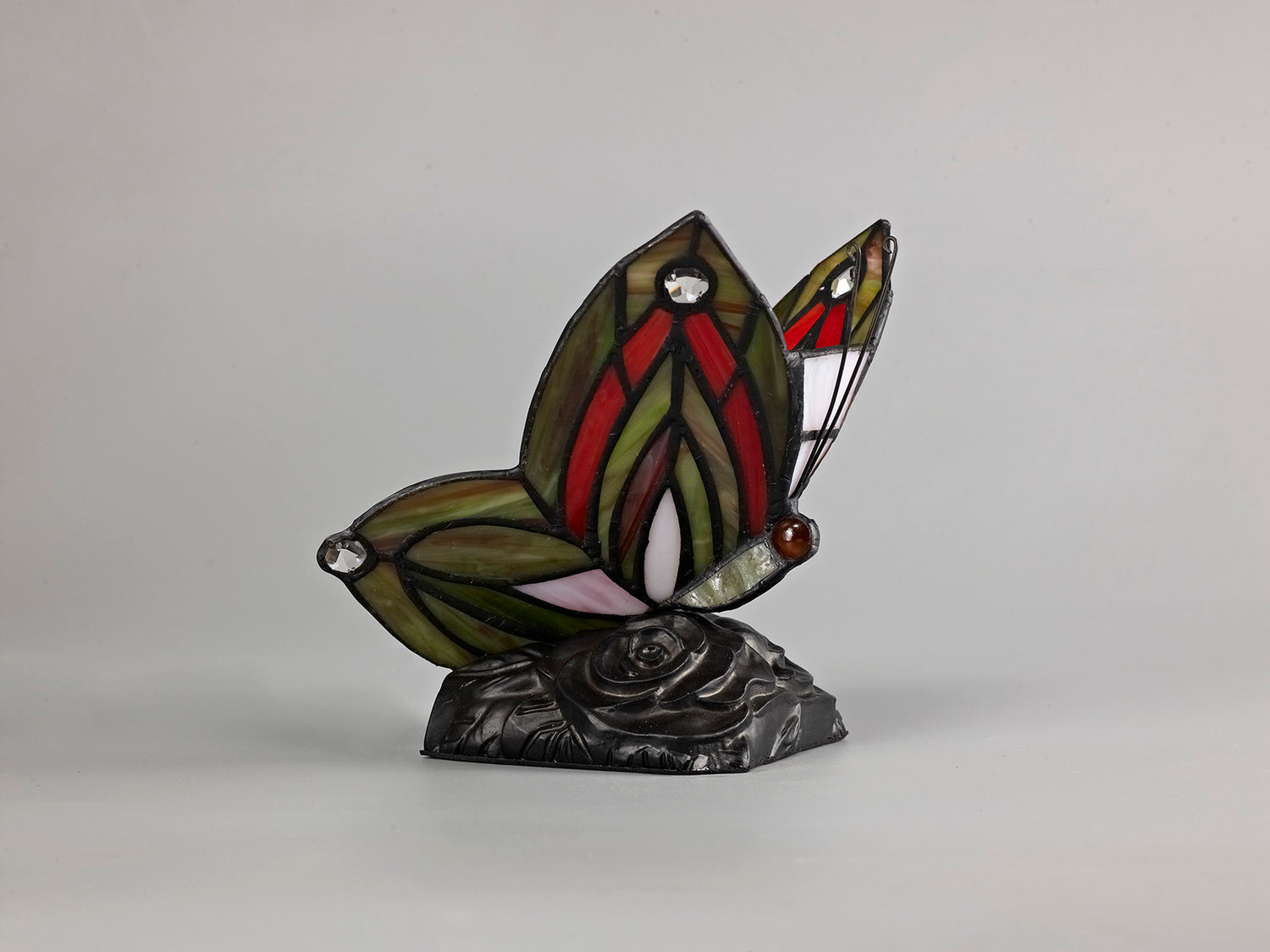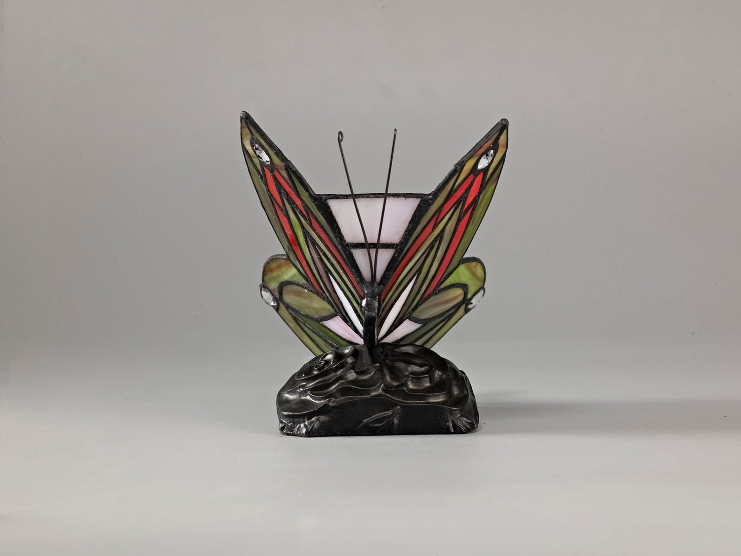 This stunning collection of traditional butterfly table lamps are available in multiple colours and wing shapes in natural reflection of the living creatures. Created from classic Tiffany glass shapes and patterns the colours available range from soft pale blues and pinks to vivid reds and greens. The black textured mounts upon which the glass sits are the perfect, authentically raw base to emphasise the coloured glass. Mizor is both an enchanting ambient illumination and beautiful sculpture.