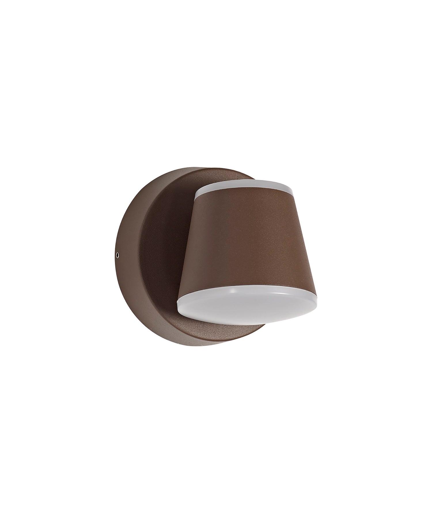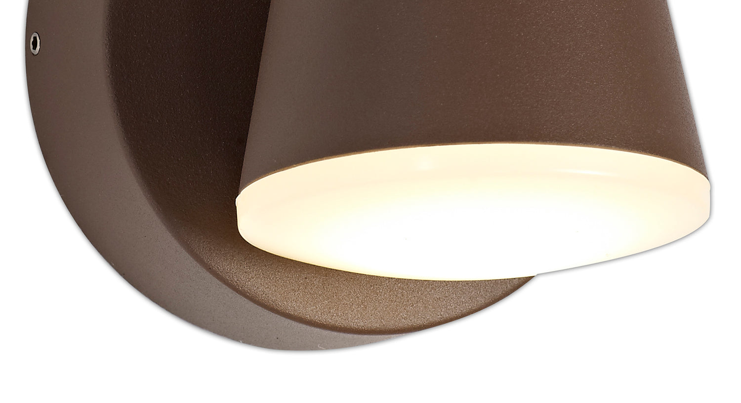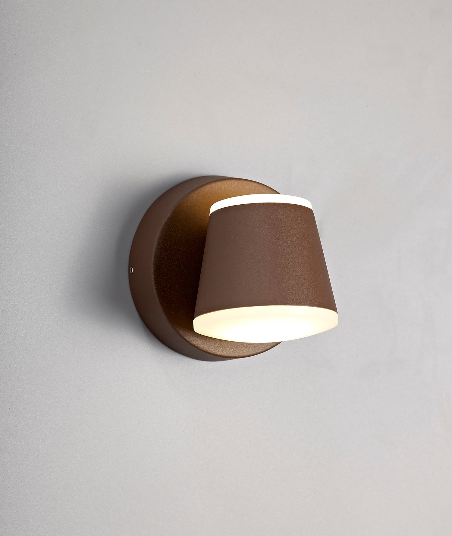 The Piautos 12W wall lamp is IP54 rated with an intriguing structure. The integral LED head is shaped to mimic a classic lampshade with the light filtered through both the bottom and top of the shade throwing light in two directions. A dark brown colour finish reflects natural woodland elements allowing the wall lamp to more seamlessly settle into a garden setting.