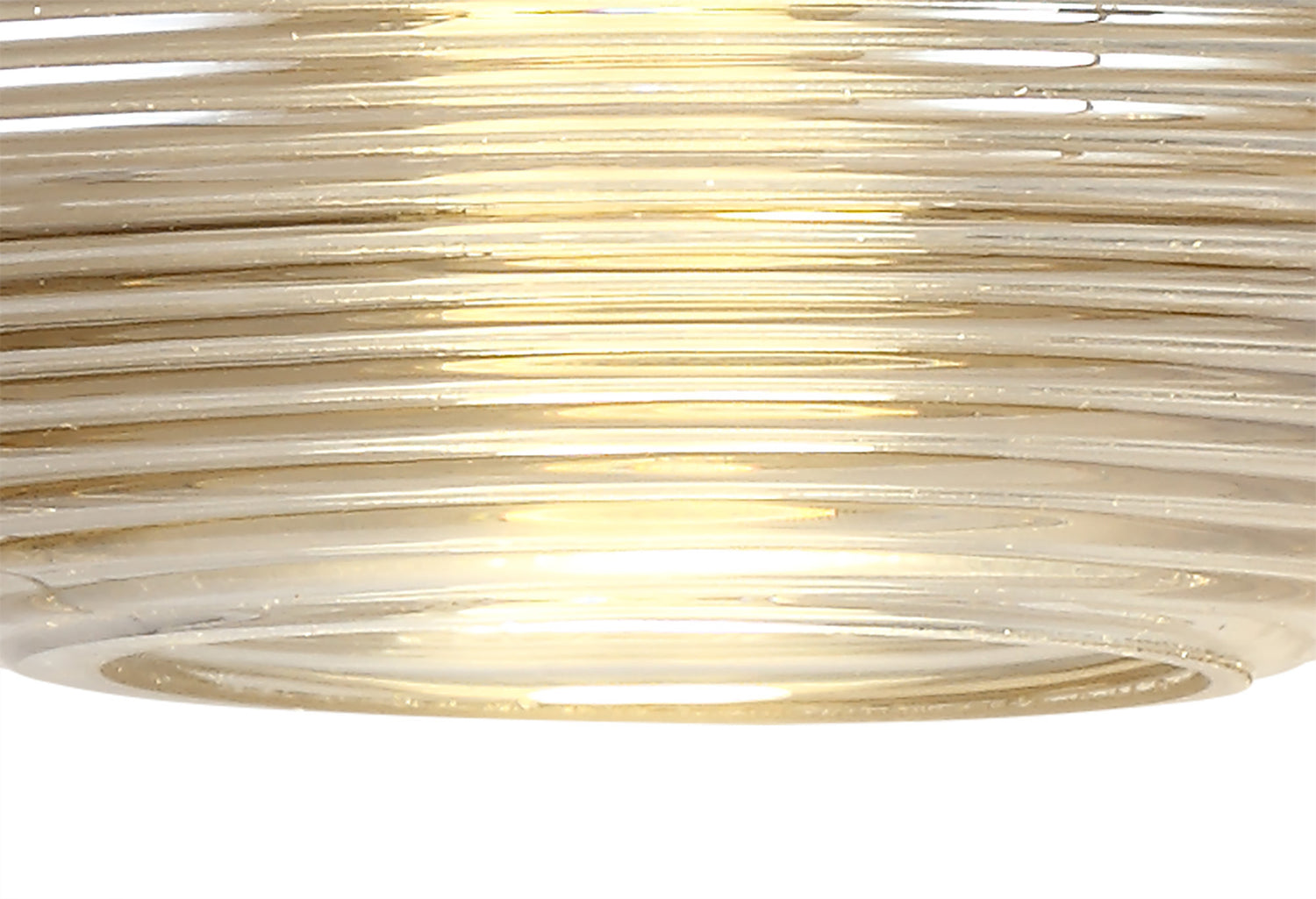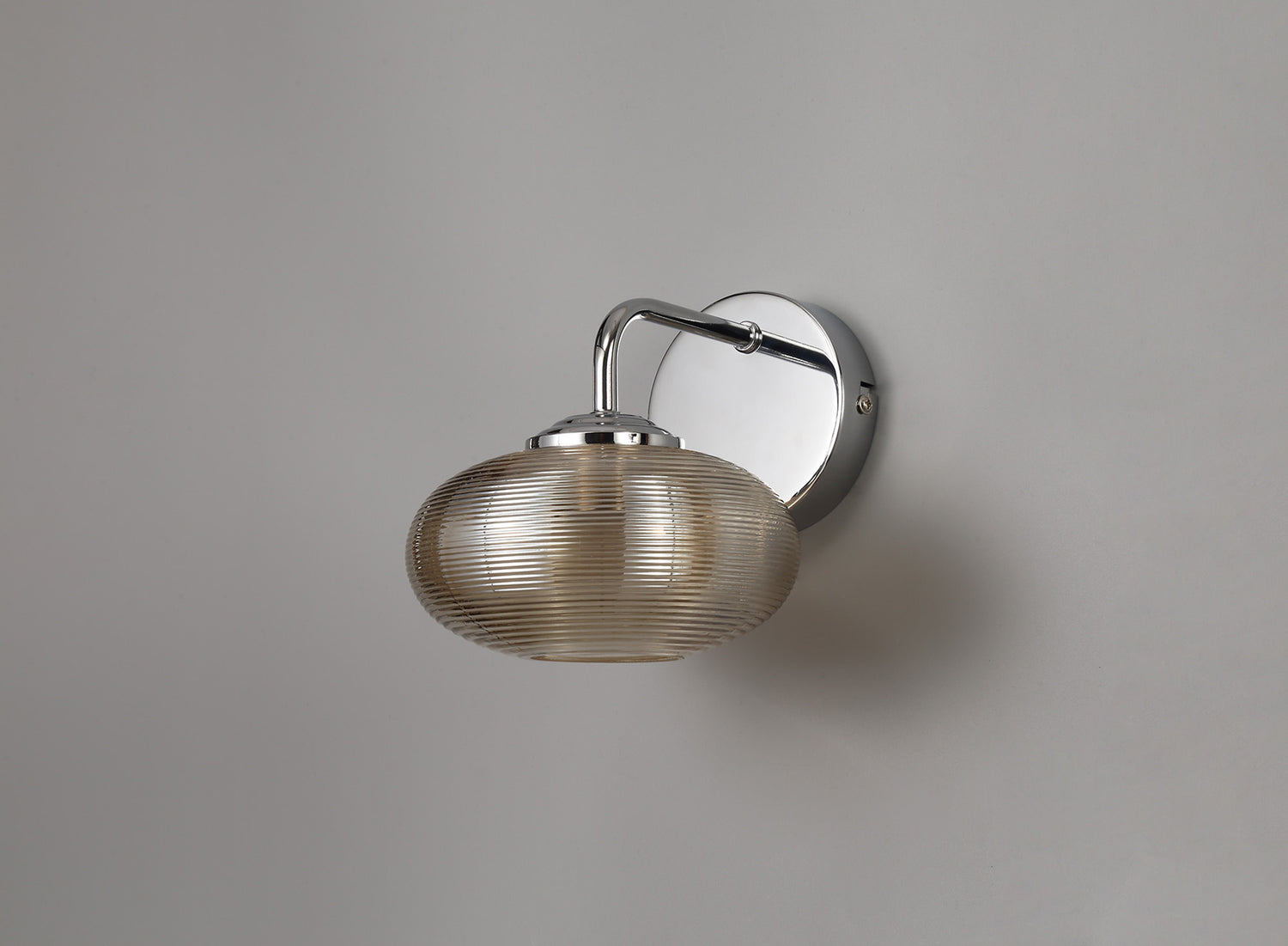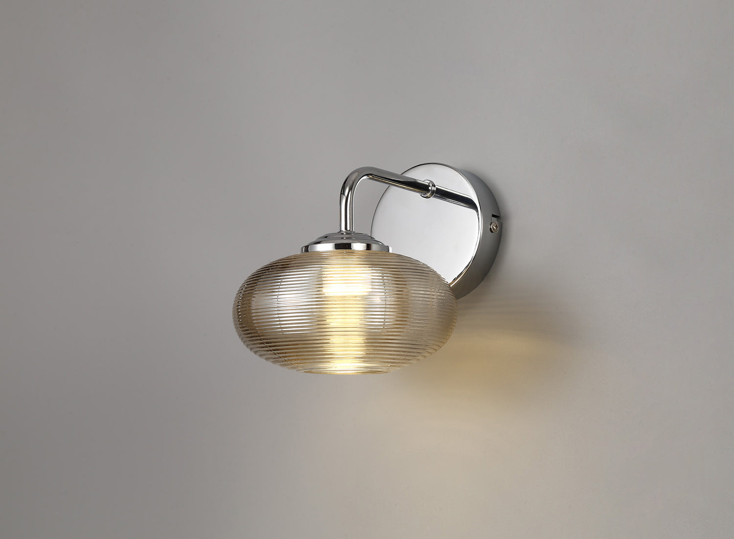 Rapeto's round three light multiple pendant is decorated with three glass in various colours; copper, champagne and smoked which each conceal the integral 4000K LEDs. The threaded effect on the prolate spheroid glass shape, emits a three dimensional pattern to further enrich the striking impact of the design. The switched, single LED wall lamps with matching polished chrome frames are available in with one of the three coloured glass on the pendant so a theme can be built around the preferred coloured glass.