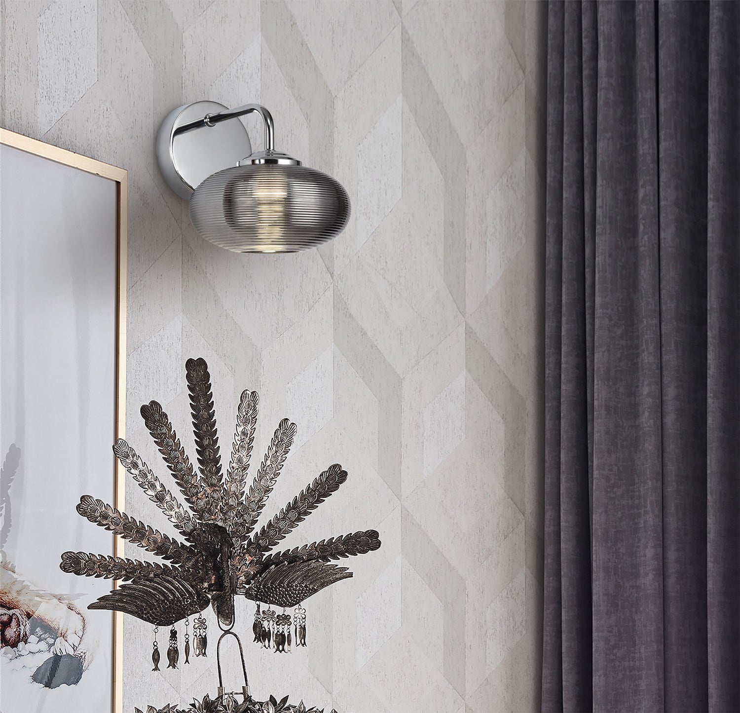 Rapeto's round three light multiple pendant is decorated with three glass in various colours; copper, champagne and smoked which each conceal the integral 4000K LEDs. The threaded effect on the prolate spheroid glass shape, emits a three dimensional pattern to further enrich the striking impact of the design. The switched, single LED wall lamps with matching polished chrome frames are available in with one of the three coloured glass on the pendant so a theme can be built around the preferred coloured glass.