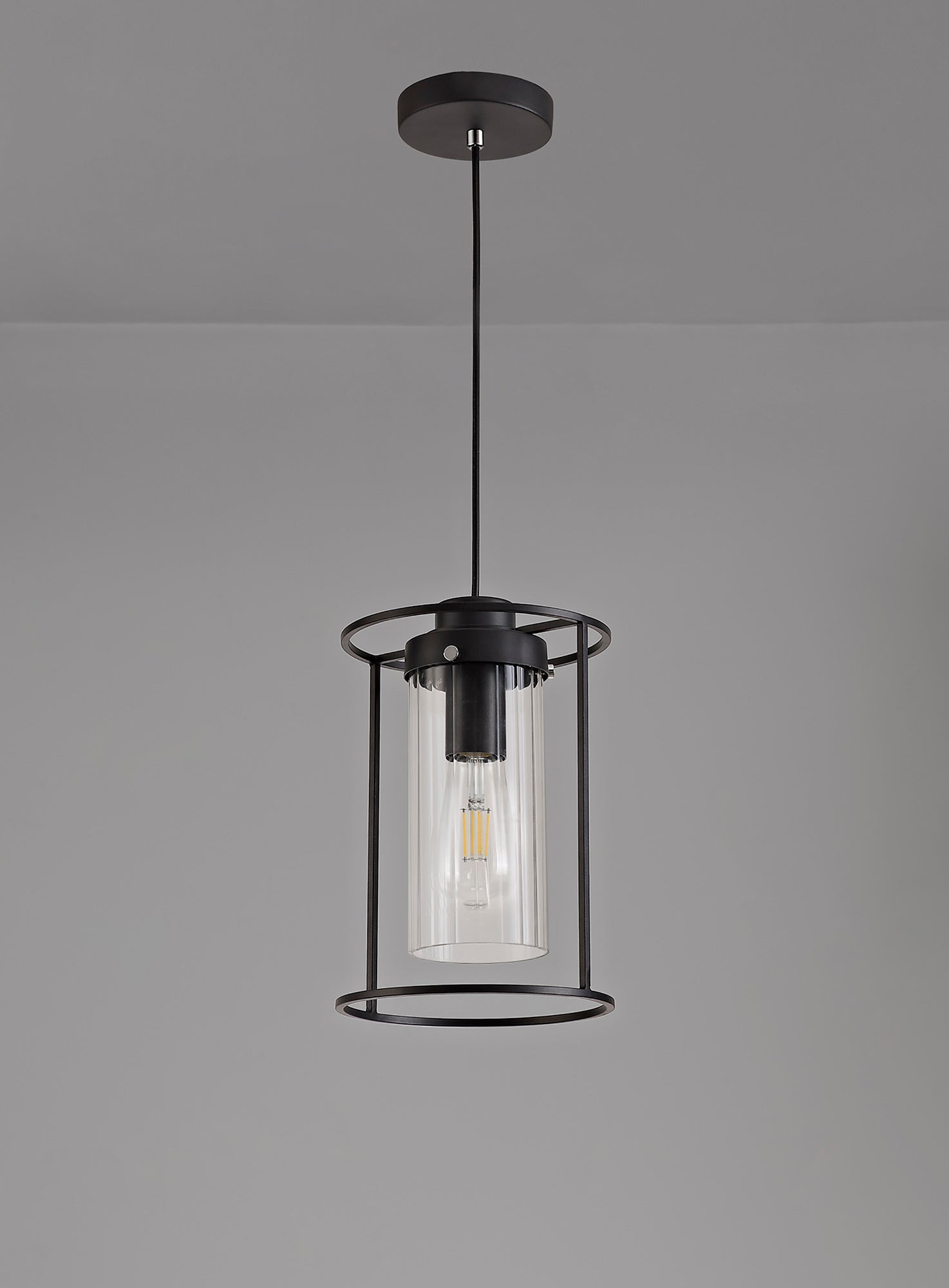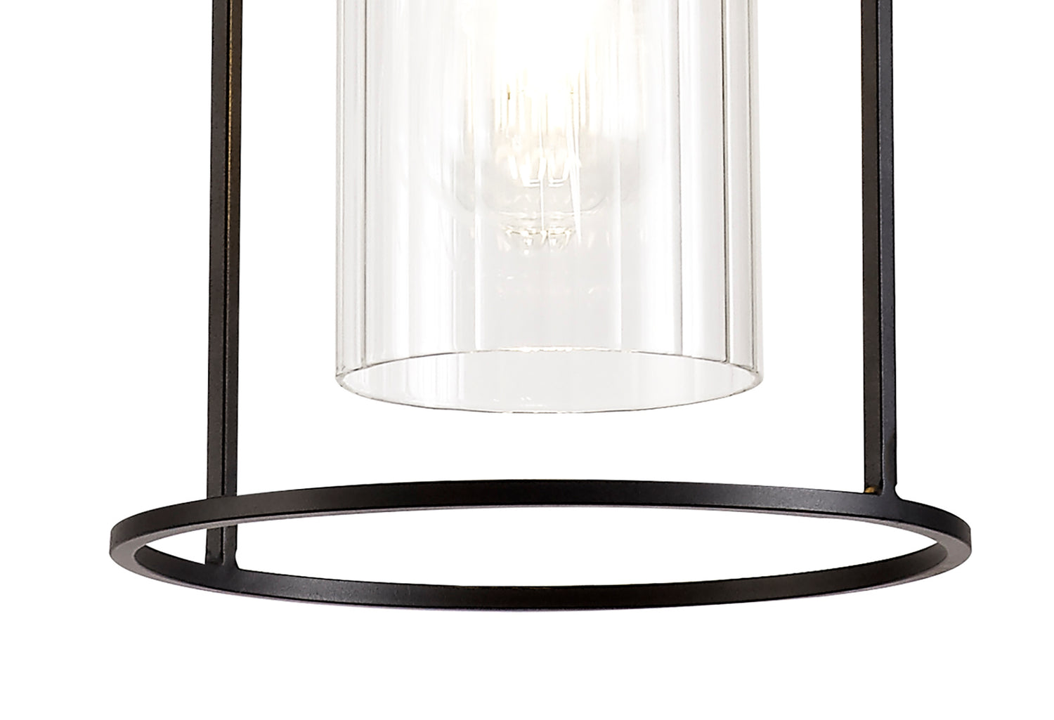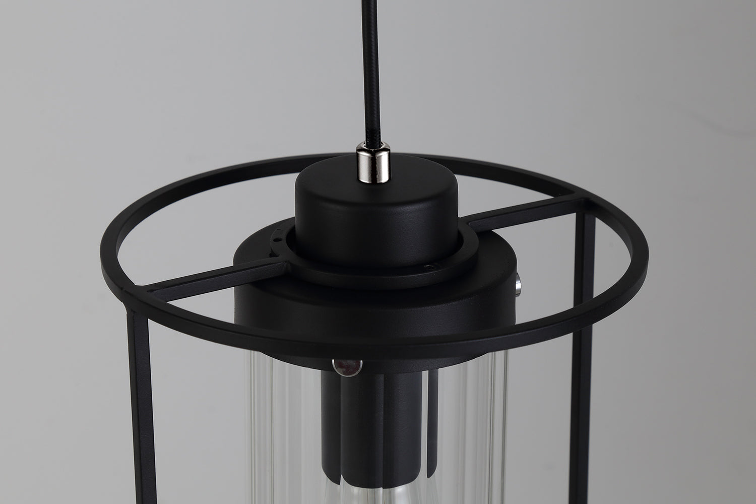Reith is a complete collection including a linear three light pendant and singular one light pendant, with matching wall and table lamps available. The subtle line effect moulded into the glass cylinders, which sit around the E27 lampholders, give the impression of caging around the lamp enhancing the minimalistic design of the slim black framework.