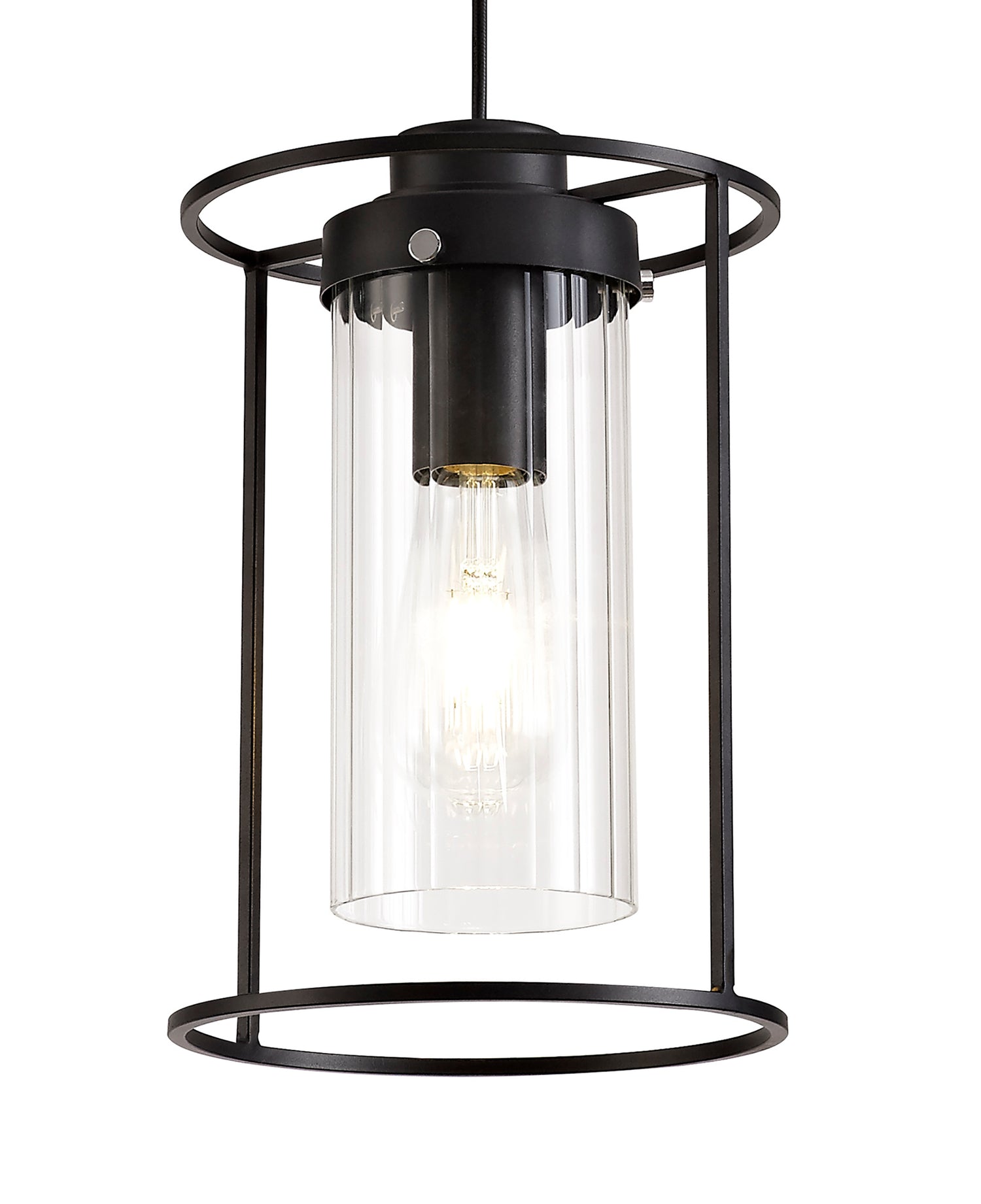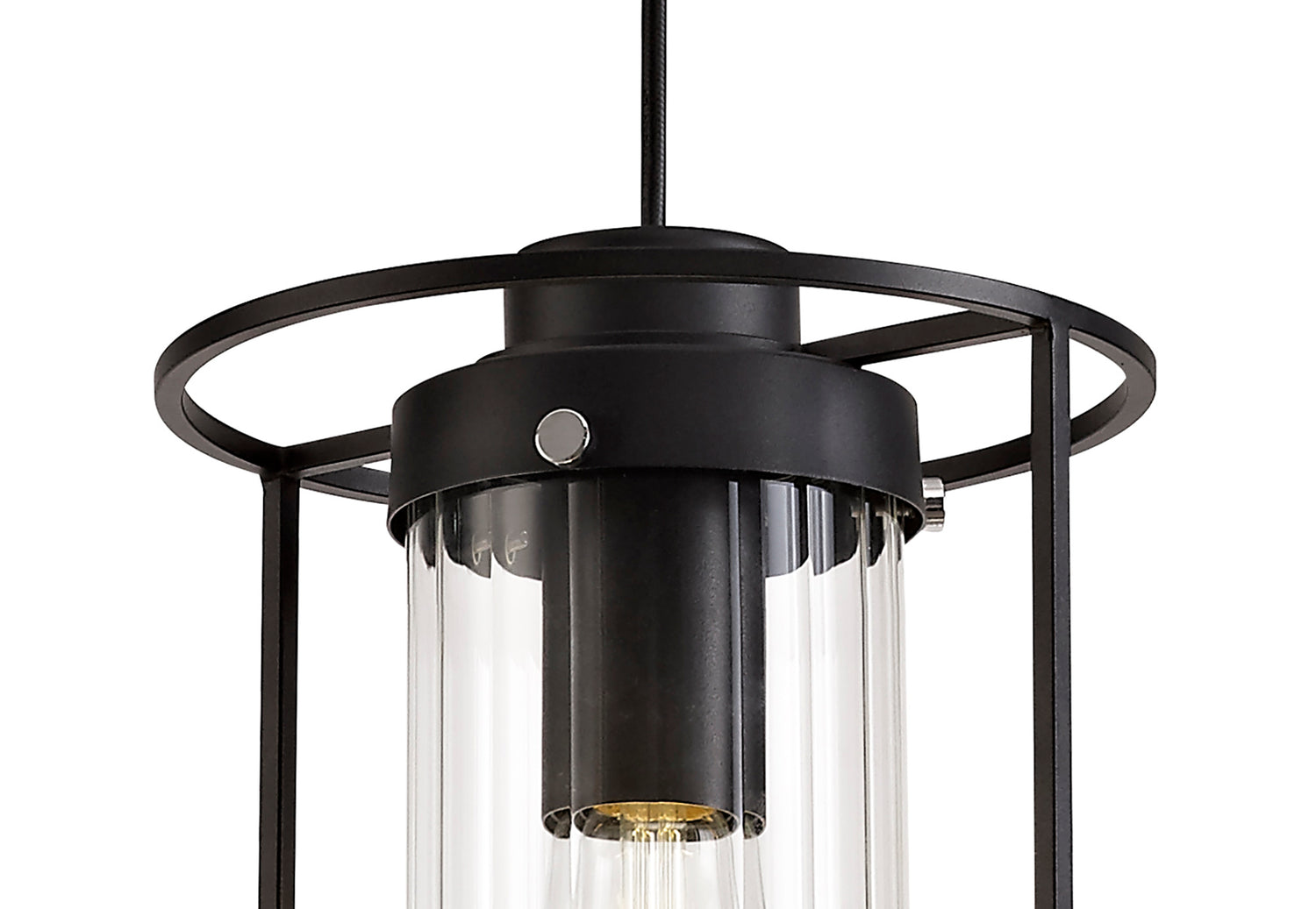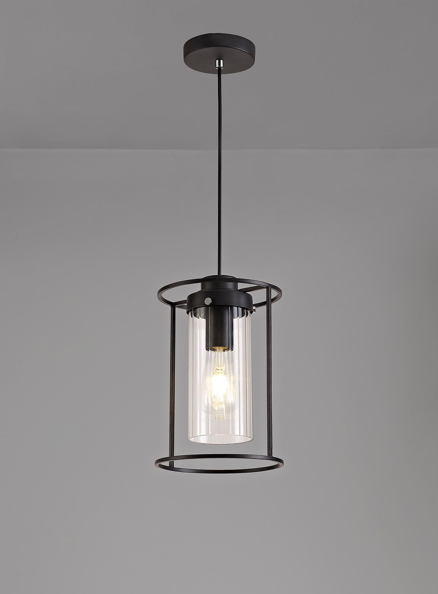 Reith is a complete collection including a linear three light pendant and singular one light pendant, with matching wall and table lamps available. The subtle line effect moulded into the glass cylinders, which sit around the E27 lampholders, give the impression of caging around the lamp enhancing the minimalistic design of the slim black framework.