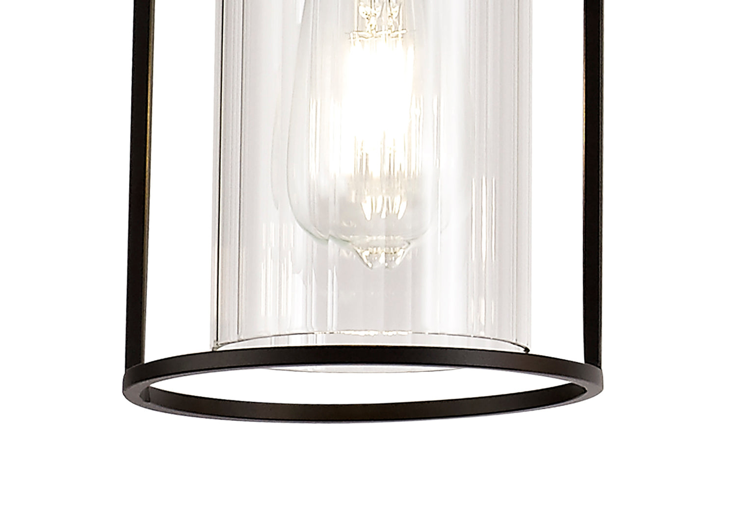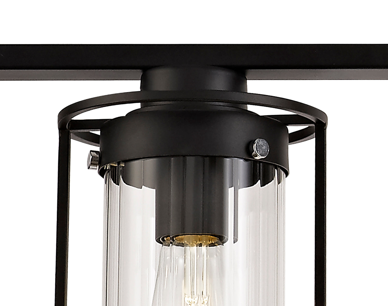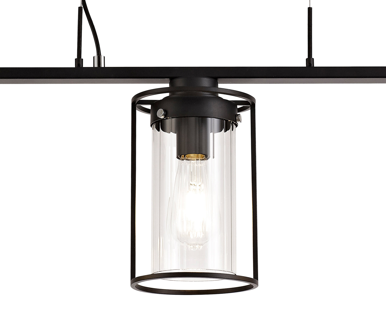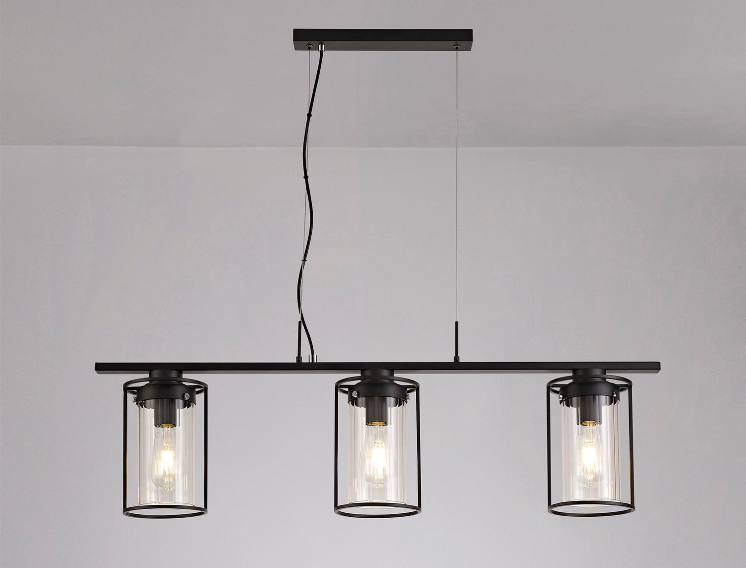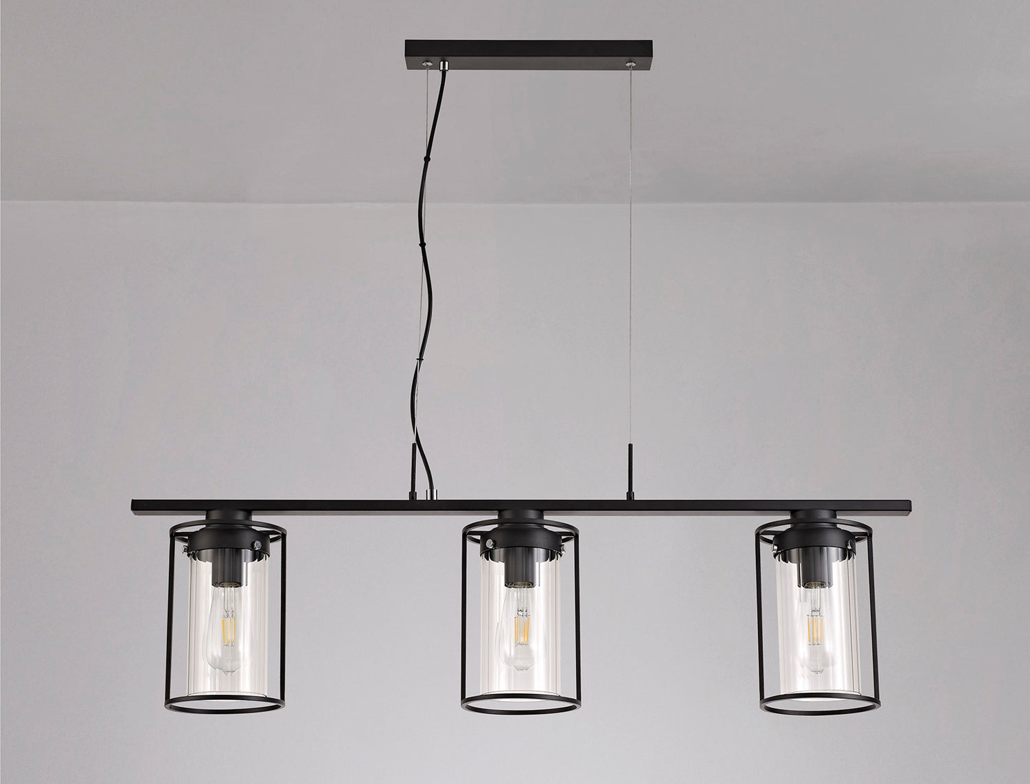 Reith is a complete collection including a linear three light pendant and singular one light pendant, with matching wall and table lamps available. The subtle line effect moulded into the glass cylinders, which sit around the E27 lampholders, give the impression of caging around the lamp enhancing the minimalistic design of the slim black framework.