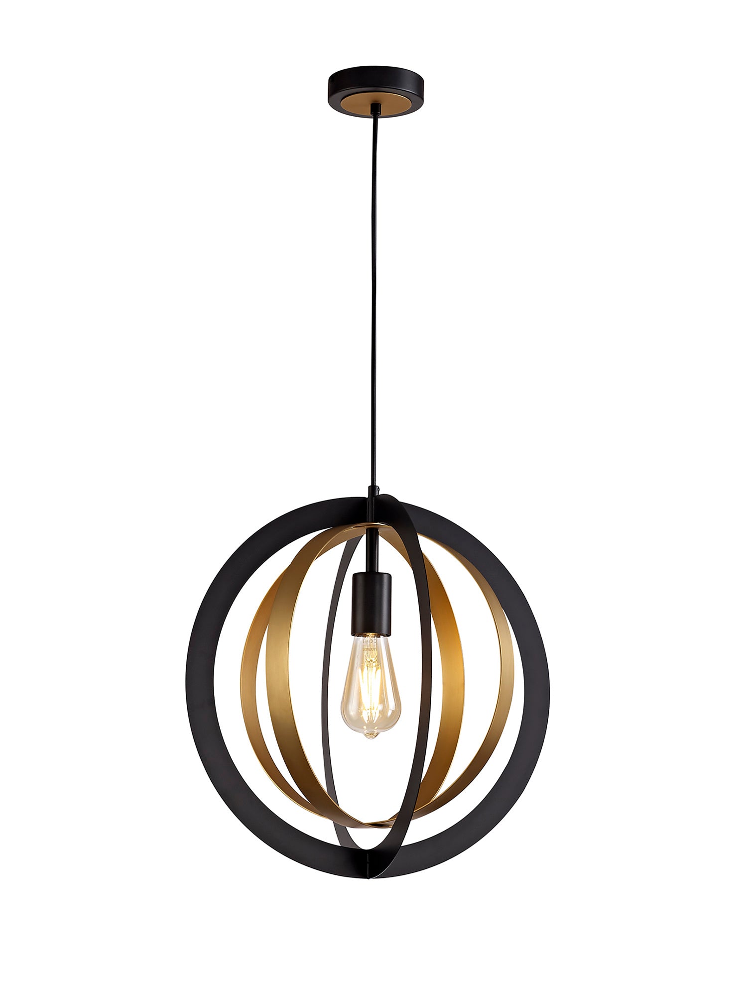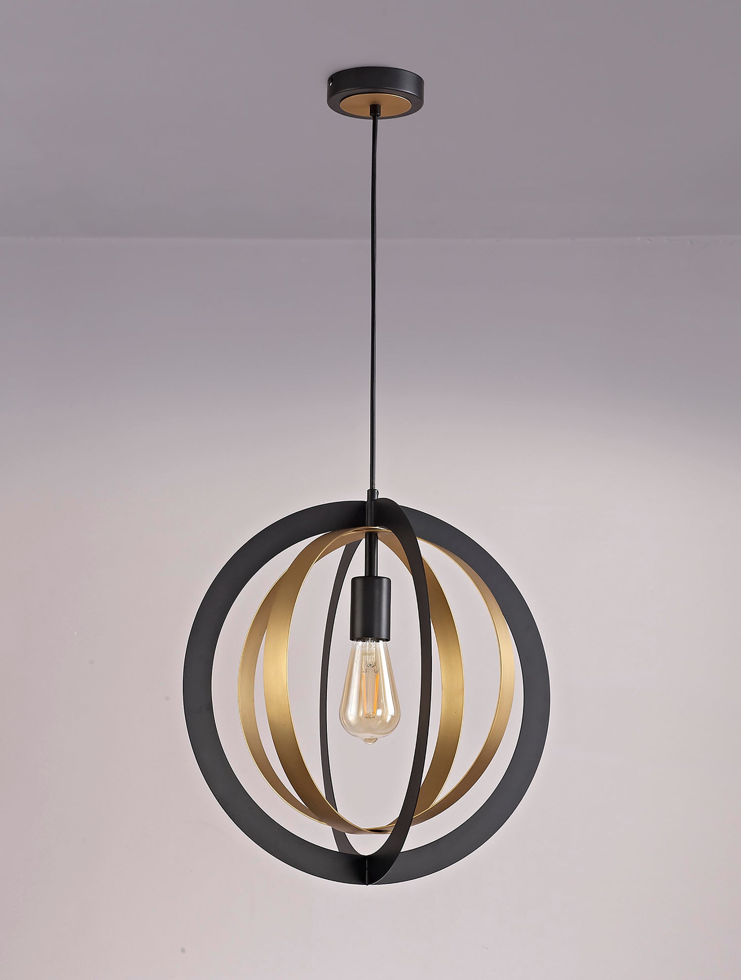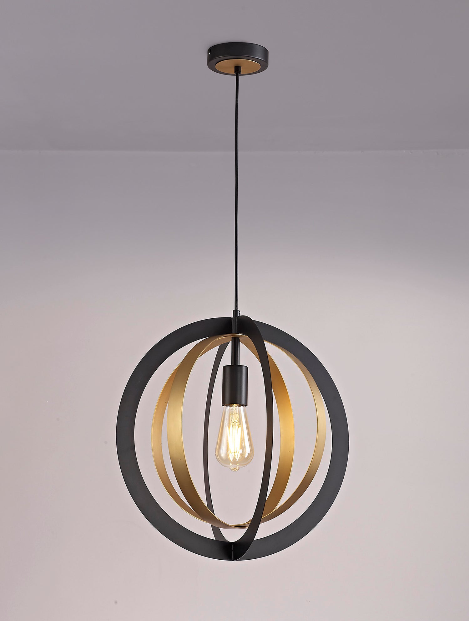 This lone adjustable pendant is most suitable for use in a traditional setting with its rustic combination of black and satin gold colour finishes. The two larger black rings outline the frame whilst the smaller satin gold rings overlap within the centre to project an orbital illusion surrounding the E27 lampholder. Rigel's creativity of design also gives the fitting the versatility to be situated in more modern or urban room décor as well as in more classical settings.