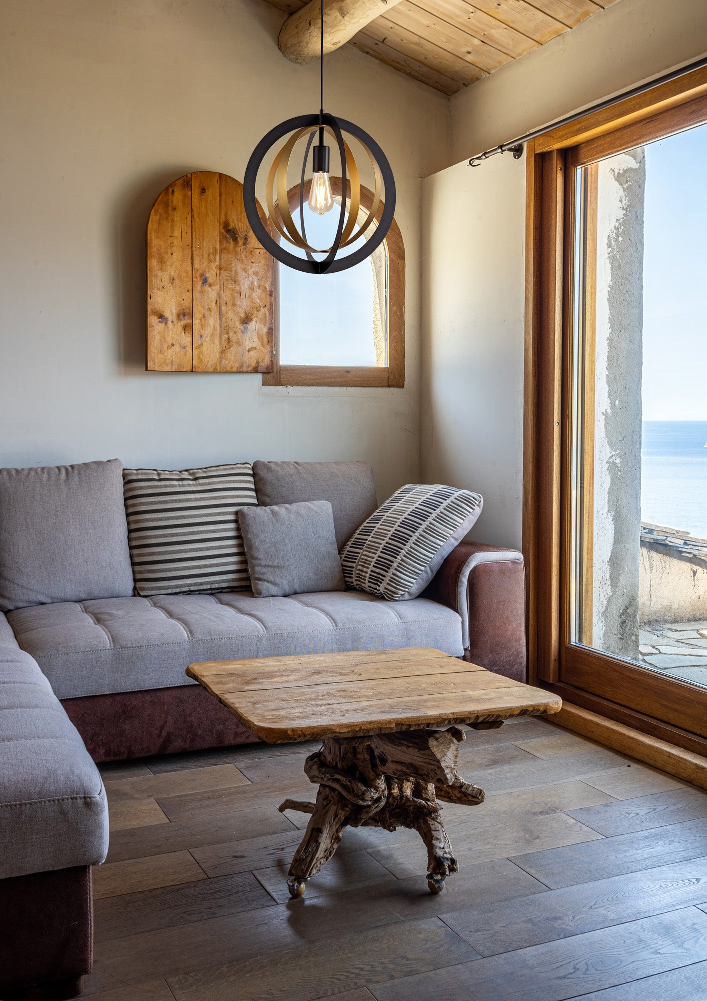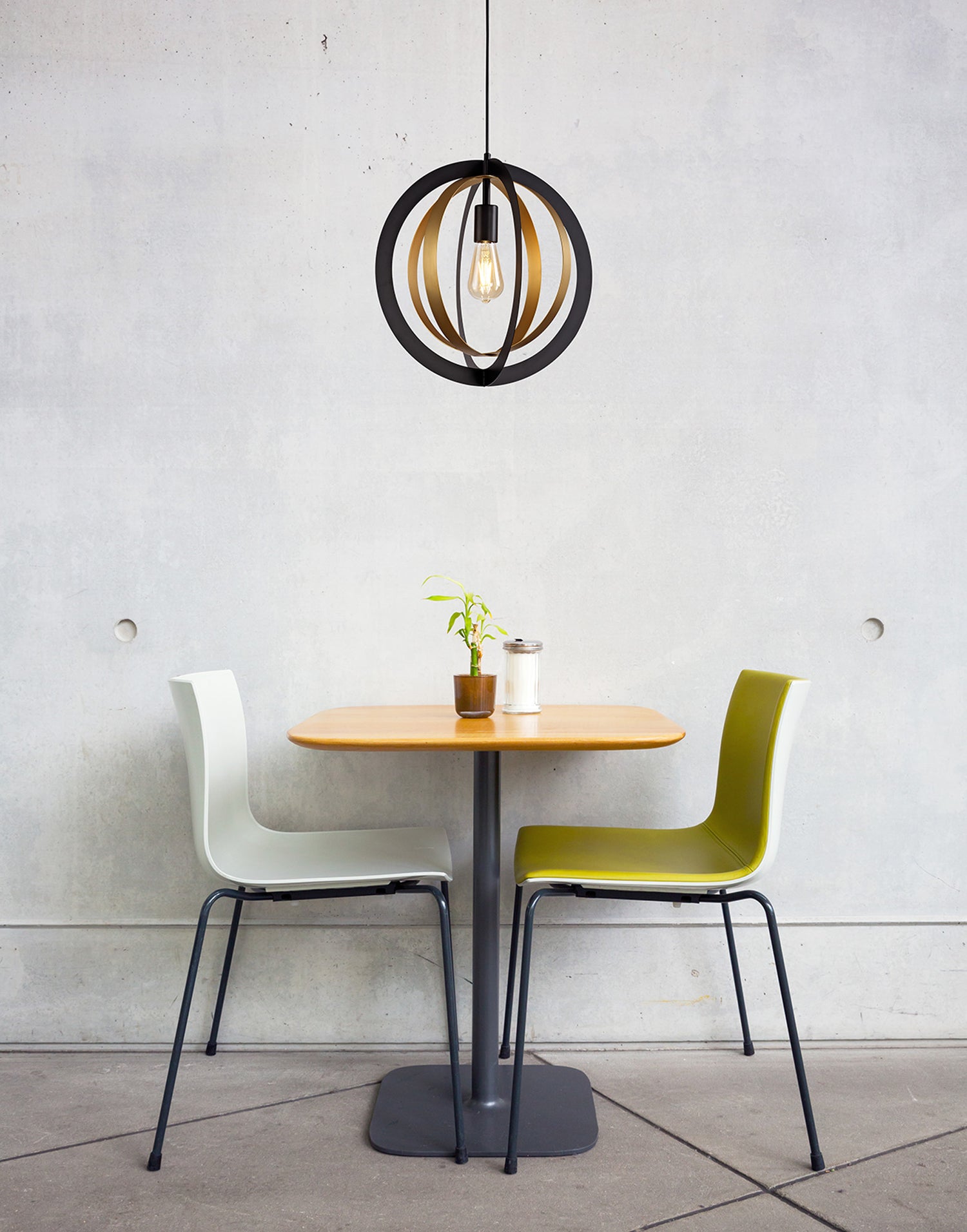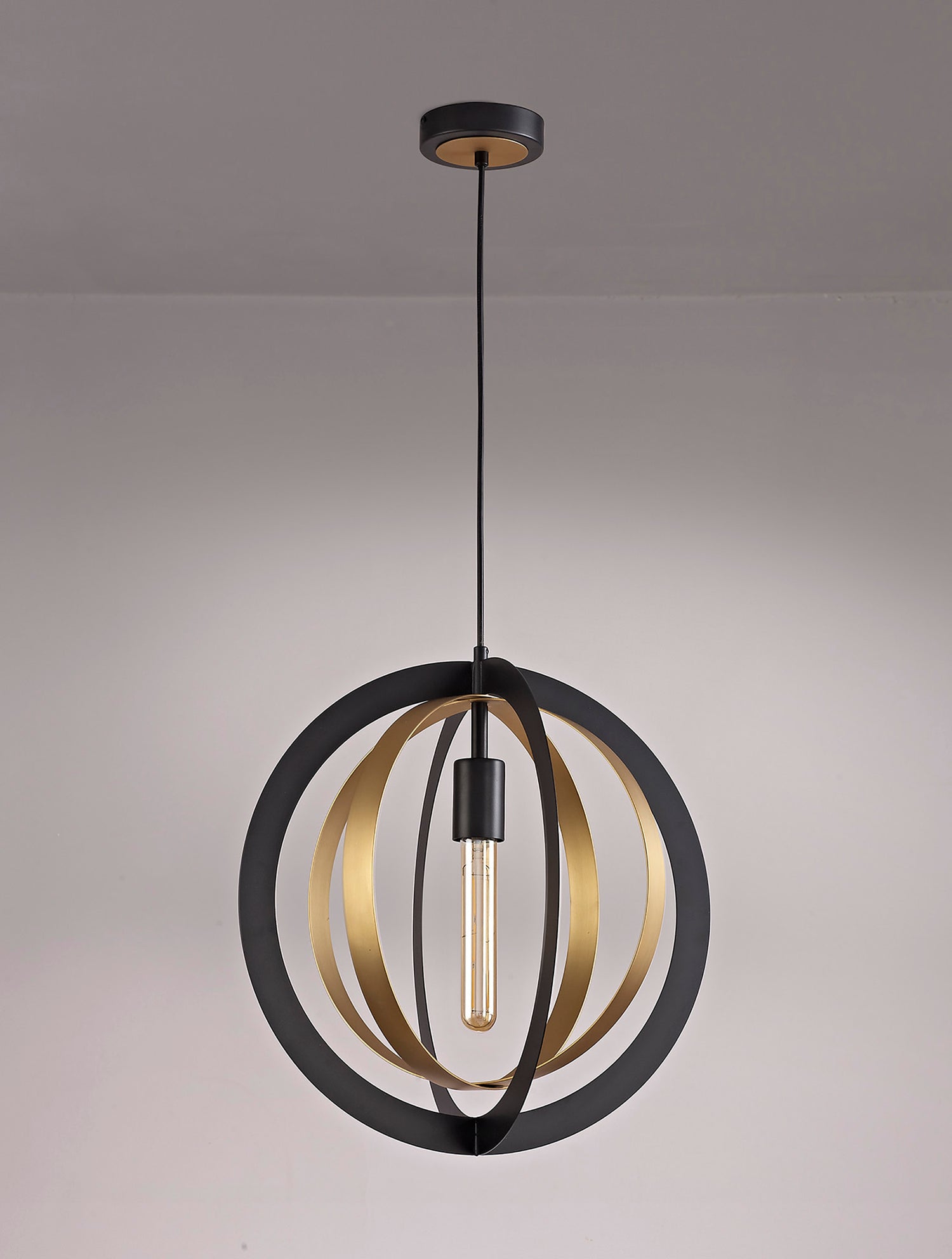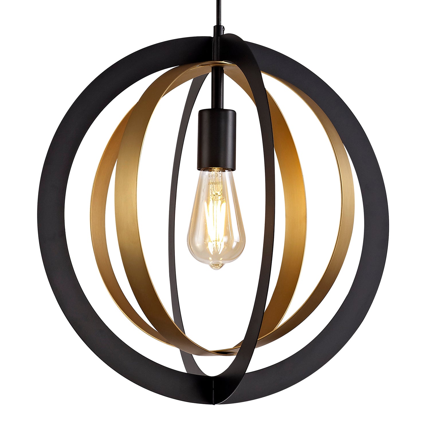 This lone adjustable pendant is most suitable for use in a traditional setting with its rustic combination of black and satin gold colour finishes. The two larger black rings outline the frame whilst the smaller satin gold rings overlap within the centre to project an orbital illusion surrounding the E27 lampholder. Rigel's creativity of design also gives the fitting the versatility to be situated in more modern or urban room décor as well as in more classical settings.