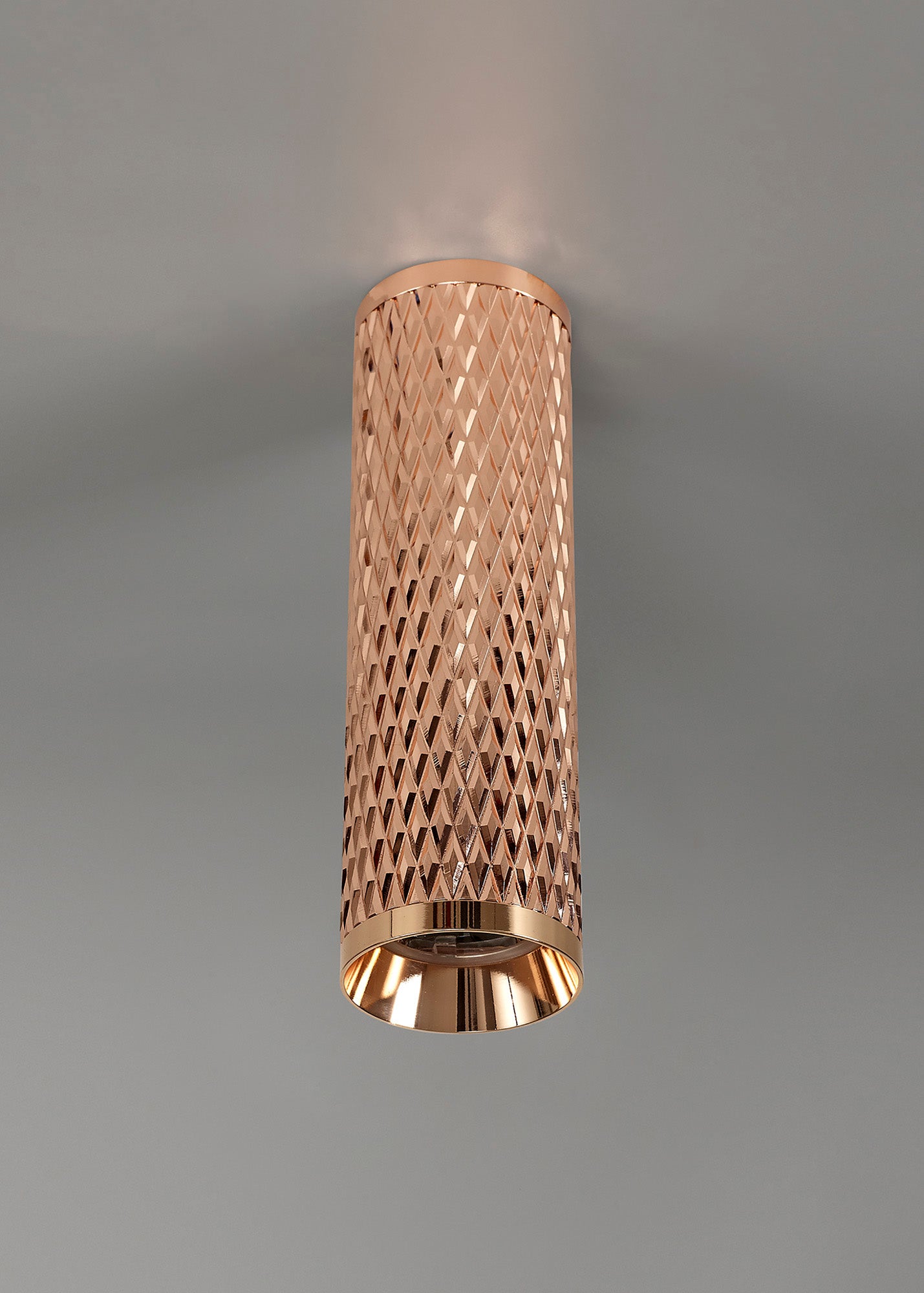 The cylindrical format of the Sadal range is decorated with a diamond imprint producing a mesh like effect. These light fittings are available as a surface mounted ceiling fitting, wall lamps, track spotlight or surface mounted adjustable spotlight. The wide variety of colour finishes available, complementing face ring accessories and the pendant kit offers a greater number of lighting solutions for all kinds of room settings and applications.