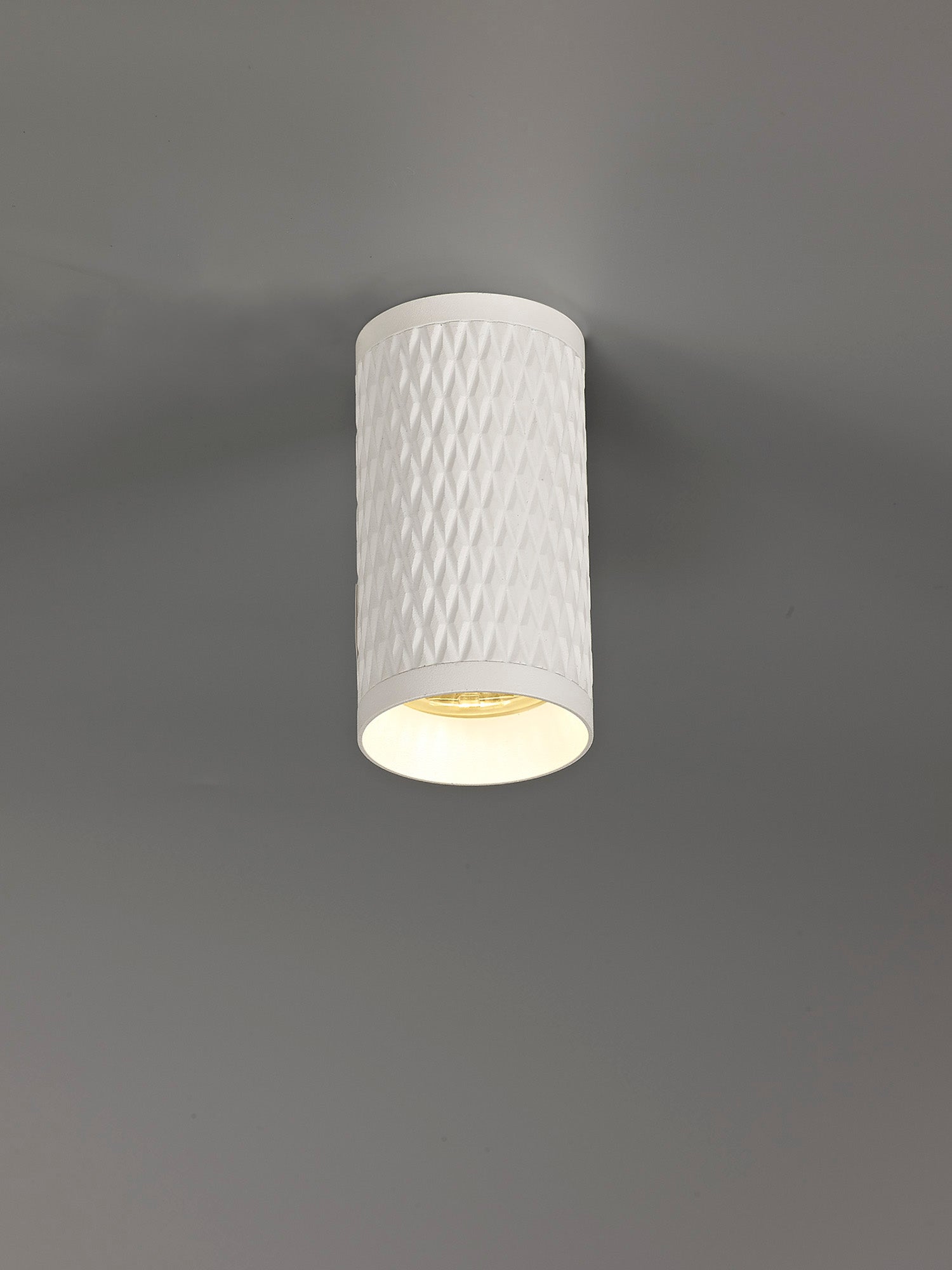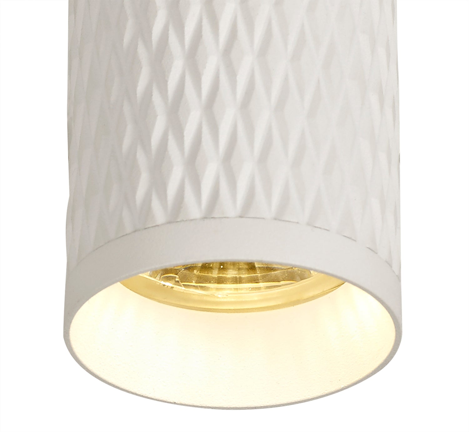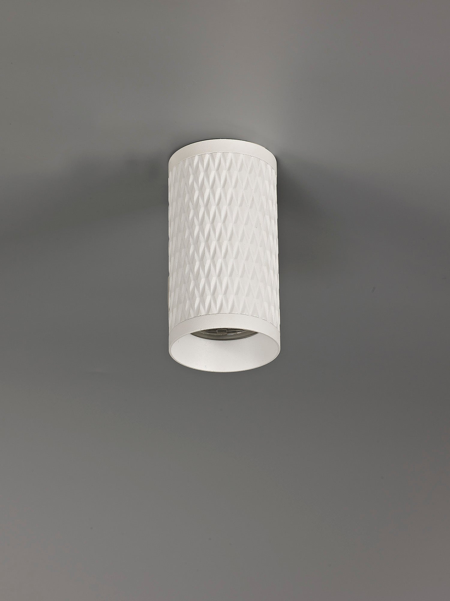 The cylindrical format of the Sadal range is decorated with a diamond imprint producing a mesh like effect. These light fittings are available as a surface mounted ceiling fitting, wall lamps, track spotlight or surface mounted adjustable spotlight. The wide variety of colour finishes available, complementing face ring accessories and the pendant kit offers a greater number of lighting solutions for all kinds of room settings and applications.